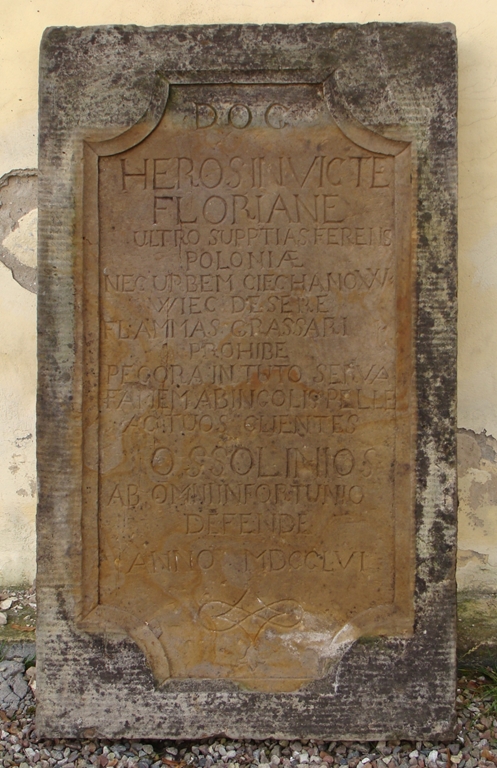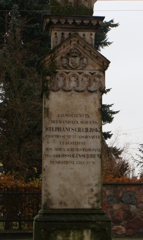 Wracając do Ciechanowca i Świętego Floriana, to każdy z nas przychodząc przez Plac Ks. Krzysztofa Kluka w Ciechanowcu może zauważyć okazała, kamienną figurę św. Floriana umieszczoną na piaskowcowym cokole. Z inskrypcji łacińskiej umieszczonej na pomniku możemy dowiedzieć się, że w 1849 r. niejaki Stefan Ciecierski – właściciel Ciechanowca, odnowił pomnik św. Floriana, ufundowany przez Ossolińskich w XVIII wieku. Dodatkowo dowiadujemy się, że Ciecierski ufundował nowy cokół pomnika, oczywiście opatrzony własnym herbem Rawicz. Ten niepozorny napis jest jedynym znanym źródłem wspominającym o fundacji pierwszego pomnika św. Floriana przez Ossolińskich.