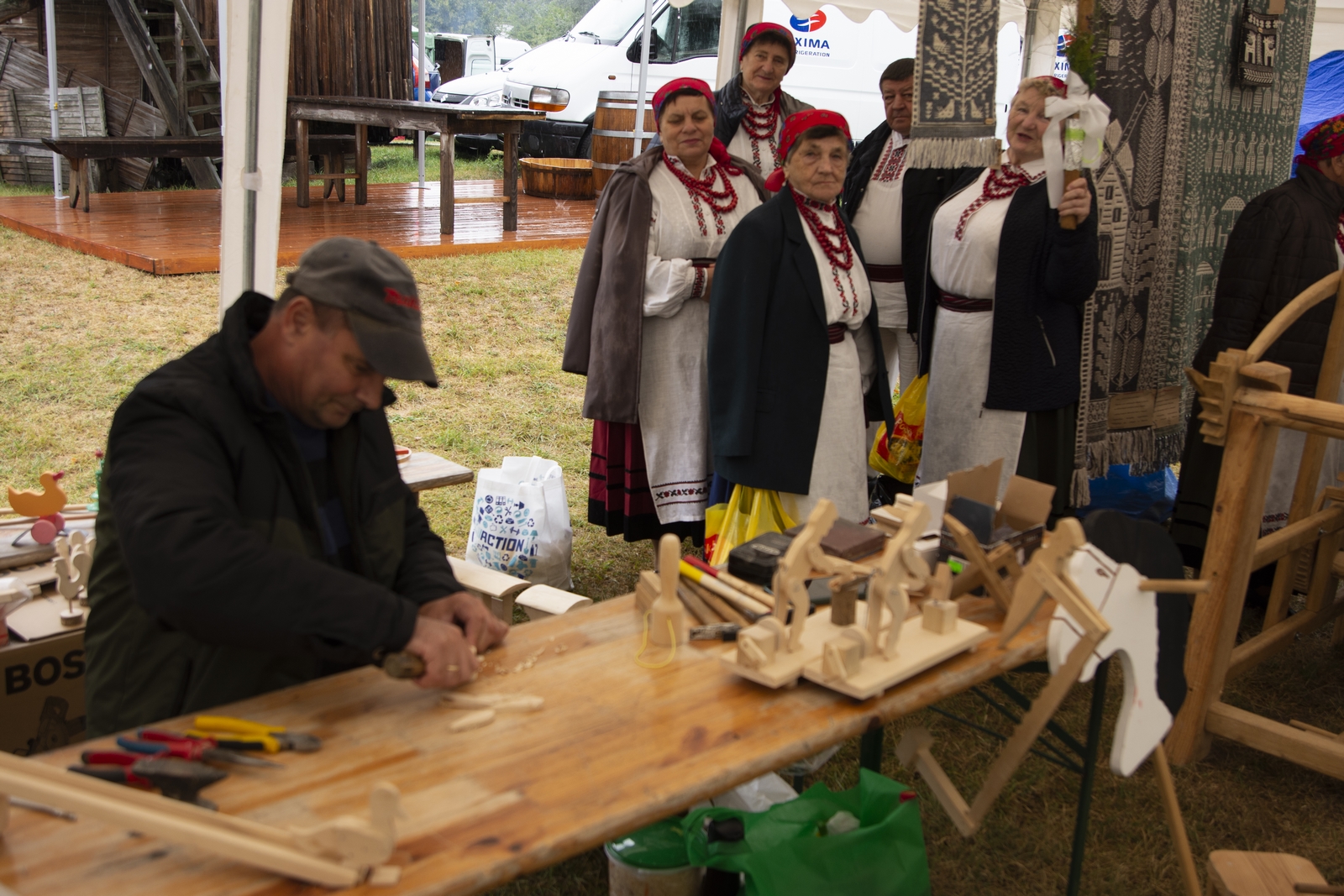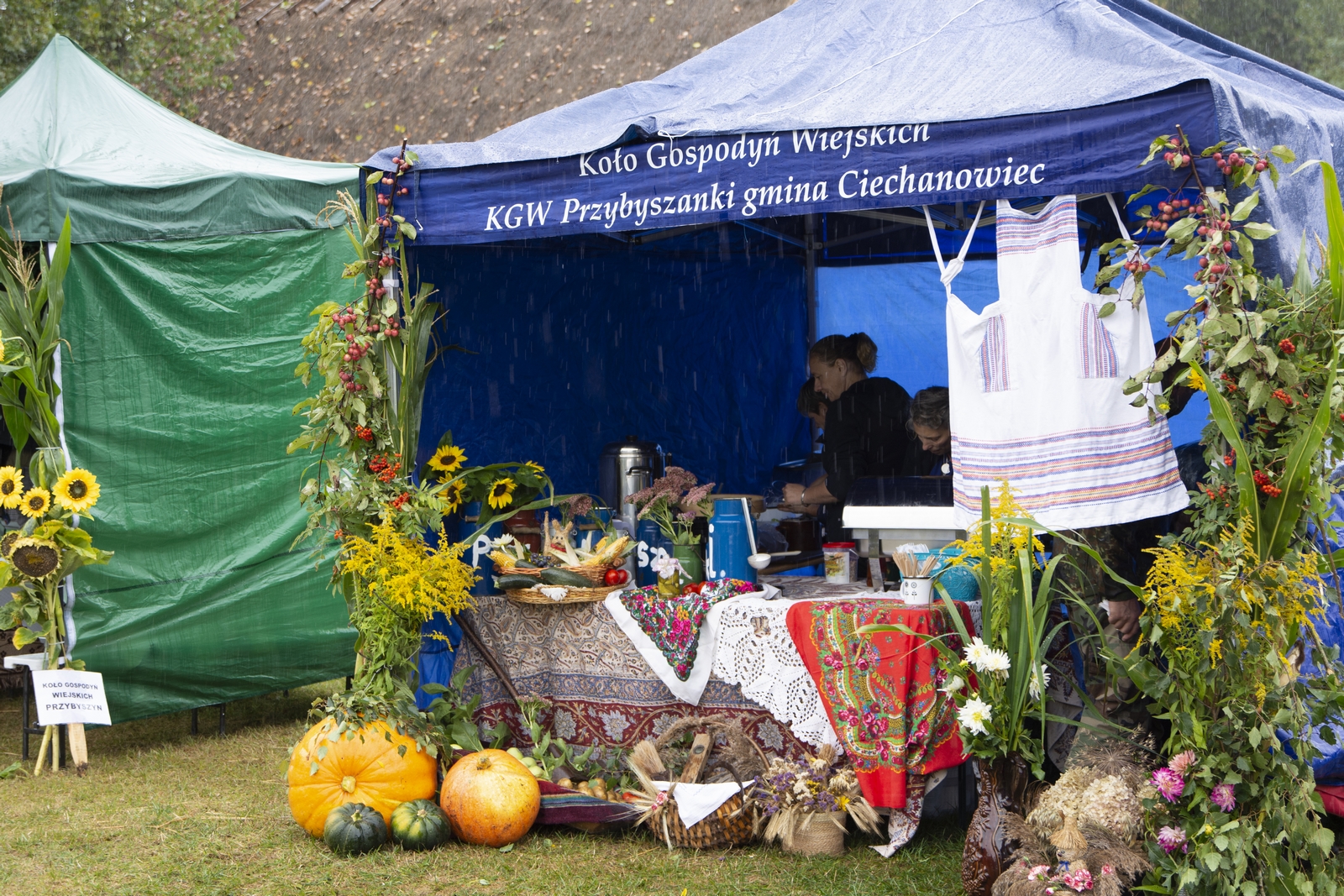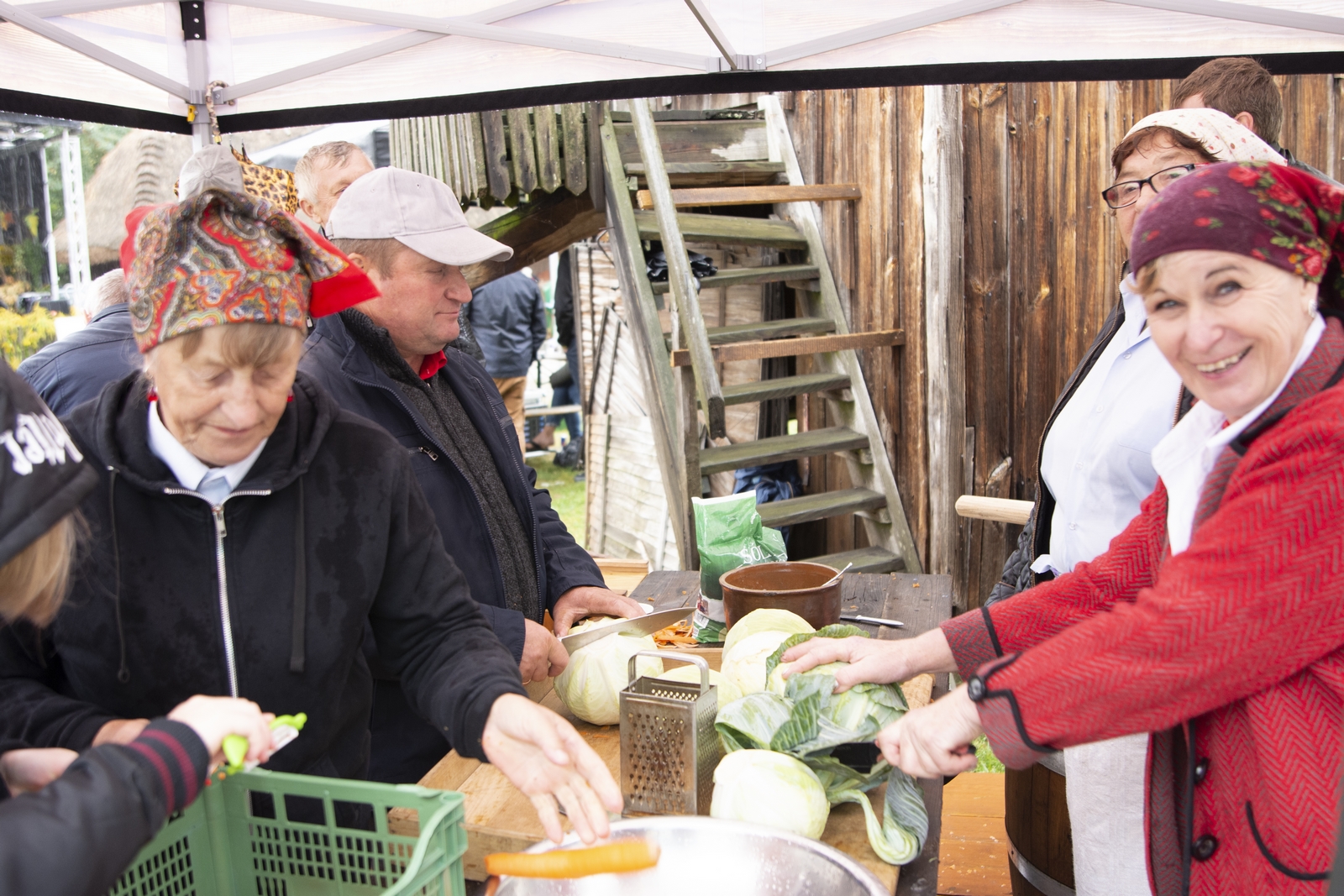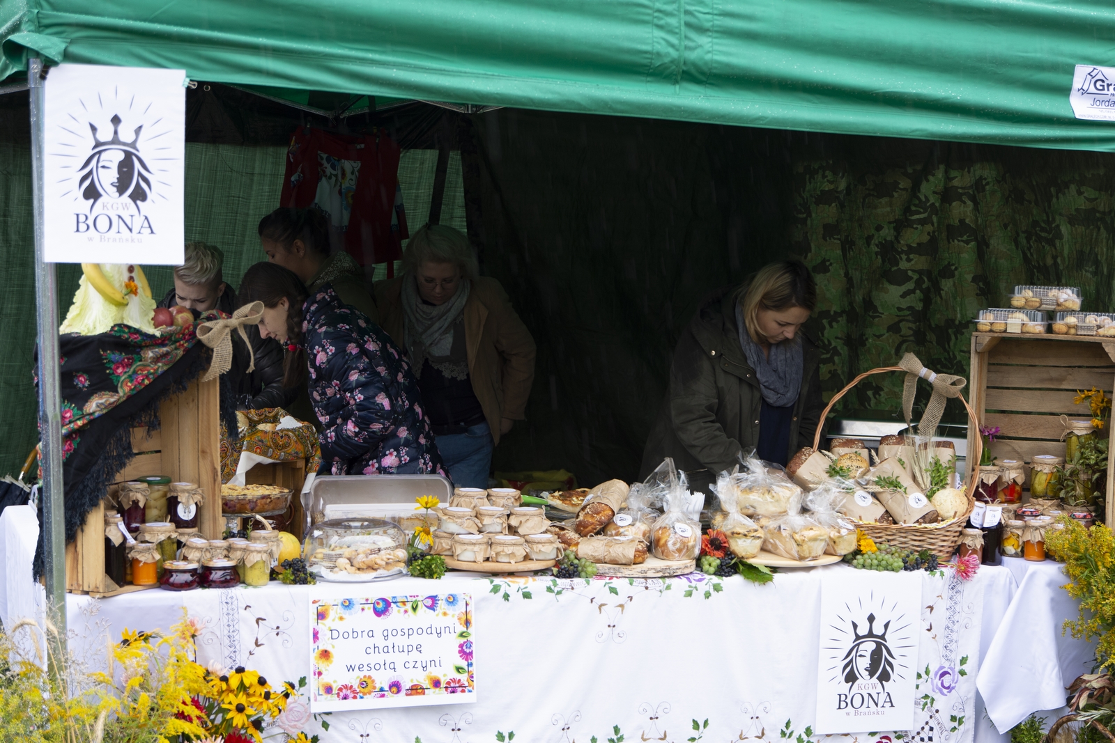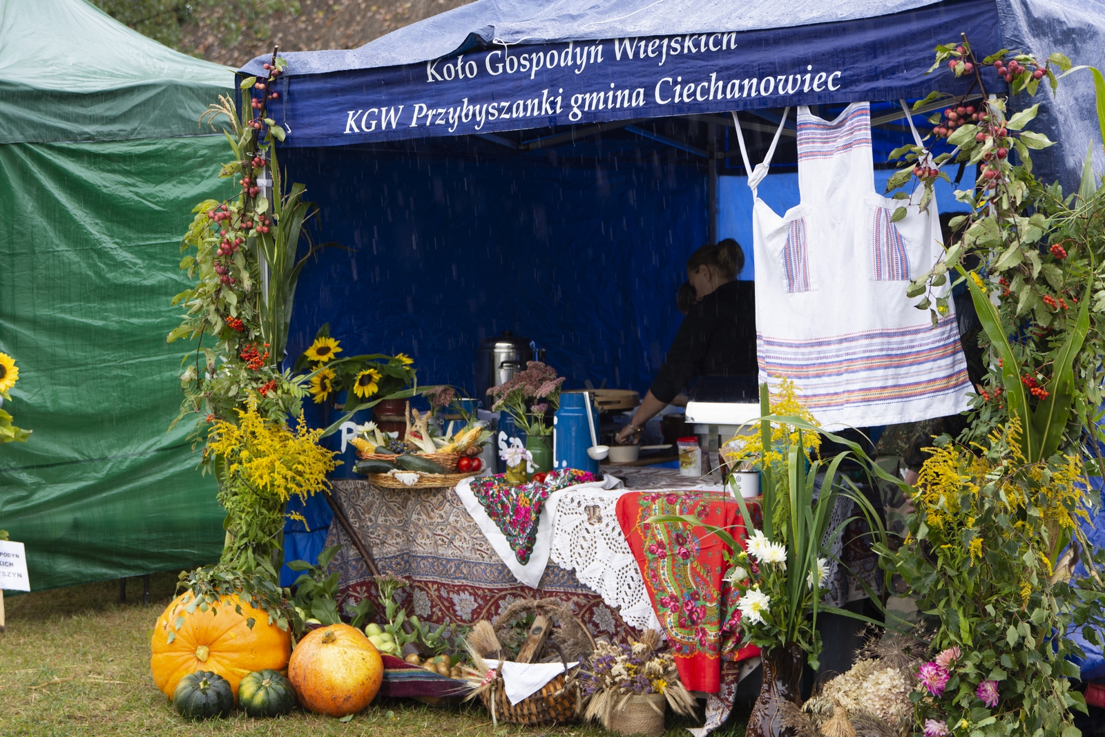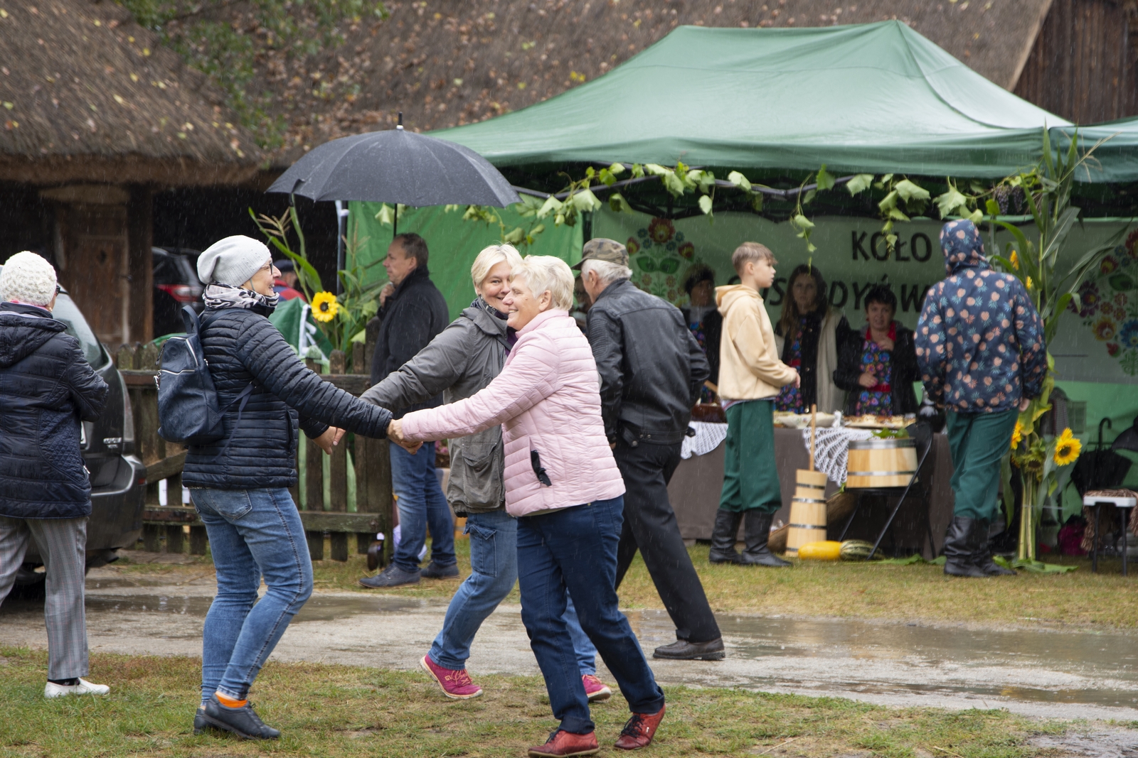 Prezentowaliśmy również pracę sprawnych technicznie zabytkowych ciągników, lokomobil i silników stacjonarnych ze zbiorów Muzeum. Odbyły się również pokazy tłoczenia soków ze świeżych owoców wraz z degustacją, przędzenie na kołowrotku, wyciskanie oleju z siemienia lnianego, wyrób świec woskowych, pokaz tkacki – wytwarzanie dywanów dwuosnowowych, wyplatanie koszy z wikliny, wykonywanie ligawki mazowiecko-podlaskiej (tradycyjnego rogu pasterskiego), wyrób drewnianej zabawki ludowej, pokaz wykonywania krajki, jak również demonstracja pracy garncarza. W zakresie promocji kulinarnej Podlasia przyrządziliśmy – krupnik, zupę ogórkową i placki ziemniaczane. Gospodynie z Kół Gospodyń Wiejskich rywalizowały w konkursie na najciekawsze stoisko promujące tradycyjne potrawy regionalne. Jury konkursu stwierdziło bardzo wysoki poziom prezentacji. Nagrodami rzeczowymi uhonorowano wszystkie Koła zgłoszone do konkursu. Najmłodsi uczestnicy festynu uczestniczyli w konkursie plastycznym pn. ,,Jesień w polu i zagrodzie’’. Przeprowadziliśmy też konkurs sprawnościowy dla najmłodszych - rzut ziemniakami do kosza. Dorośli zaś rywalizowali w konkursie obierania jabłek na szarlotkę (kobiety) i ziemniaków (mężczyźni). Na stoiskach partnerów zadania - instytucji działających w obszarach wiejskich, uczestnicy imprezy zapoznawali się z nowoczesnymi sposobami gospodarowania, możliwościami korzystania z programów pomocowych na rzecz wsi i zakresu ubezpieczeń społecznych rolników. Przy stoisku Zespołu Szkół Centrum Kształcenia Rolniczego w Rudce promowane były kierunki kształcenia w zakresie gastronomii, agroturystyki, ekologii i aktywne zachęcanie młodzieży do podjęcia nauki w danej szkole. Z kolei Stowarzyszenie ,,Zambrowski Produkty Lokalne’’ zorganizowało promocyjne stoisko z regionalnymi, ekologicznymi produktami rolnymi. Członkowie Stowarzyszenia promowali ekouprawę tradycyjnych warzyw i owoców, jak również dzielili się swoimi doświadczeniami z uczestnikami imprezy.