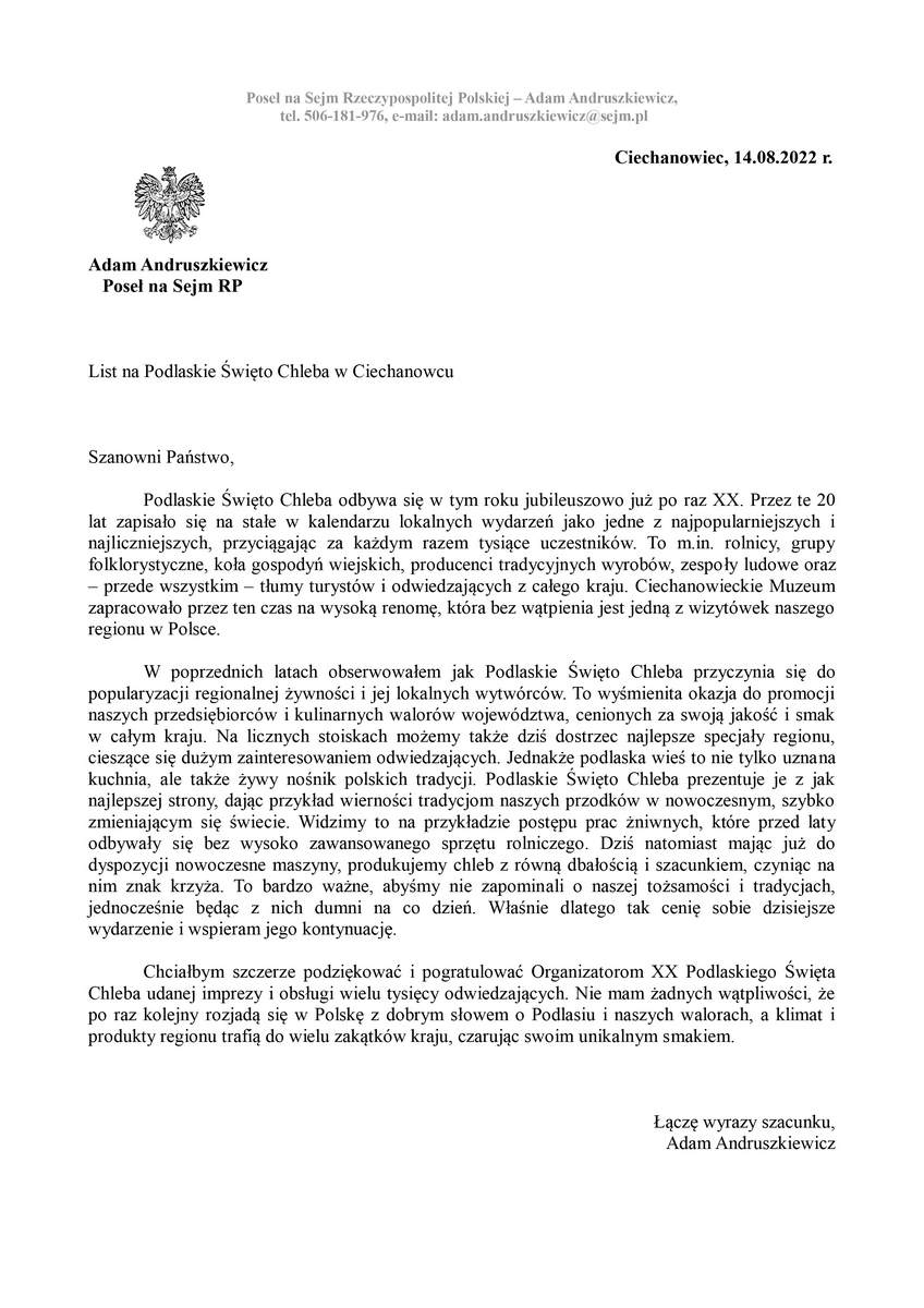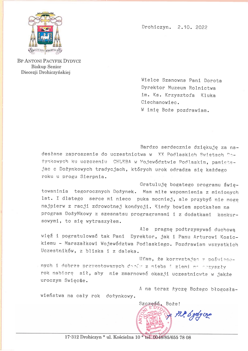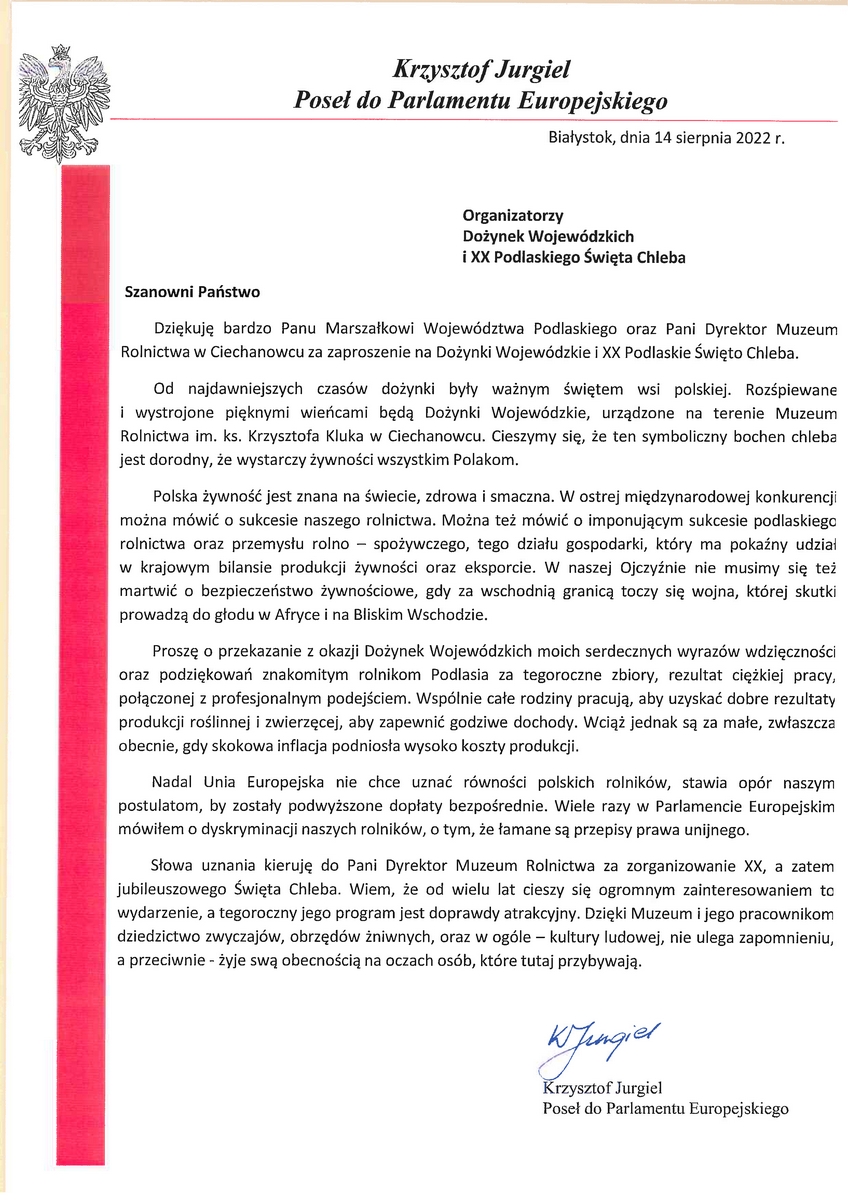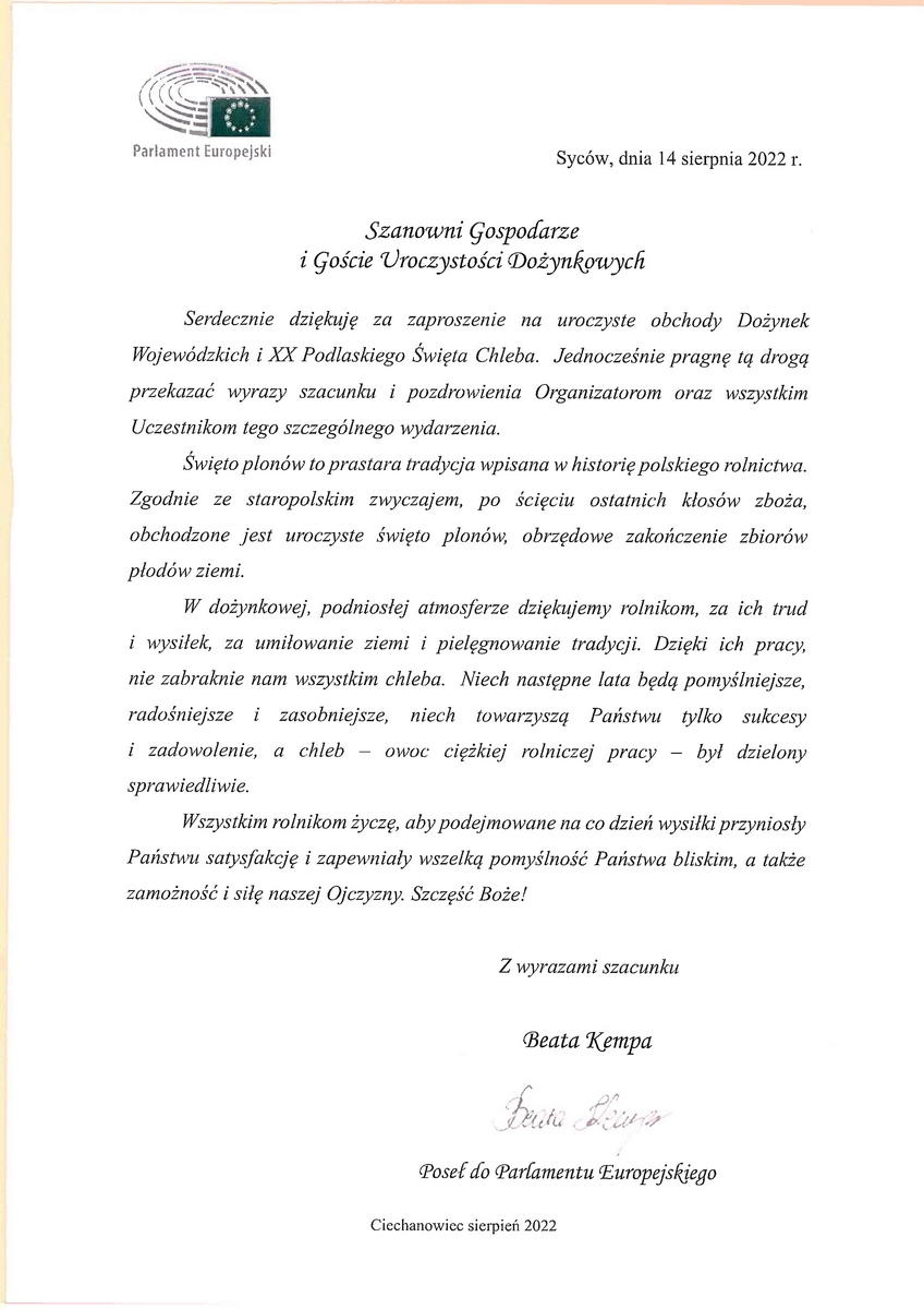 Listy gratulacyjne z okazji organizacji Dożynek Wojewódzkich i XX Podlaskiego Święta Chleba