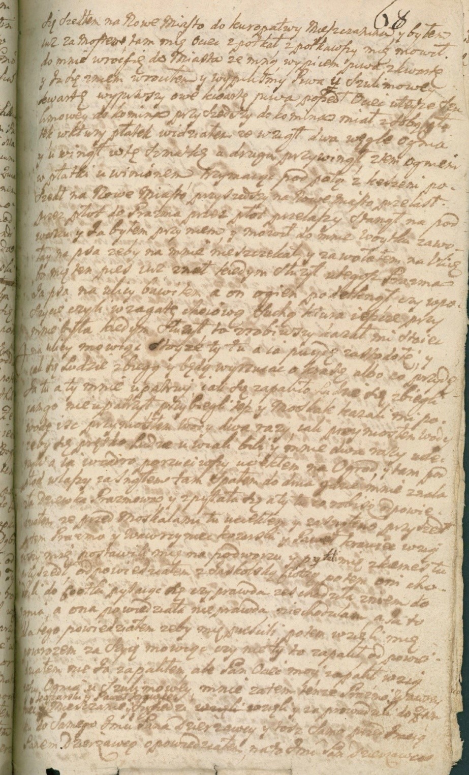 Jestem syn Pana Krzysztofa Tymińskiego, Denisza nazwanego. Rodziłem się w Czosakach w Podlasiu, gdzie ojciec mój przedtem mieszkał, a potem – kiedy się tu do Tymiank ojciec mój na dziadowską fortunę przeniósł – to i ja tu z nim przyszedłem do Tymianków. Tu zaraz oddał mnie ojciec na służbę u Pana Wojtkowskiego. Byłem u niego rok. Potem w drugich Tymiankach-Moderkach służyłem u Pana Mateusza Tymińskiego Bocianka lat trzy. Potem służyłem w Żebrach u Jmci Pana Stanisława Tymińskiego za pastucha jeden rok. Potem służyłem w Bogutach u Jmci Pana Kazimierza Boguckiego Budasia także za pastucha i bronowłóka rok. Potem służyłem w Kosiorkach w Podlasiu u szlachcica rok. Stamtąd poszedłem na służbę do Mateusza Prażma na Nowe Miasto do Ciechanowca. Byłem u niego rok. Zapłacił mi myto tylko, czapki i ubiorków mi nie dał. Potem byłem za bronowłóka w Dąbrowie-Łazach u Pana Krzysztofa Zaleskiego i tam bawiłem od Bożego Narodzenia aż ku Świętemu Wojciechowi. Przed tygodniem stamtąd przyszedłszy do ojca i tam u ojca – co kazał, to robiłem. Tymczasem nastąpił jarmark na Święty Wojciech w Ciechanowcu i poszedłem z matką do miasta Ciechanowca. Kupiliśmy sobie chleba i w gospodzie w samym mieście podjedliśmy. Podjadłszy, poszliśmy na nieszpor. Po nieszporze obaczyliśmy się z wujami, u których Pani Matka zboże na nasienie prosiła. Stamtąd Pani Matka do domu pojechała z sąsiadem, Panem Jacentym Tymińskim, a ja zostałem w mieście. Szukałem sąsiadów z Tymiank. Nie mogłem znaleźć. Musiałem być w mieście do pomroku, zmierzchało się. Szedłem na Nowe Miasto do Kuropatwy mieszczanina i byłem już za mostem. Tam mnie ojciec spotkał. Spotkawszy mnie, mówił do mnie wróć się do miasta ze mną, wypijem piwa z kwartę – i ja się z nim wróciłem, i wypiliśmy piwa u Szulimowej kwartę. Wypiwszy ową kwartę, poszedł ojciec u tejże Szulimowej do komina. Przyszedłszy do komina, miał z sobą płatek, w który płatek widziałem, że wziął dwa węgle ognia i owinął w tę szmatkę, a drugim przywinął. Z tym ogniem w płatki owiniętym, trzymając pod połą w kieszeni, poszedł na Nowe Miasto. Przyszedłszy na Nowe Miasto, przelazł przez płot do Prażma. Przez płot przelazłszy, stanął na podwórku i ja byłem przy nim, i mówił do mnie Wojtku, zawołaj na psa, żeby na mnie nie szczekał – i zawołałem na ulicę, bo mnie ten pies już znał, kiedym służył u tegoż Prażma. Ja psa na ulicy bawiłem, a on ogień podetknął w poszycie, czyli w zagatę chojową suchą, która jeszcze przy mnie była, kiedym służył. To zrobiwszy, kazał mi stajeć na ulicy, mówiąc stójże ty tu, a ja pójdę za stodołę i jak się ludzie zbiegą, i będą wyrzucać – okradnę, albo co – przyjdę ja tu, a ty mnie upatruj. Jak się zapaliło, ludzie się zbiegli. Jam go nie upatrzył. Przybiegli też i Moskale. Kazali mi po wodę iść. Przyniosłem wody dwa razy. Jak przyniosłem wody, żeby się prędko ludzie uwijali – bili i mnie dwa razy uderzyli, a ja wiadro porzuciwszy, uciekłem na ogród i tam pod płot wlazłszy, zasnąłem. Tam spałem do dnia, gdzie mnie znalazła dziewka Prażmówna i spytała się a ty tu co robisz? - odpowiedziałem, że przed Moskalami tu uciekłem i zasnąłem. Przyszedłszy Prażmo i Wawrzyniec Kozarski, i Paweł Krawiec – wziąwszy mnie, postawili mnie na podwórzu i pytali mnie z kiemeś tu przyszedł? - odpowiedziałem z Jaskólską, ciotką. Potem oni chodzili do ciotki, pytając się czy prawda, żeś chodziła z niem do ognia? - a ona odpowiedziała nieprawda, nie chodziłam. A ja to dlatego powiedziałem, żeby mnie puścili. Potem wzięli mnie powrozem za szyję, mówiąc czy nie ty to zapalił? - odpowiedziałem nie ja zapaliłem, ale ojciec mój zapalił, wziąwszy ognia u Szulimowej. Mnie zatem tenże Prażmo, Wawrzyniec Kozarski i Paweł Krawiec – mieszczanie i sąsiedzi – wzięli i zaprowadzili do zamku, do samego Jmci Pana dzierżawcy i toż samo przed Jmcią Panem dzierżawcą opowiedziałem. Na to Jmć Pan dzierżawca powiedział mi pójdź że teraz do kordygardy (wartownia/odwach) i tam sobie posiedź. Zaprowadzili mnie żołnierze i dotychczas siedziałem. Nazajutrz mnie okowano i po okowaniu, tegoż dnia, przyprowadzono ojca do kordygardy i mówiłem ojcu, że wy, Panie Ojcze, zapaliliście a mnie bieda, a ojciec tak powiedział niech ci Bóg płaci, mój synku. Ojciec posiedziawszy, począł był uciekać, którego złapawszy koło szańca za basztą, kazano okować i dotychczas obydwa z ojcem siedzieliśmy w kordygardzie. Dopiero dziś wzięto mnie z ojcem z kordygardy i tu przyprowadzono przed sąd.