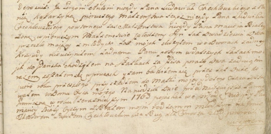 Ja, Gorgoni Antoni niegdy Pana Ludwika Chechłowskiego z Panią Katarzyną, pierwszego małżeństwa tegoż niegdy Pana Ludwika Chechłowskiego, powtórnego zaś małżeństwa niegdy Pana Macieja Białego żoną, w pierwszym małżeństwie spłodzony syn, lat dwadzieścia dwa przeszło mający. Z młodych lat moich służyłem we dworach. Żadnej krzywdy nie uczyniłem żadnemu Panu. Potem w dalszych latach moich do Gdańska chodziłem, na statkach za flisa po razy dwa. Za drugim razem zostałem się w Prusach i tam bawiłem się przez lat dwie. Dopiero roku przeszłego przyszedłem do matki mojej i do tego czasu zostawałem w domu ojca mojego. Na niedziel dwie przed Najświętszą Panną Gromniczną, w roku teraźniejszym 1763, pojechał w środę niegdy Pan Maciej Biały, ojczym, z bratem moim rodzonym młodszym, na imię Teodorem Pawłem Chechłowskim, za Bug dla chrosta, skąd powrócili wieczorem trzeźwi do domu i pomieniony Pan Maciej Biały, ojczym, położył się w łóżku, i udawał się być pijanym. Gdy dawaną wieczerzą obudziwszy my go i obligowali, żeby wstał do jedzenia, jako i uczynił – zjadł z nami. Zjadłszy, poszedł do łóżka, rozebrawszy się. A potem począł narzekać na żonę swoją, a matkę naszą, że dzieciom jego jeść nie dała. Odpowiedziała matka nasza, że dzieci jedli. Nie chciał słuchać, musiała ogień rozpalić, ustawić garczki do gotowania, a w tem niegdy Pan Biały z łóżka wstał i złorzeczył na matkę i na nas. Matka poszła za drzwi. Ja tymczasem podniosłem się z pościeli i stanąłem na izbie. Pomieniony Pan Biały rzucił butem na mnie, ale nie trafił, tylko w ścianę, a potem do mnie rzucił się. Ja też do niego i powaliłem go na łóżko, tamże wziąwszy za gardło i poduszką przykrywszy, dusiłem i kolanami gniotłem ile mi sił stawało, a wyrażony brat mój, Teodor Chechłowski, porwawszy za spodek, ściskał i obydwa przyczyną jesteśmy do śmierci jego. Co zaś matka nasza i siostra imieniem Franciszka nie byli wtenczas w izbie, tylko na dworze uciekłszy. Już po wszystkim matka nasza przyszła do izby i obaczywszy, że mąż jej, a ojczym nasz, nie żyje, mówiła do nas: co wyście lepszego zrobili? Zgubiliście człowieka. Cóż wam po tym było? Po tym zaś naszym uczynku zaprzęgliśmy kobyłę w sanie nieboszczykowską. Zaprzągłszy, zajechaliśmy przed sień obydwa bracia i gdy nie mogliśmy obydwa wynieść trupa, matka nasza i siostra dopomogli wynieść i włożyć na sanie. Włożywszy, my obydwa bracia w nocy zawieźliśmy do rzeki nazwanej Nurzec i płoń gotową znalazłszy i obciąwszy siekierami, wpuścili pod lód. Nikt o tym więcej nie wiedział i my, rozumiejąc, że poszedł z wodą, w domu siedzieliśmy, aż dopiero w sobotę przeszłą, w dzień Św. Józefa, Jmć Pan Andrzej Leszczyński, upatrując ryb, obaczył trupa i dał znać do wsi, a potem przyjaciołom niegdy Pana Białego, przez nas uduszonego i zabitego, oświadczył. Którzy dostawszy trupa z wody, nas obydwu braci w domu zastawszy, wzięli. Wziąwszy, w dyby wsadzili, z trupem tu do tych konfessat przywieźli i to jeszcze przypomniałem sobie, że tegoż dnia, przed tym niż ta akcja stała się, tośmy umyślili byli z matką naszą, namówili się, że pojedziemy do wróżki, żeby co złego niegdy Białemu, ojczymowi i mężowi, uczyniła albo jechać do Drohiczyna do sysmatyków dać na służbę, żeby przepadł, co jaka się rzecz stała. Wszystko prawdziwie wyznałem na teraźniejszych konfessatach moich i więcej nic powiedzieć nie mogę.