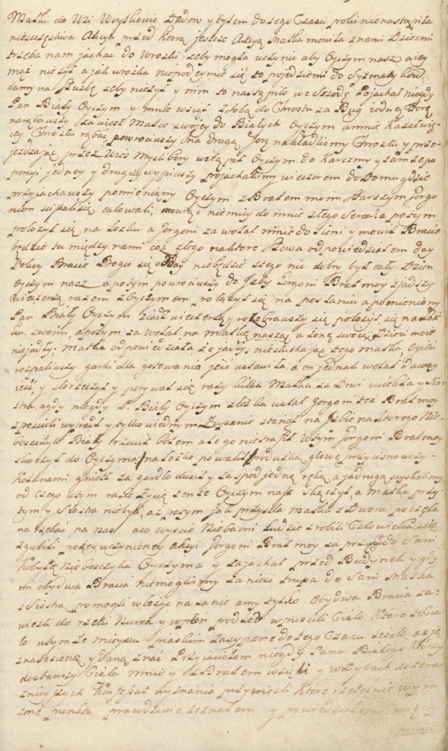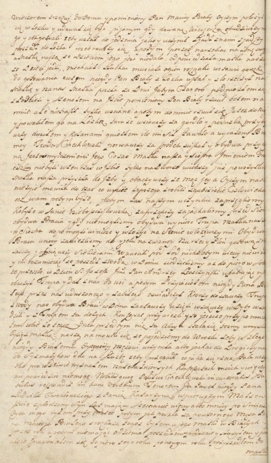 Ja, Paweł, niegdy Pana Ludwika Chechłowskiego z Panią Katarzyną w pierwszym małżeństwie spłodzony syn, lat mający szesnaście więcej albo mniej. Po śmierci ojca mego byłem przy matce. Potem jak poszła za powtórnego męża, Pana Macieja Białego, z rozkazu tegoż byłem u jego matki w Białych przez rok, a potem, nie mając odzienia, poszedłem w Podlasie i służyłem, i poczciwie sprawowałem się. Dopiero tego roku, po Nowym Roku, przyszedłem do matki do wsi Wojtkowic-Dadów i byłem do tego czasu, póki nie nastąpiła nieszczęśliwa akcja, przed którą jeszcze akcją matka mówiła z nami, dziećmi: trzeba nam jechać do wróżki, żeby mogła uczynić, aby ojczym (nasz, a jej mąż) nie żył, a jak wróżka nie podejmie się, to pojedziemy do sysmatyków, damy na służbę, żeby nie żył. I nim to nastąpiło, w środę pojechał niegdy Pan Biały, ojczym, i mnie wziął z sobą do chrostu za Bug. Jedną furę narąbawszy, zawiózł matce swojej do Białych ojczym, a mnie kazał więcej chrostu rąbać. Powróciwszy, na drugą furę nakładliśmy chrostu i przejeżdżając przez wieś Myślibory, wstąpił ojczym do karczmy i tamże po porcji jednej i drugiej wypiwszy, pojechaliśmy wieczorem do domu, gdzie przyjechawszy, pomieniony ojczym z bratem moim starszym, Gorgoniem, ściskali się, całowali, mówiąc nie miej do mnie złego serca, a potem położył się na łóżku, a Gorgoni zawołał mnie do sieni i mówił: bracie, będzie między nami cóż złego? - na które słowa odpowiedziałem: daj pokój, bracie. Bogu się oddaj. Nie będzie z tego nic. Dobry był cały dzień ojczym nasz. A potem powróciwszy do izby, Gorgoni, brat mój, zjadłszy wieczerzę razem z ojczymem, położył się na posłaniu, a pomieniony Pan Biały, ojczym, zjadł wieczerzę i rozebrawszy się, położył się na łóżku swoim, a potem zawołał na matkę naszą, a żonę swoją: dzieci moje nie jadły. Matka odpowiedziała, że jadły. Nie słuchając tego, matka ogień rozpaliwszy, garki dla gotowania jeść ustawiła, a on jednak wołał: dawaj jeść i złorzeczył, i porywał się razy kilka. Matka za drzwi uciekła i siostra, a gdy niegdy Pan Biały, ojczym, z łóżka wstał, Gorgoni też, brat mój, z pościeli wypadł i tylko w jednym żupanie stanął na izbie, na którego nieboszczyk Biały rzucił butem, ale go nie trafił. W tym Gorgoni, brat mój, skoczył do ojczyma, na łóżko powalił, poduszką głowę przycisnąwszy – kolanem gniótł, za gardło dusił a za spód jedną ręką, a ja drugą, ściskaliśmy, od czego w razie życie tenże ojczym nasz skończył. A matka przy tym i siostra nie byli, aż potem, jak przyszła matka z dworu, poczęła narzekać na nas: a co wyście, niebacni ludzie, zrobili? Człowiekaście zgubili. Po tej uczynionej akcji Gorgoni, brat mój, zaprzągł do sani kobyłę nieboszczyka ojczyma i zajechał przed budynek. I gdy my obydwa bracia nie mogliśmy zanieść trupa do sani, matka z siostrą pomogli włożyć na sanie, a my tylko, obydwa bracia, zawieźli do rzeki Nurca i w płoń pod lód wpuścili ciało. Które to ciało w tymże miejscu piaskiem zasypane do tego czasu leżało, aż je znaleziono i dano znać przyjaciołom niegdy Pana Białego, którzy dostawszy ciała, mnie i z bratem wzięli, i w dybach do teraźniejszych konfessat wyznania przywieźli. Które rzetelnie wyrażone punkta prawdziwie zeznałem i powiedziałem, a więcej powiedzieć nie mogę.