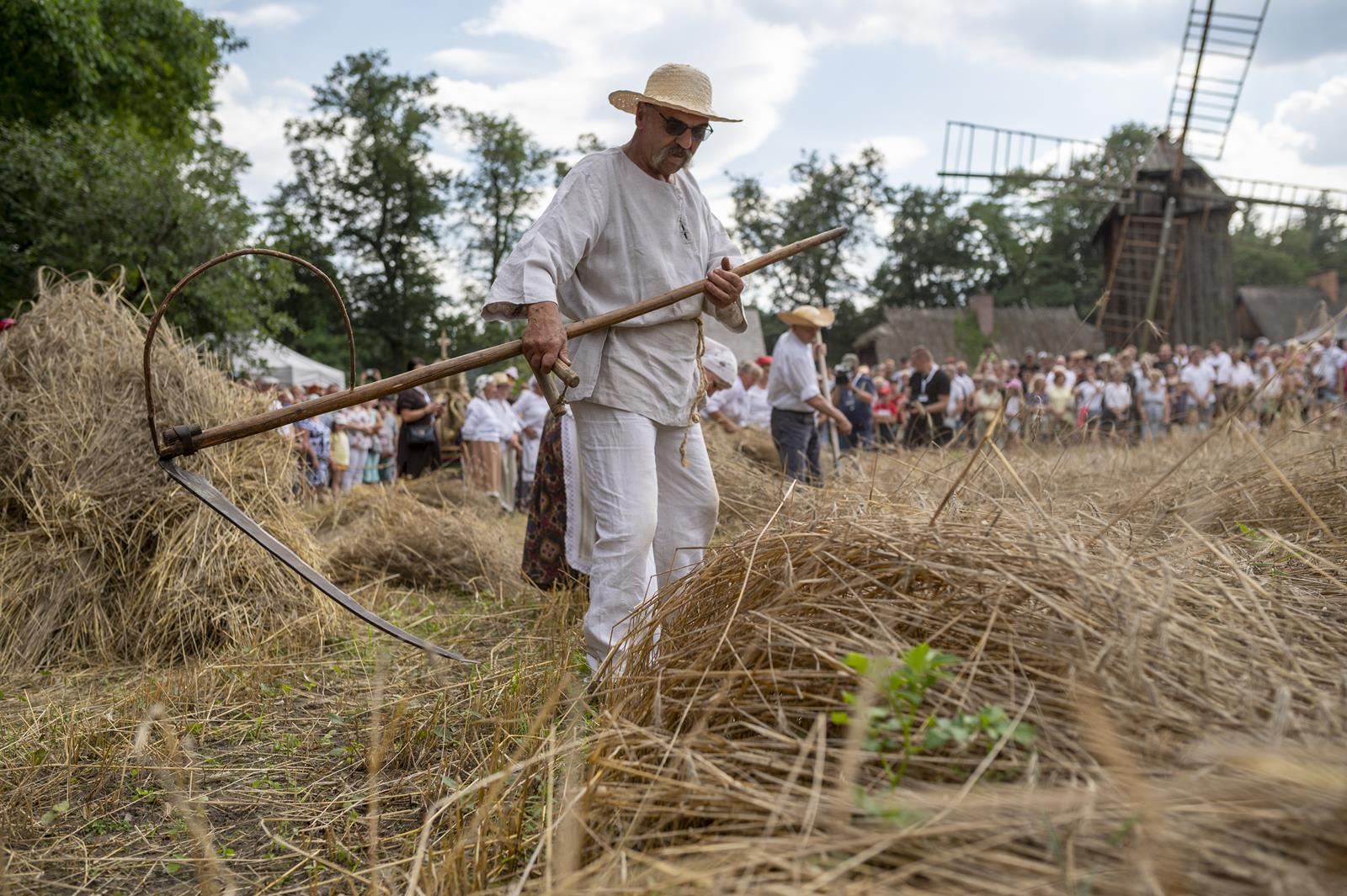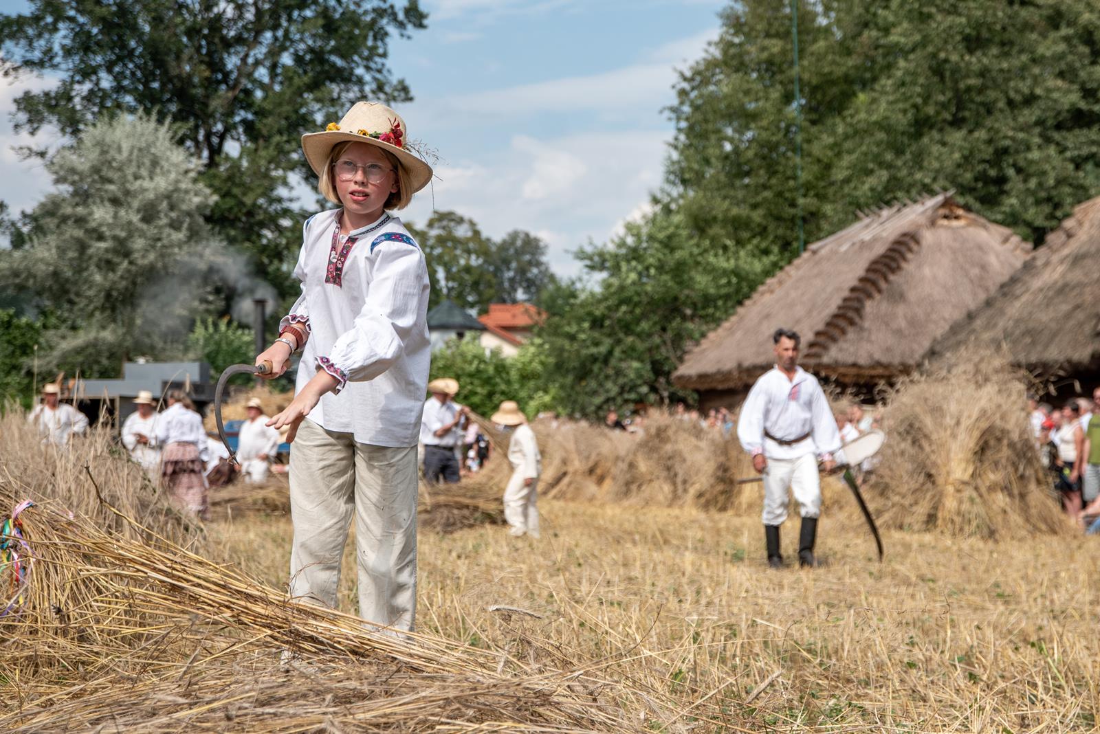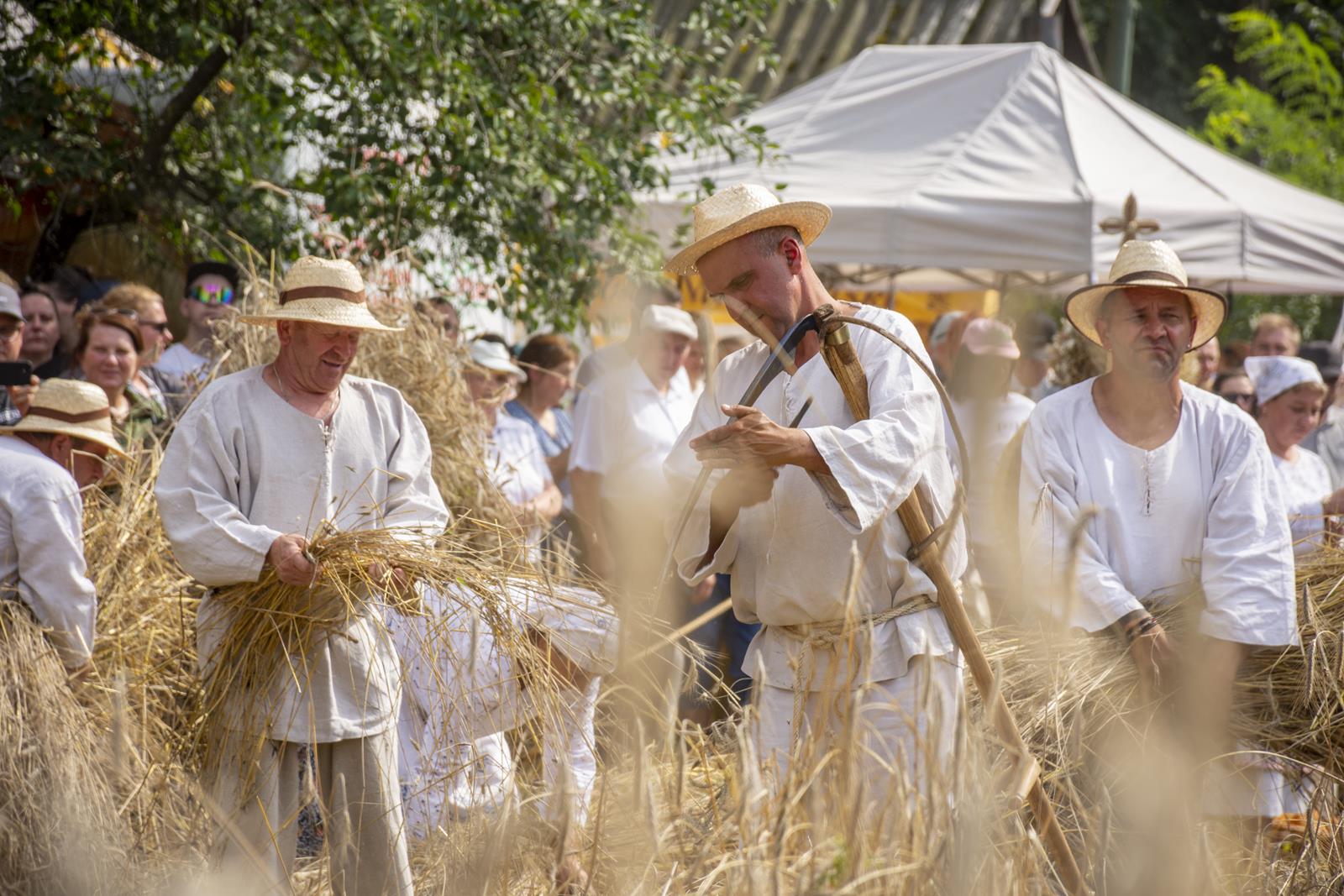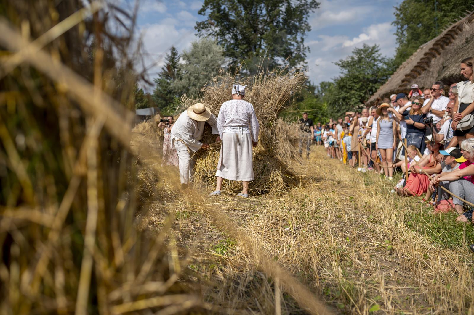 Główną atrakcją Święta Chleba był pokaz żniwny, który rozpoczął się żęciem żyta za pomocą sierpów, a następnie kos. Po ustawieniu w dziesiątki związanego w snopy zboża, żniwiarze zaprezentowali obrzęd zdobienia przepiórki i jej oborania. Następnym punktem prac polowych był pokaz młócenia zboża zabytkowymi młocarniami.