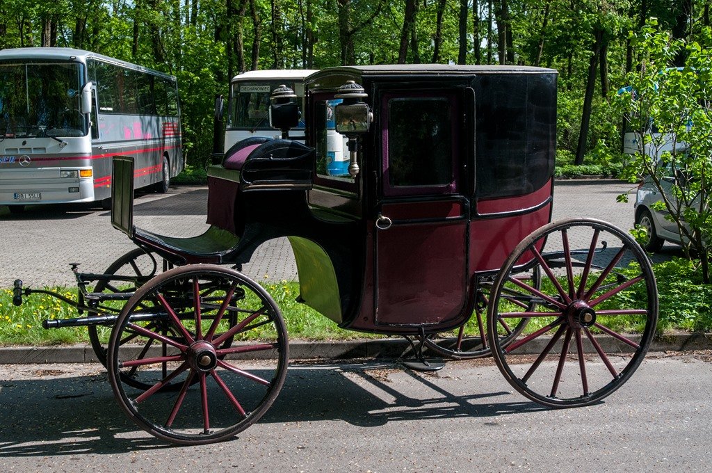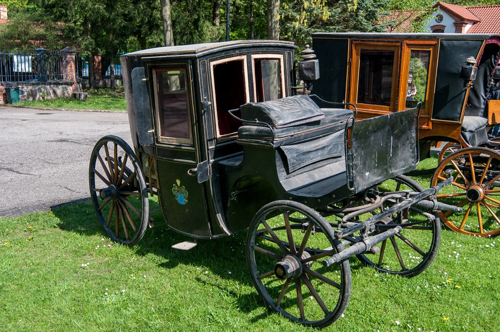 Kareta coupe (z drzwiami ozdobionymi przez ostatniego właściciela kartuszem herbowym), pojazd zaprzęgowy, wyjazdowy o nadwoziu w formie zamkniętego pudła na dwie osoby. Wewnątrz pudło karety oraz siedzenia wyściełane materiałem welurowym w kolorze czerwonym. Kozioł w formie skrzyni wykonany z drewna i skóry, z siedziskiem dla woźnicy w formie klina. Podwozie przednie ze skrętem wieńcowym, na resorach. Kareta była używana na terenie Mazowsza, wytwórnia nieznana, pochodzi z początku XX wieku, (wymiary maksymalne: wysokość 184 cm, szerokość 163cm, dlugość 320 cm) numer inwentarza C/III/6638.