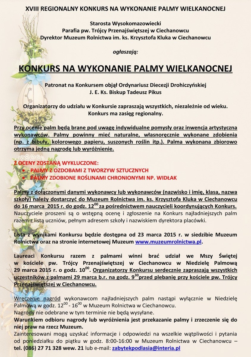 29 marca 2015 r. o godz. 1000. Organizatorzy Konkursu serdecznie zapraszają wszystkich uczestników z palmami 29 marca b.r. na godz. 930przed plebanię przy kościele pw. Trójcy Przenajświętszej w Ciechanowcu.