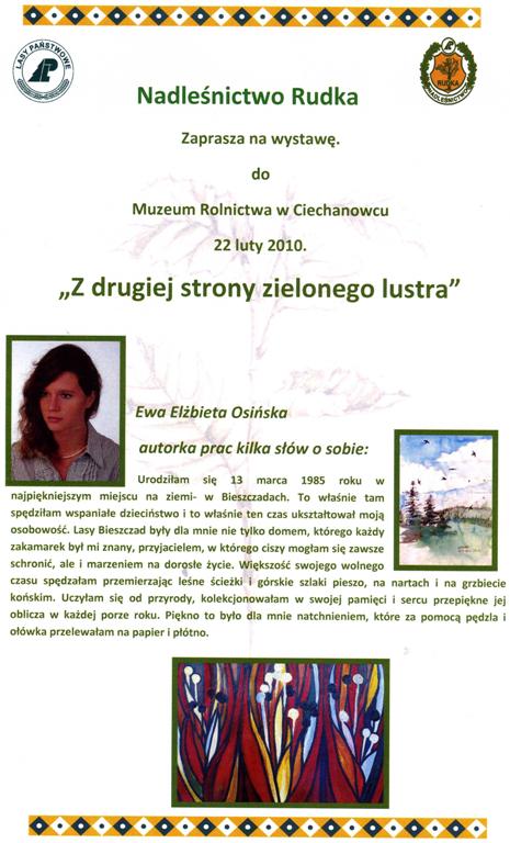 Podsumowanie konkursu zostało połączone z otwarciem wystawy czasowej „Z drugiej strony zielonego lustra”, prezentującej grafiki i obrazy autorstwa pani Ewy Elżbiety Osińskiej. Do namalowania pokazanych prac autorkę zainspirowała przyroda Bieszczad i doznania wyniesione z uczelnianych pracowni Wydziałów Leśnego i Medycyny Weterynaryjnej SGGW w Warszawie.