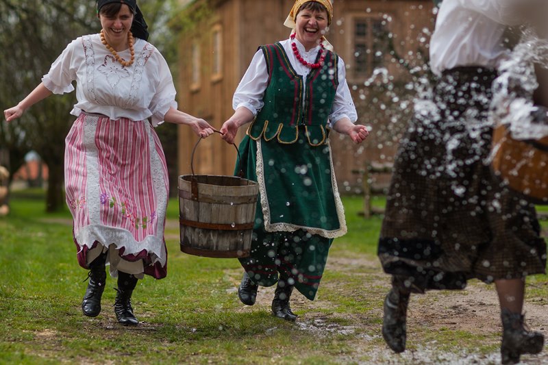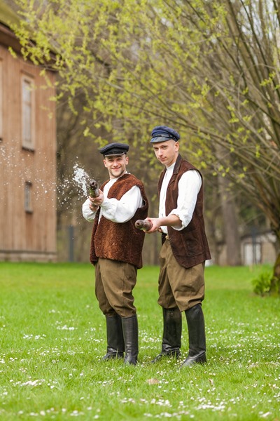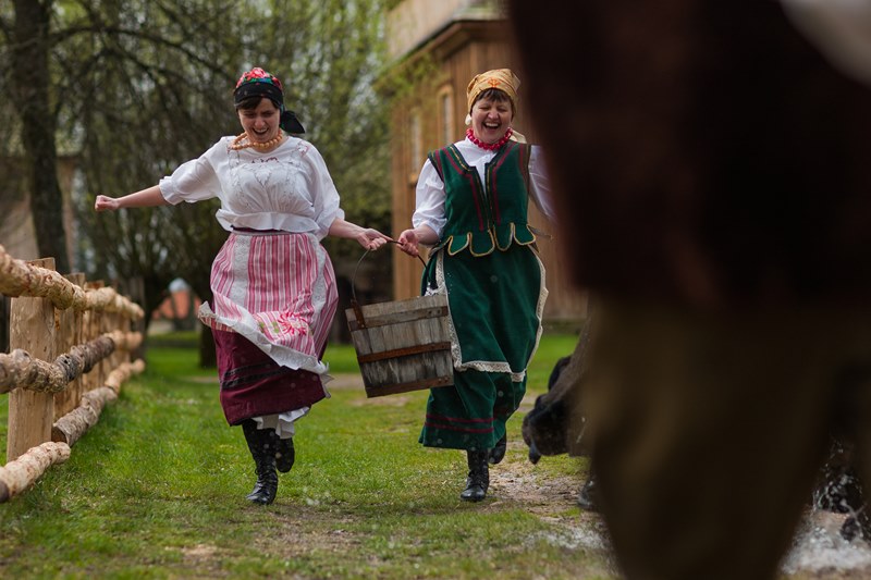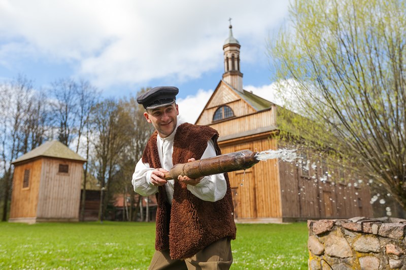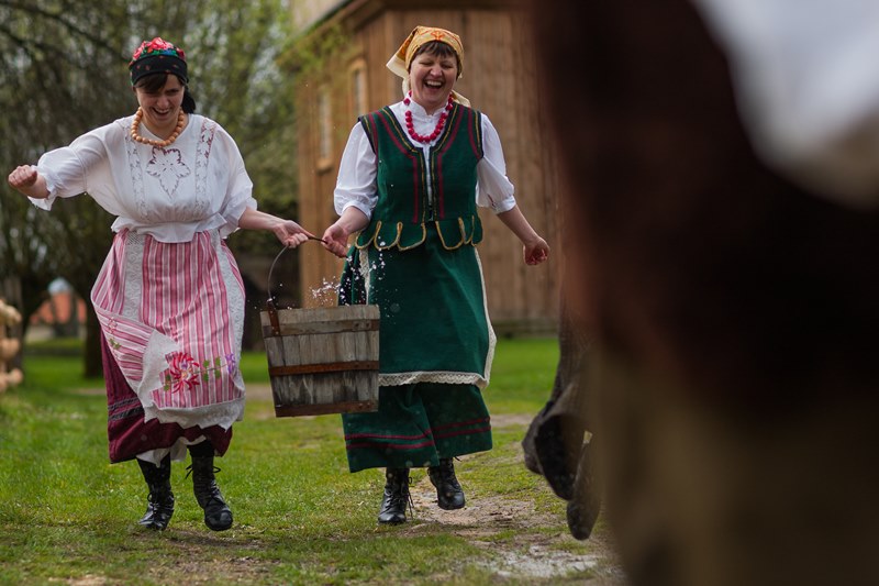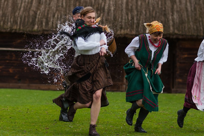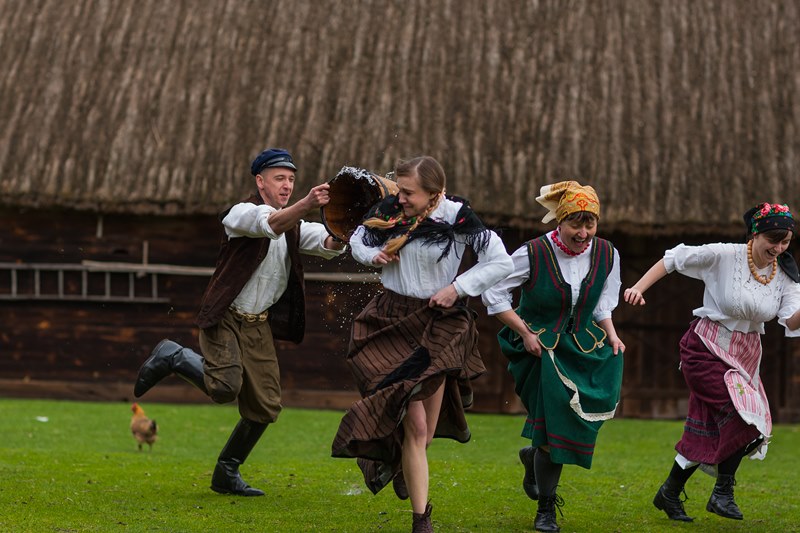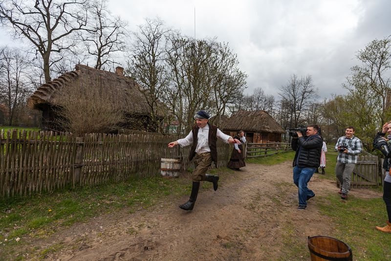 W dniach 15, 17 i 18 kwietnia br. gościliśmy w skansenie trzy ekipy telewizyjne - Polsat, TVN 24 oraz TVP Białystok. Były to dni kiedy prezentowaliśmy obyczaj związany z drugim dniem Świąt Wielkiejnocy czyli Lany poniedziałek. Ten dzień w dawnym zwyczaju nikomu nie mógł ujść na sucho. Wśród pisków, krzyków, szamotaniny i śmiechu najchętniej urządzano dyngus ładnym i lubianym pannom. Ta z dziewcząt, której nie oblano wiadrem wody albo nie wrzucono do rzeki, stawu czy chociażby koryta do pojenia bydła, czuła się obrażona. W wytwornym towarzystwie zabawa ta przebiegała nieco łagodniej niż na wsi, chociaż, jak pisał J. Kitorowicz: "(.) gdy się rozswawolowała kompania, panowie i dworzanie, panie, panny, nie czekając dnia swego, lali jedni drugich wszelkimi statkami jakich dopaść mogli; hajducy i lokaje donosili cebrami wody, a kompania dystyngowana, czerpiąc od nich, goniła się i oblewała od stóp do głów, tak, iż wszyscy zmoczeni byli, jakby wyszli z jakiego potopu".