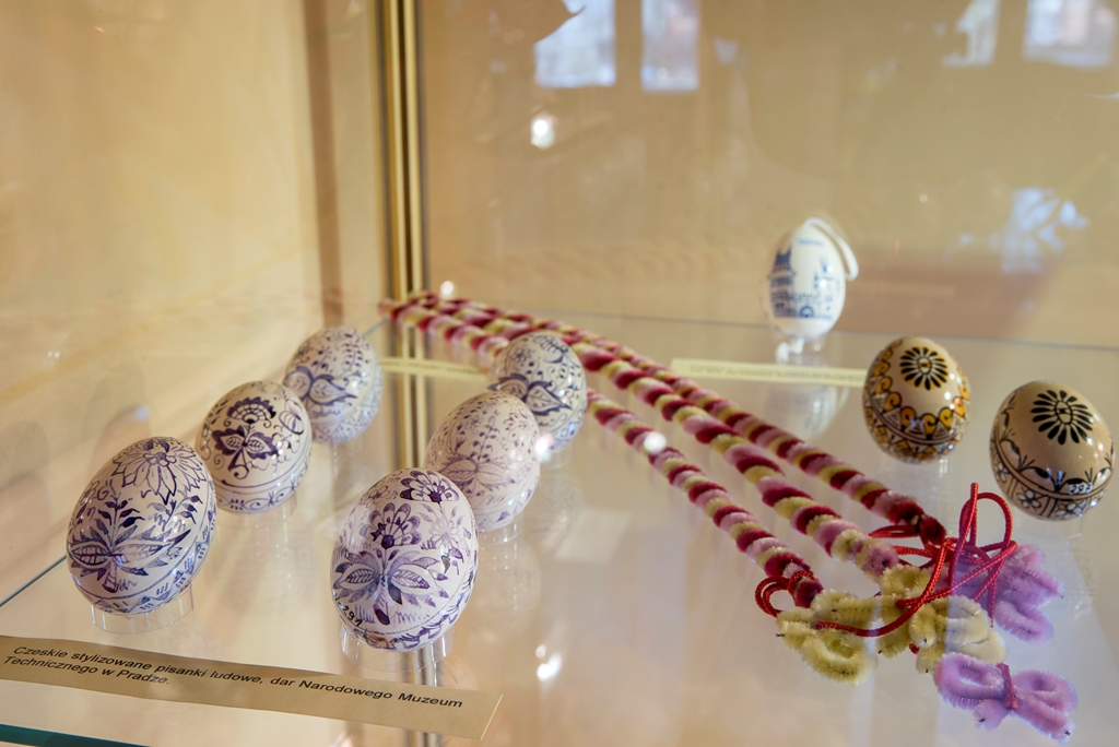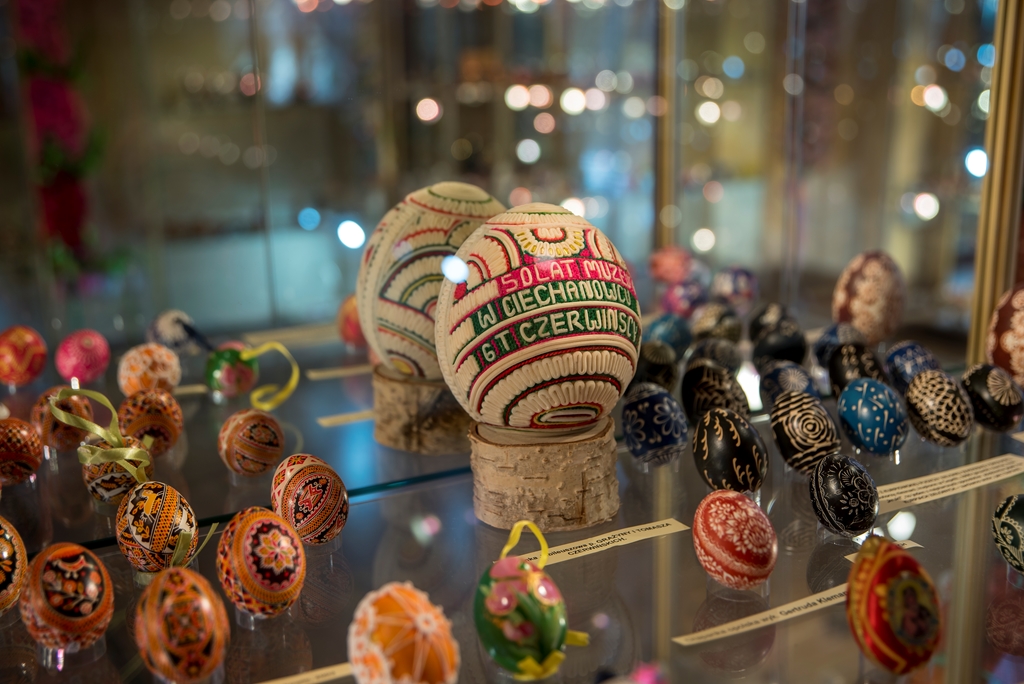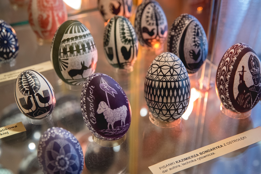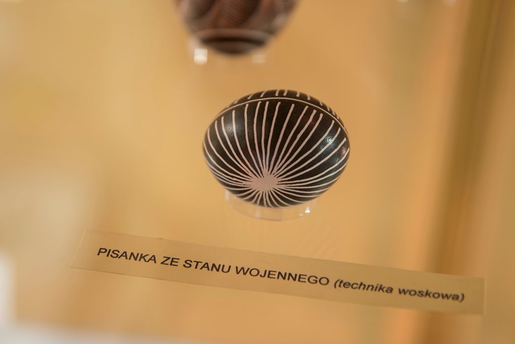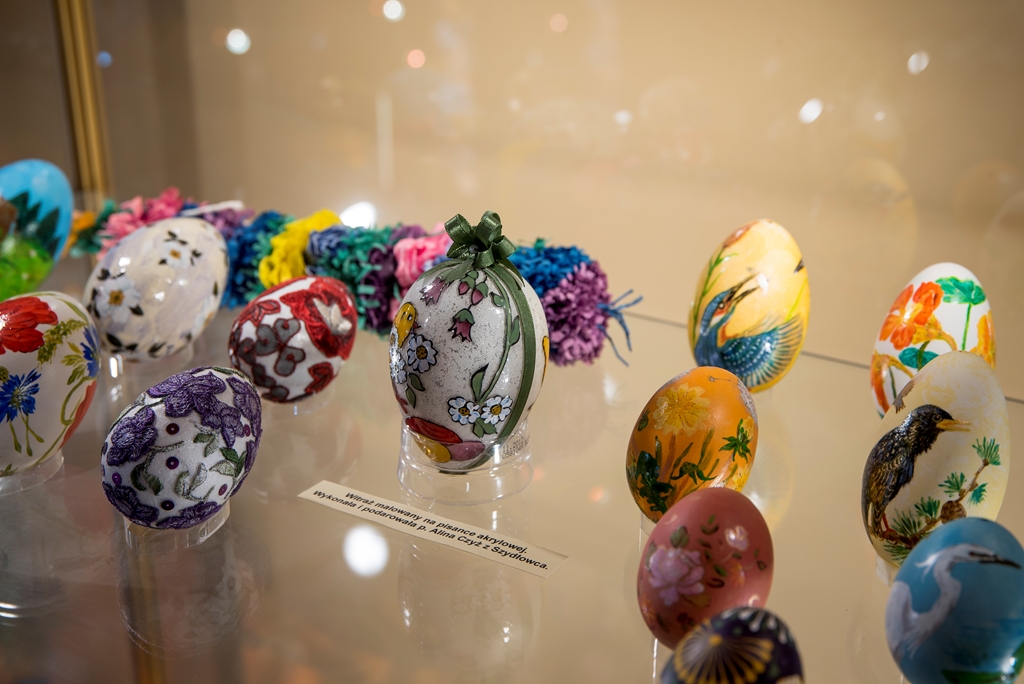 - techniką aplikacyjną – która polega na oklejaniu wydmuszek, co z kolei daje możliwość puszczenia wodzy fantazji, czego efekty doskonale widać w muzeum. Wydmuszki są oklejone tradycyjnie kolorowym, błyszczącym papierem, świecidełkami, czy też koralikami. Jednak są i takie, które zaskakują. Niektóre jajka oklejone są sitowiem i przędzą, ale również przeróżnymi ziarnami, np. ryżu, gryki lub nasionami ogórków;