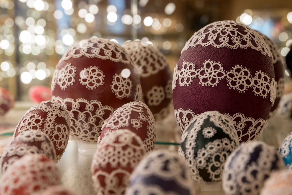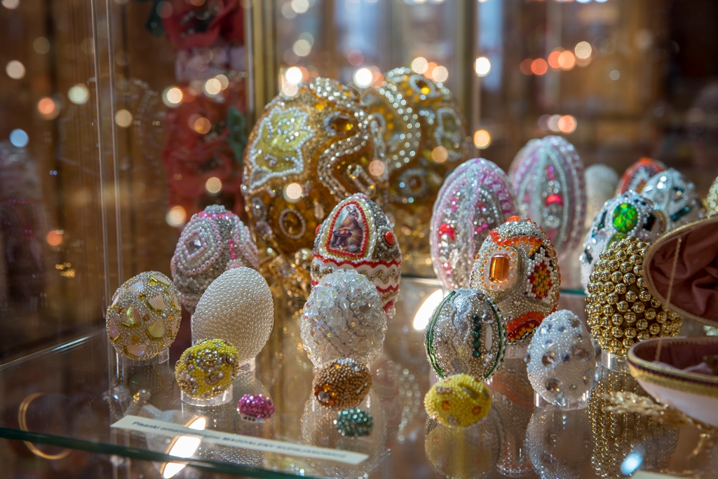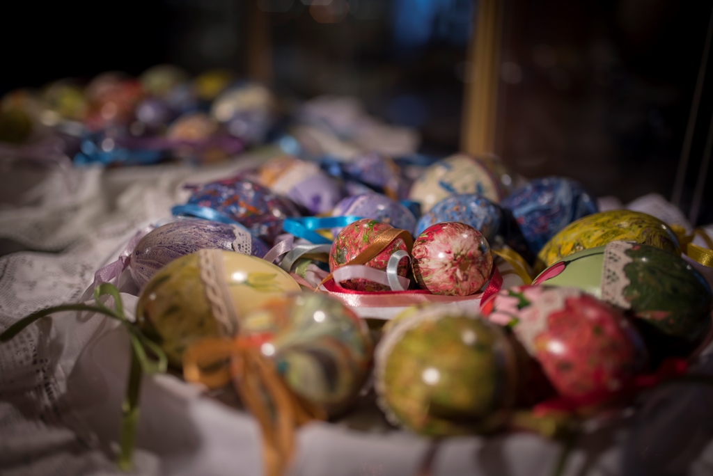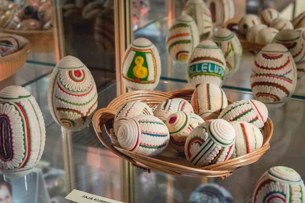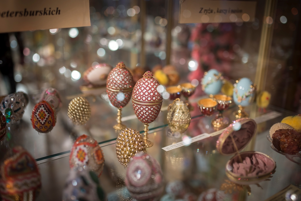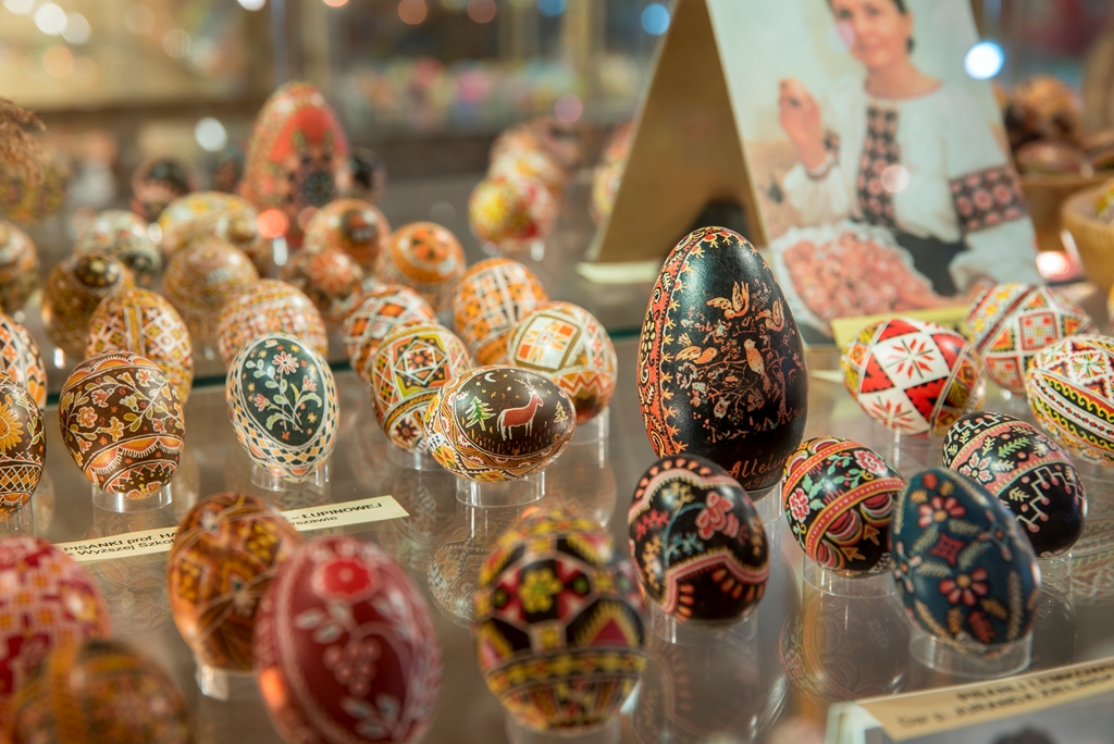 - techniką aplikacyjną – która polega na oklejaniu wydmuszek, co z kolei daje możliwość puszczenia wodzy fantazji, czego efekty doskonale widać w muzeum. Wydmuszki są oklejone tradycyjnie kolorowym, błyszczącym papierem, świecidełkami, czy też koralikami. Jednak są i takie, które zaskakują. Niektóre jajka oklejone są sitowiem i przędzą, ale również przeróżnymi ziarnami, np. ryżu, gryki lub nasionami ogórków;
