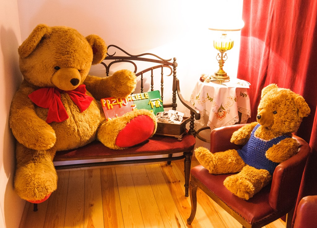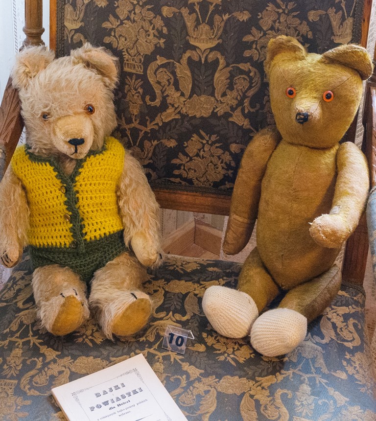 Po wejściu na poddasze na wystawie zabawek wita nas rodzina pluszowych niedźwiadków, z których najstarsze pochodzą z dwudziestolecia międzywojennego. Przy tej okazji warto nadmienić, iż w 2020 r. przypada 118. rocznica powstania pierwszego na świecie pluszowego misia zwanego „Teddy Bear” (na cześć prezydenta Stanów Zjednoczonych - Teodora Roosevelta). W Europie pluszowego niedźwiadka po raz pierwszy zaprezentowano w 1903 r. na targach zabawkarskich w Lipsku. Wystawiająca go firma założona w 1880 r. przez Margaretę Steiff w niemieckiej miejscowości Giengen dzięki produkcji pluszowych misiów stała się światową potęgą. Już w 1907 r. produkowała ich blisko 1.000.000, z czego większość była przeznaczona na eksport. Do dziś firma Steiff istnieje i prężnie działa, a jej pluszaki są najwyżej cenione wśród kolekcjonerów zabawek.