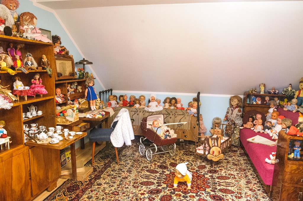 W dziewczęcym pokoju można obejrzeć całą plejadę lal od szmacianych i celuloidowych dzidziusiów po lalki Barbie. Najstarsza lalka Barbie w kolekcji pochodzi z 1963 r., a najnowsza – Ken (partner Barbie) z 1975 r. W pokoju jest też bakelitowy projektor „Bajka” na przeźrocza i adapter walizkowy z kolekcją pocztówek dźwiękowych oraz kącik z robótkami ręcznymi z maszyną do szycia ubranek dla lal, kolekcja domowych naczyń do zabawy, a wśród nich porcelanowa zastawa oraz metalowe, emaliowane rondelki i imbryki.