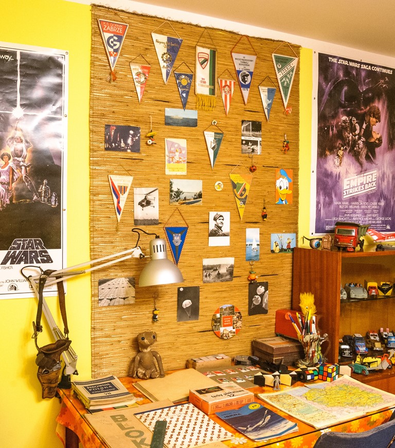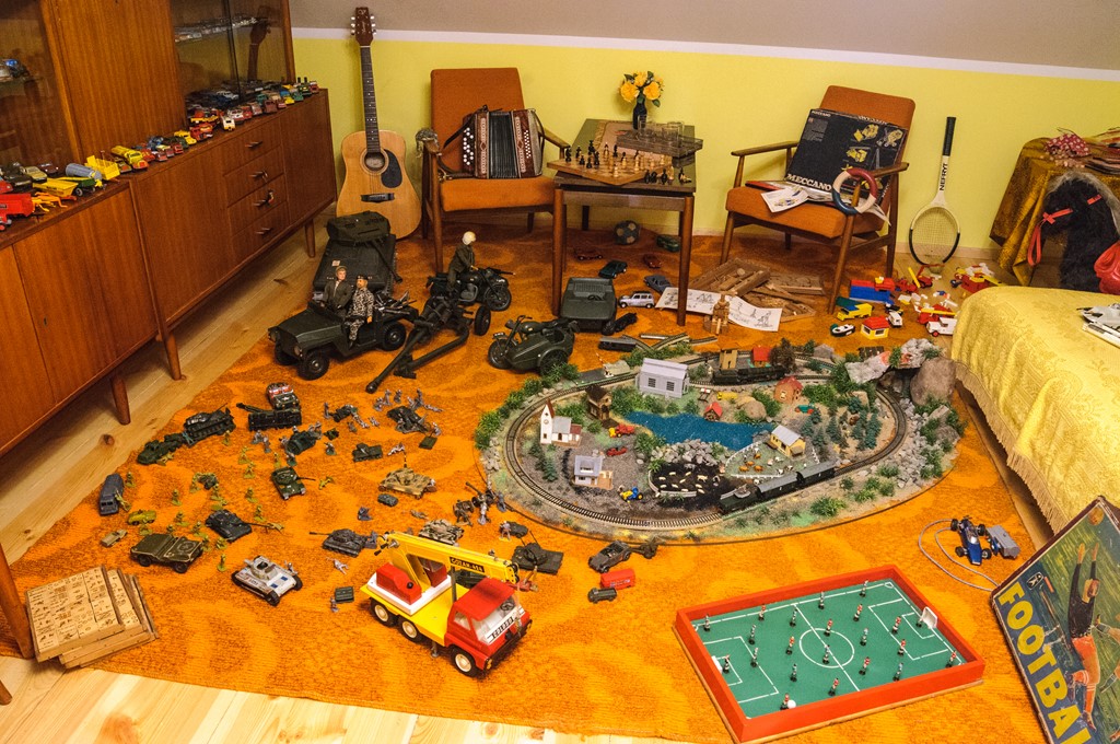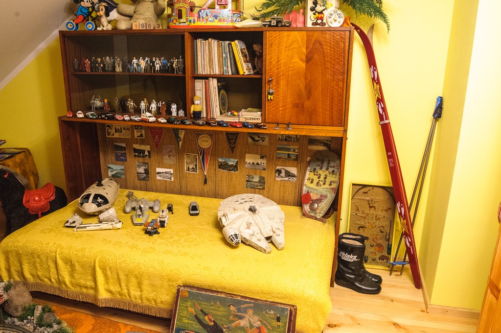 W pokoju chłopięcym można znaleźć całą gamę "resoraków", czołgów i samolotów. Nie mogło tu zabraknąć piłkarzyków czy kolejki elektrycznej, ani też całych "armii" ołowianych i plastikowych żołnierzyków. Są też unikatowe statki kosmiczne i figurki przedstawiające bohaterów kultowej sagi "Gwiezdne wojny" z lat 70. i początku 80. XX w. Oprócz tego, zwiedzający mogą zajrzeć do starych podręczników i zeszytów, obejrzeć kolekcję proporczyków i pocztówek z lat. 70. i 80. XX w., a w biblioteczce znaleźć książki, które niegdyś były bardzo popularne wśród dzieci, jak na przykład "Dzieci z Bullerbyn" czy "Przygody Tomka Sawyera".