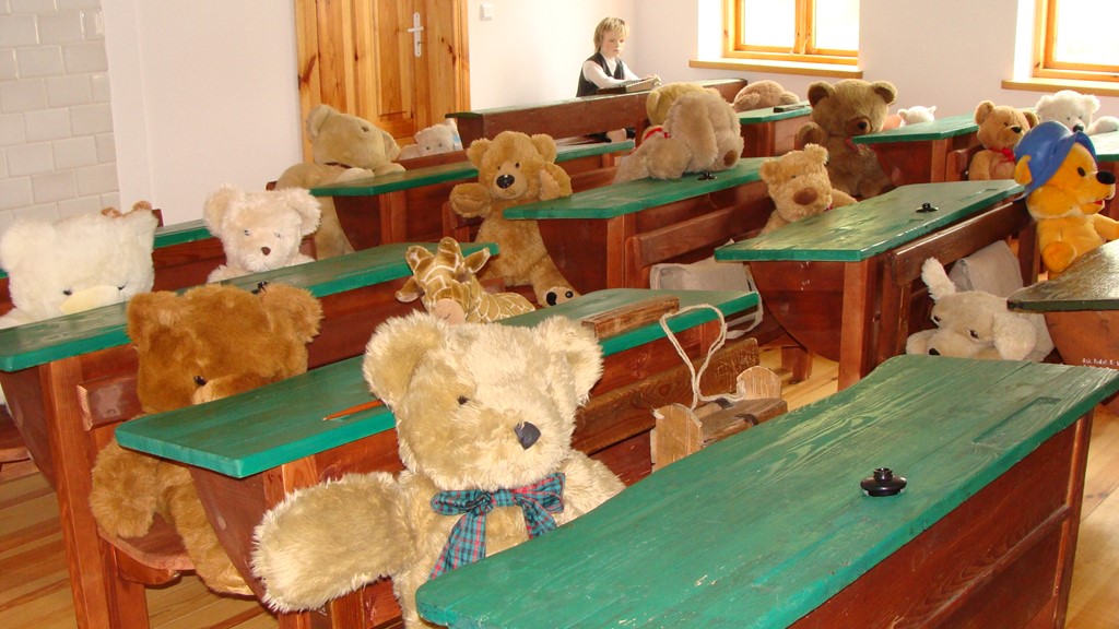 Pluszowe przytulanki gościnnie w sali lekcyjnej z lat 30. XX w., z okazji Międzynarodowego Dnia Dziecka w 2016 r.