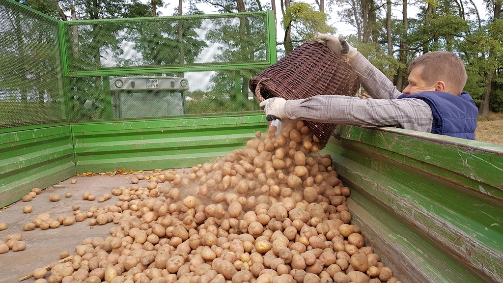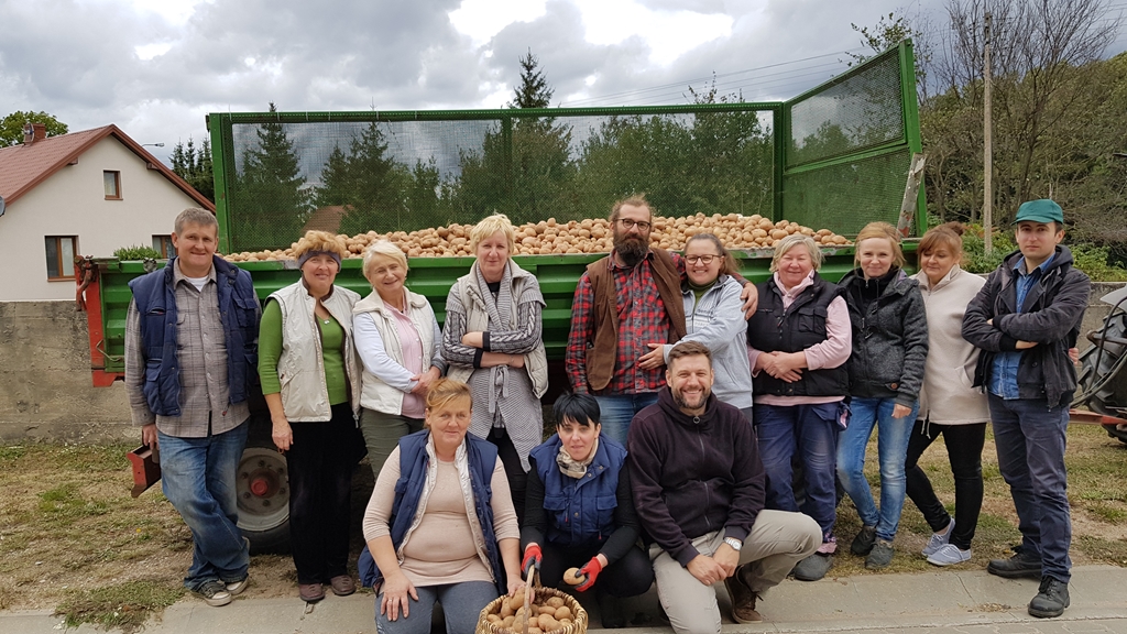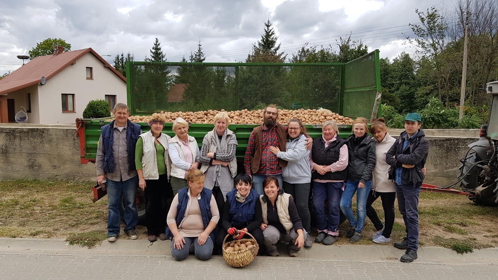 Po dotarciu na pole oczom pracowników muzeum ukazał się niebagatelny widok. Oto połowa z ziemniaczanych rządków była już rozkopana (przy użyciu kopaczaki ciągnikowej) a w słońcu „lśniły” okazałe bulwy (odmiana Irga) Nikogo nie trzeba było zachęcać do pracy, ruszyliśmy gromadnie - po rządku na parę. I za chwilę pierwsze opróżniane koszyki wypełniały zieloną przyczepę. Nie minęło wiele czasu, a już dotarliśmy na skraj pola. Ciągnik ruszył i po krótkiej chwili kolejne wykopywane ziemniaki „wesoło podskakiwały” na taśmie kopaczki. Robota „szła” na tyle wartko, że około południa z pola zniknęły wszystkie kartofle. Zbiór okazał się tak obfity, że w pewnym momencie nasz traktorek nie podołał i ugrzązł w polu, ale z pomocą przyszedł Pan Krzysiek z Bujenki - operator kopaczki. Ale to nie koniec, przecież jak pisał Gloger, tłoka kończy się ucztą. Rozpaliliśmy ognisko a woń pieczonych kiełbasek rozeszła się po Winnej. Całość prac na polu podsumowano wspólnym zdjęciem na tle wypełnionej po brzegi ziemniakami przyczepy.