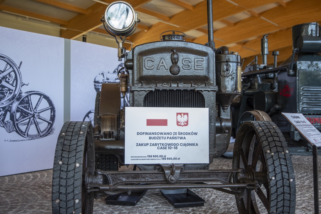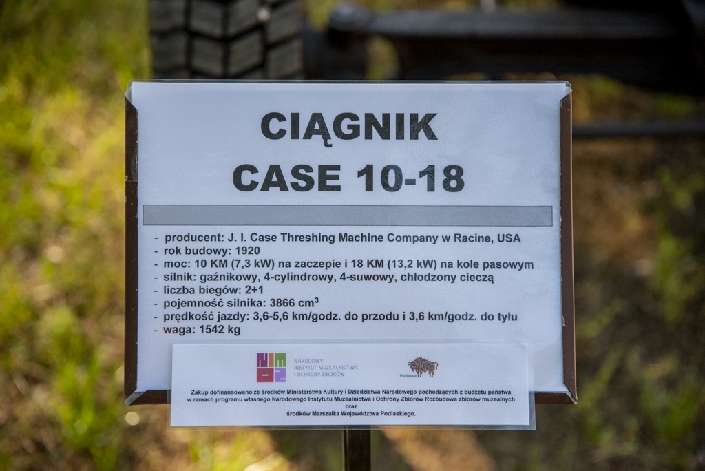 Dziś, tj. 10 lipca br., przybył do ciechanowieckiego muzeum i stanął na wystawie stałej „Maszyny parowe i ciągniki rolnicze” w Centralnym Magazynie Zbiorów 66. zabytkowy ciągnik. Jest nim Case 10-18 z 1920 r. Jego zakup do zbiorów był możliwy dzięki dofinansowaniu ze środków Ministra Kultury i Dziedzictwa Narodowego pochodzących z budżetu państwa w ramach programu własnego Narodowego Instytutu Muzealnictwa i Ochrony Zbiorów Rozbudowa zbiorów muzealnych oraz dofinansowaniu z Urzędu Marszałkowskiego Województwa Podlaskiego. Jest to obecnie jeden z najstarszych ciągników w Polsce i jedyny egzemplarz zachowany w naszym kraju. Oczywiście jest on również w pełni sprawny technicznie.