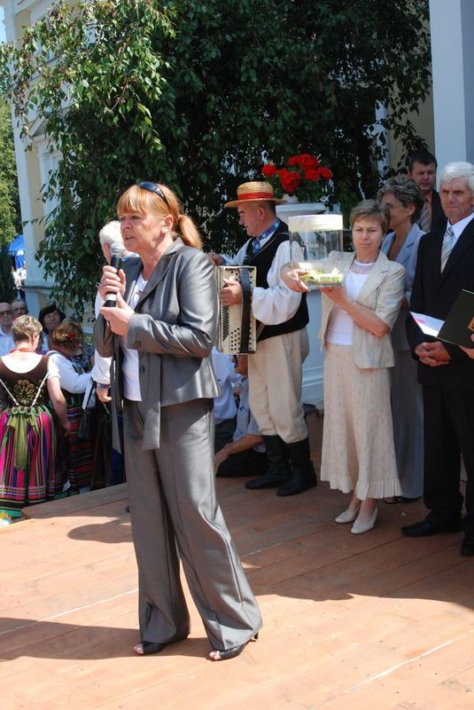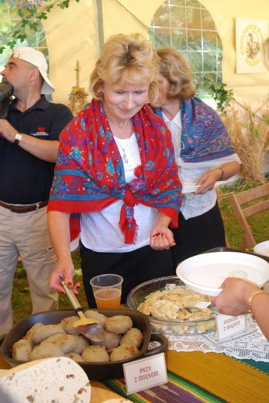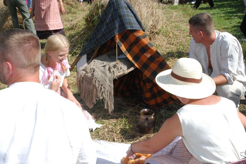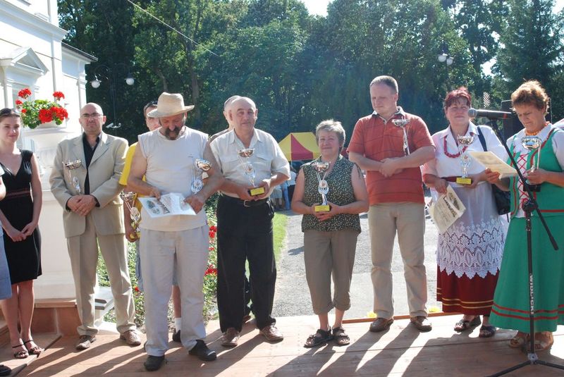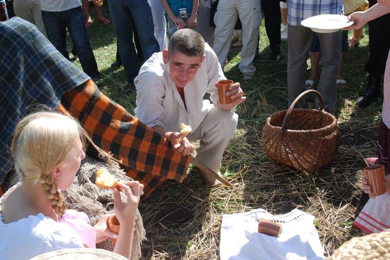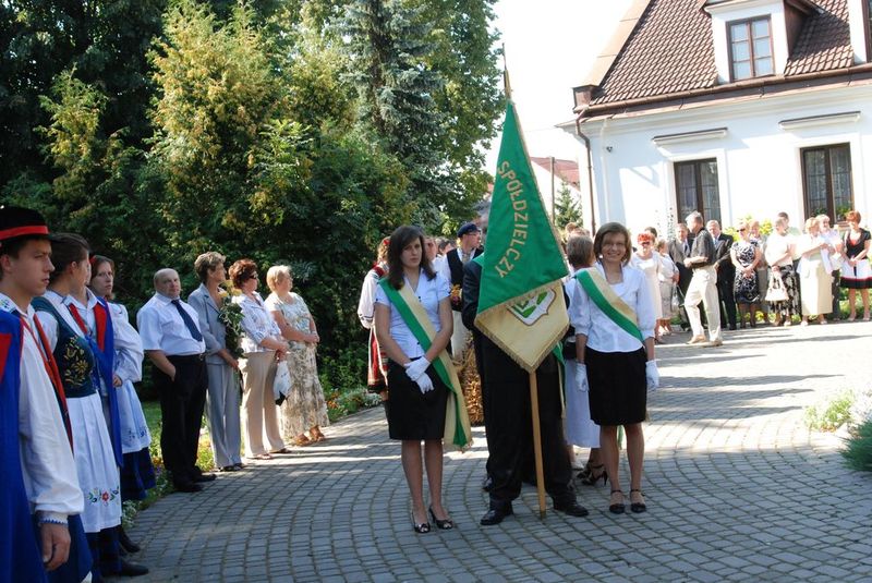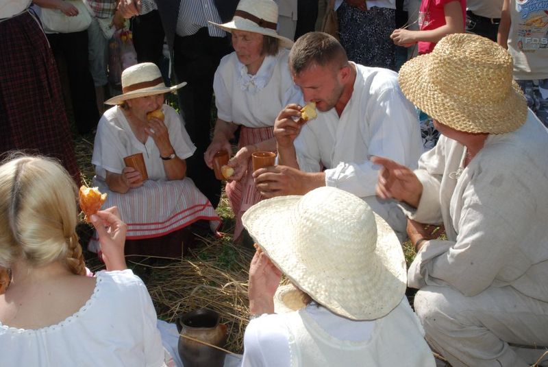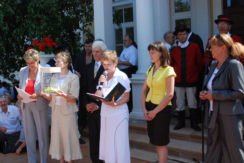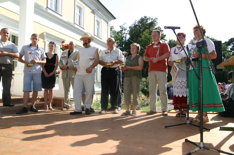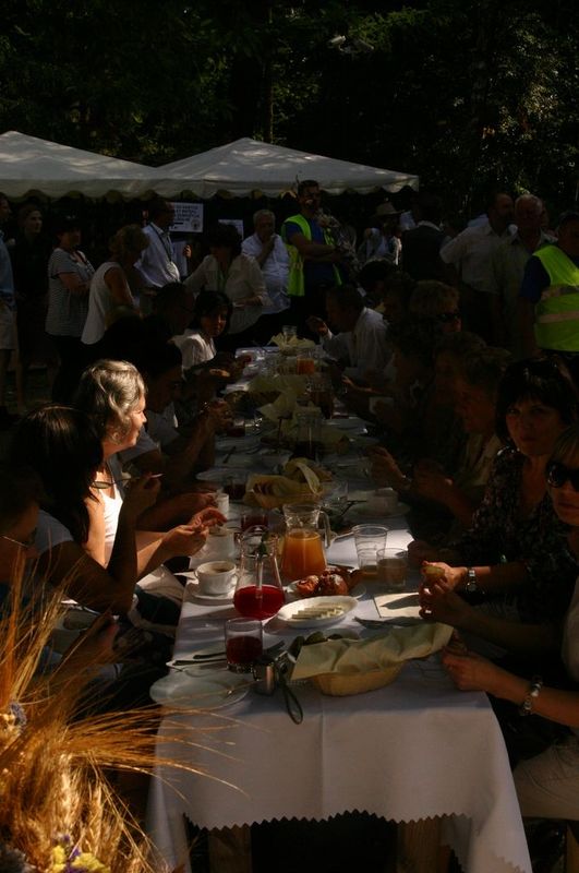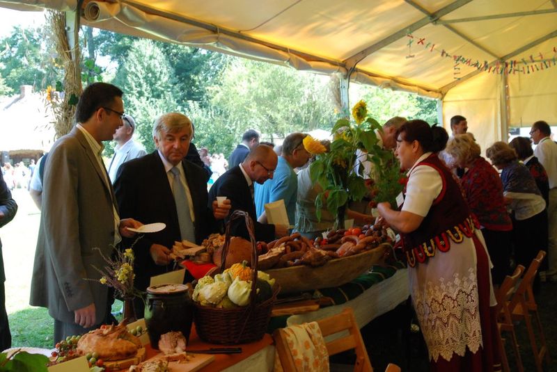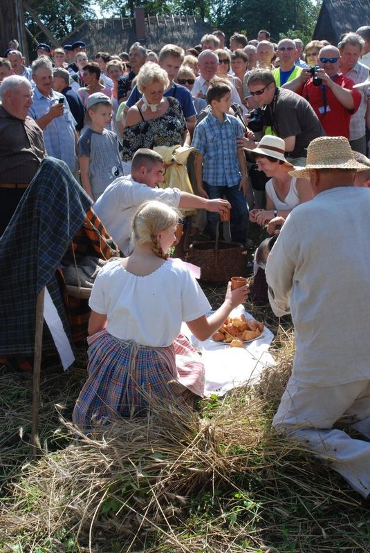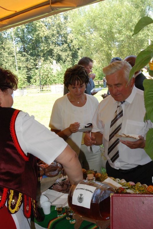 Po dojściu do dworu najmłodsza żniwiarka złożyła chleb na ręce gospodarzy dożynek - Dyrektor Muzeum Doroty Łapiak i Starosty Powiatu Wysokomazowieckiego Bogdana Zielińskiego. Starostowie połamali się chlebem z widzami i zaprosili po ustawieniu wieńca żniwnego na stole żniwiarzy do posiłku. Podczas posiłku żniwiarzy, gospodarzy dożynek i gości śpiewały zespoły „Kalina” i „Klekociaki”.