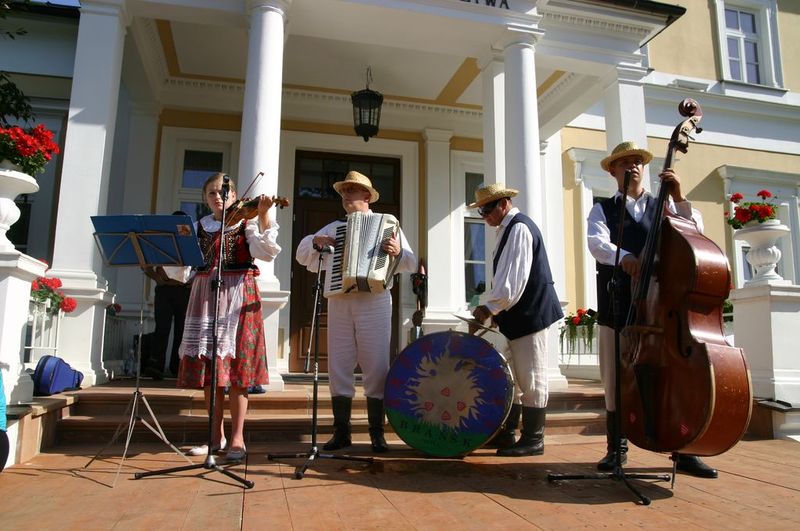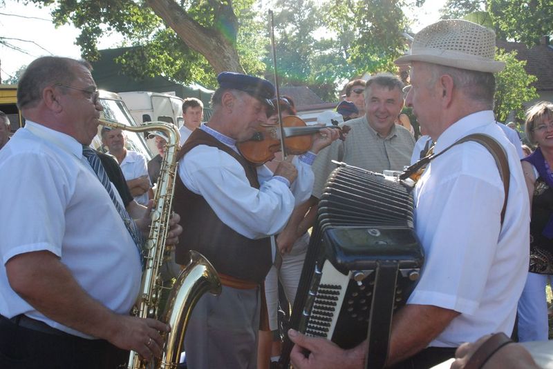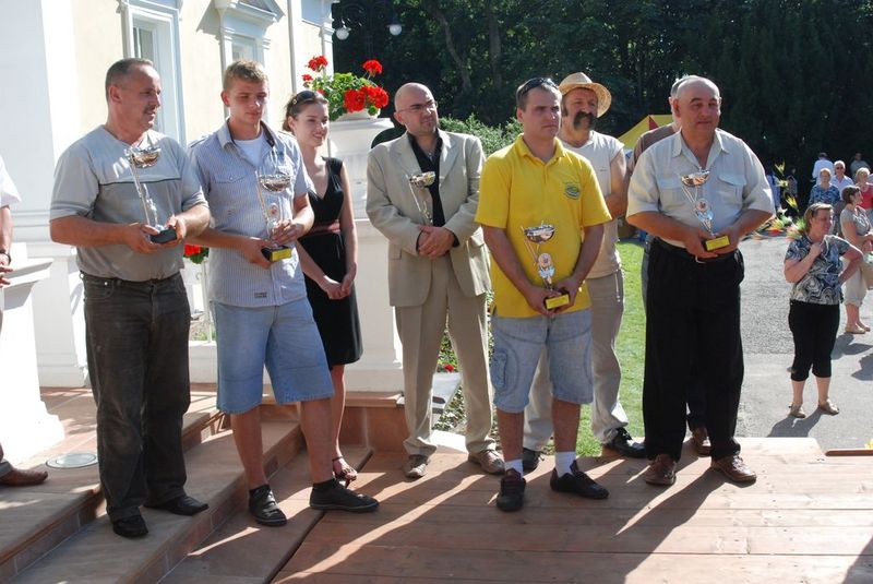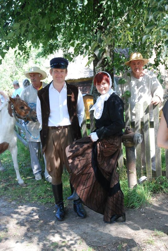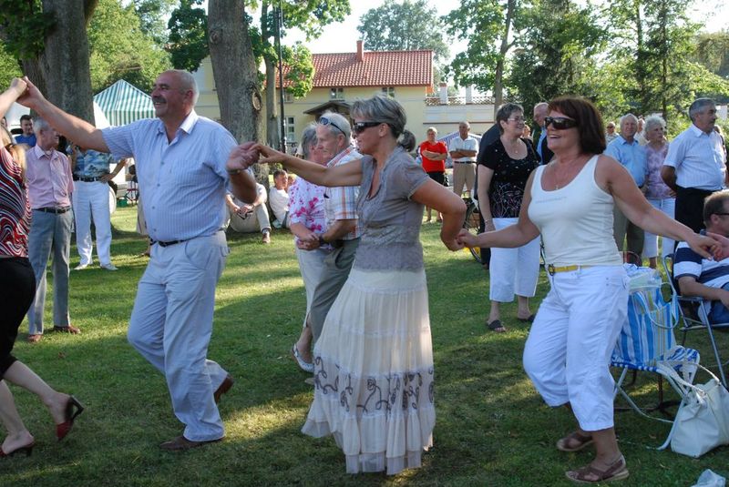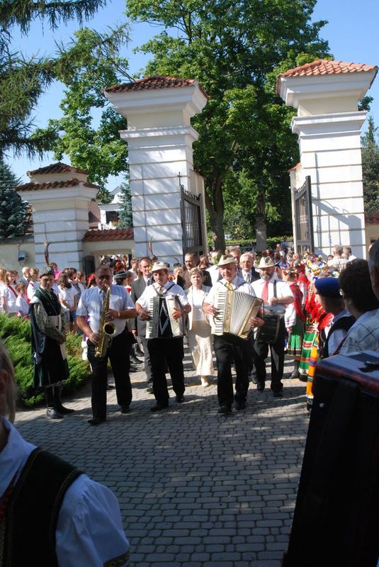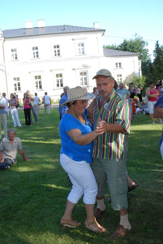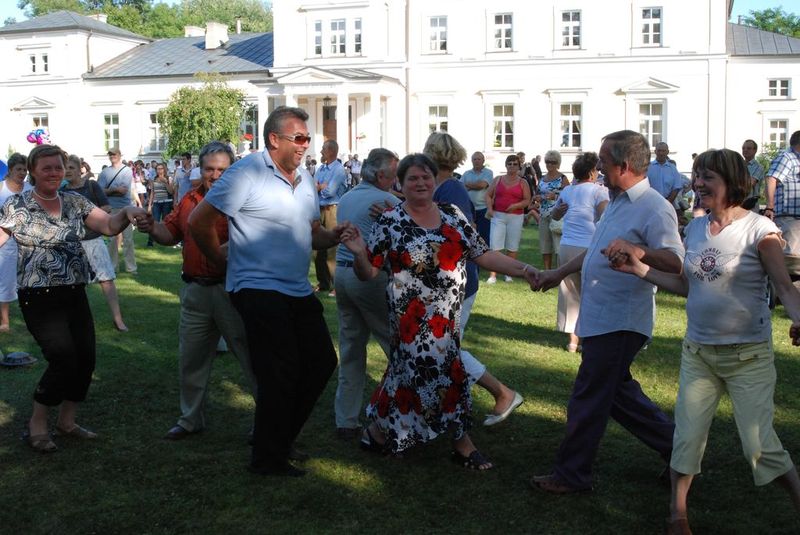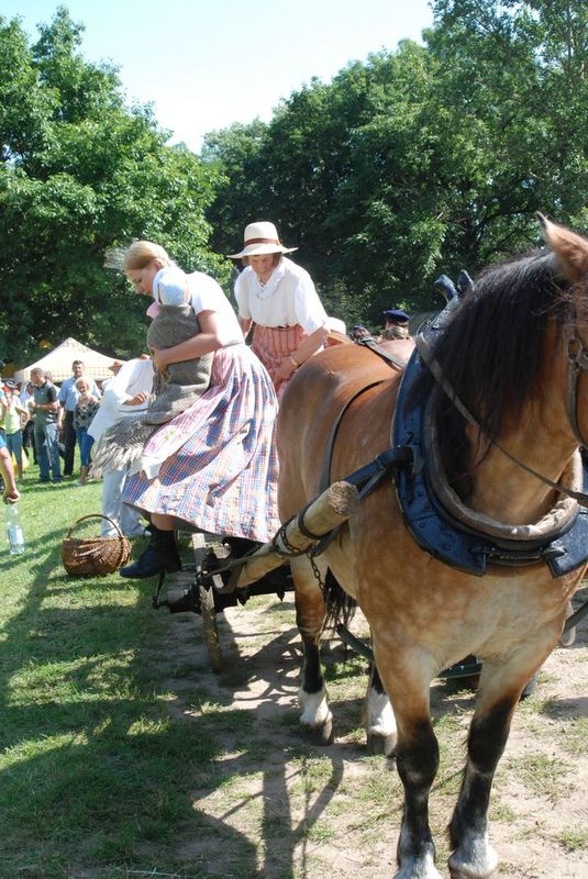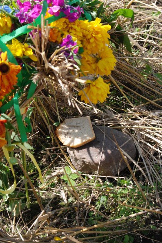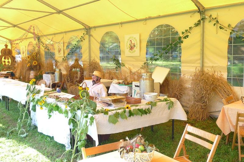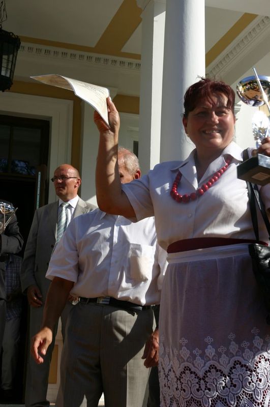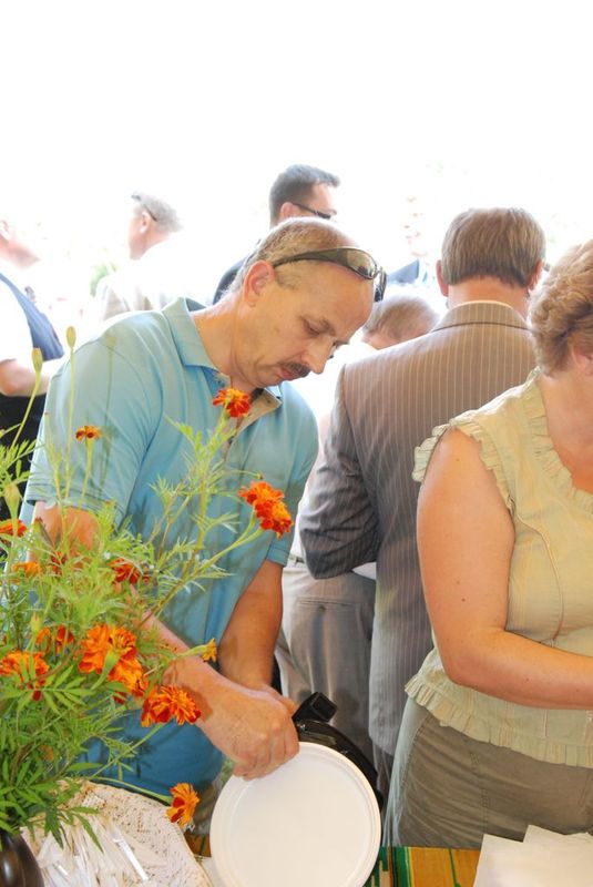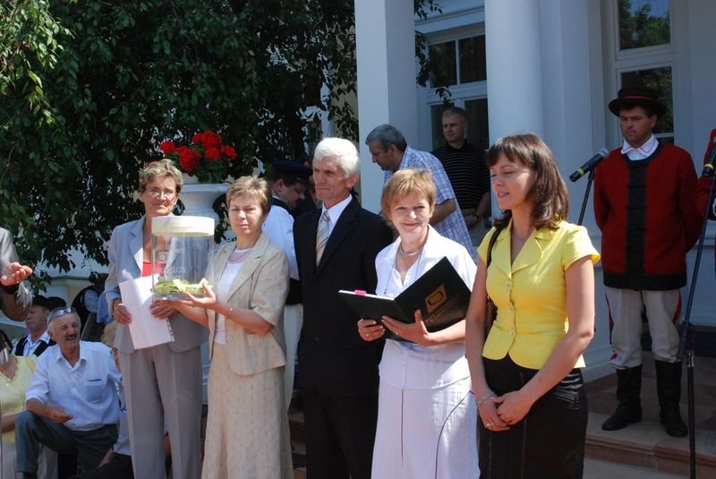 Po dojściu do dworu najmłodsza żniwiarka złożyła chleb na ręce gospodarzy dożynek - Dyrektor Muzeum Doroty Łapiak i Starosty Powiatu Wysokomazowieckiego Bogdana Zielińskiego. Starostowie połamali się chlebem z widzami i zaprosili po ustawieniu wieńca żniwnego na stole żniwiarzy do posiłku. Podczas posiłku żniwiarzy, gospodarzy dożynek i gości śpiewały zespoły „Kalina” i „Klekociaki”.