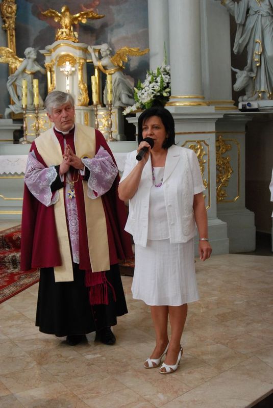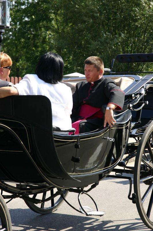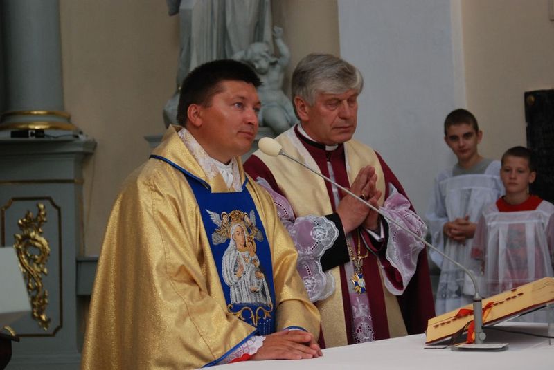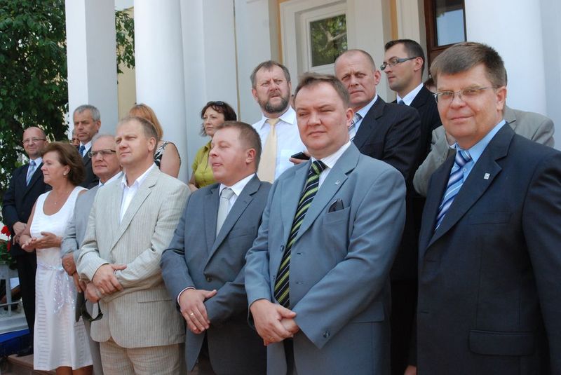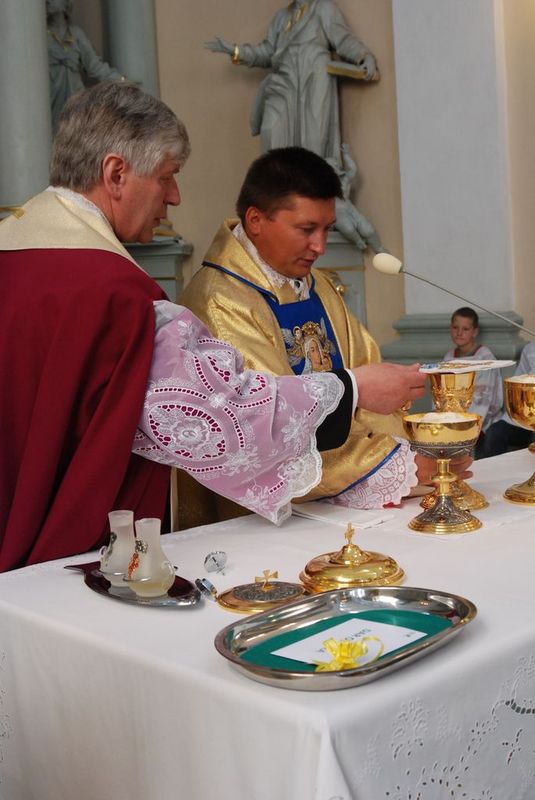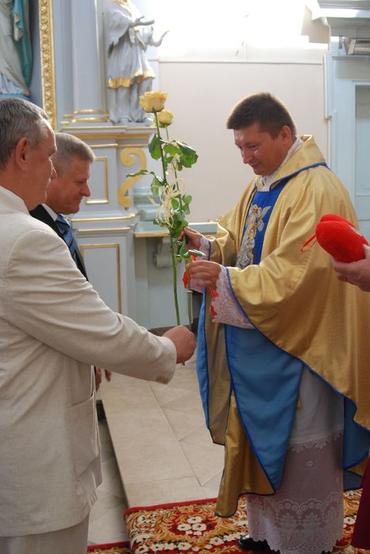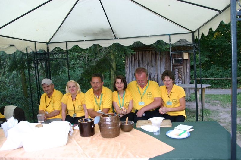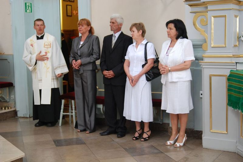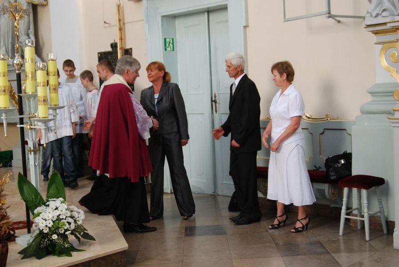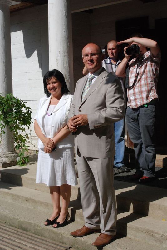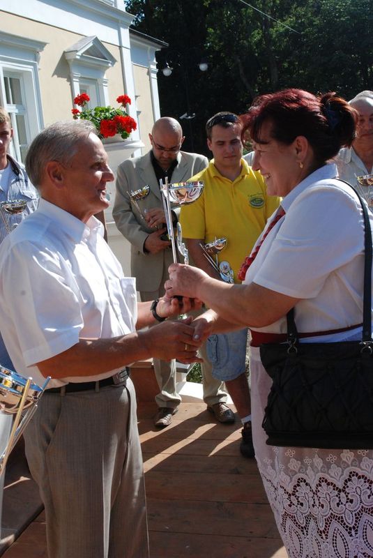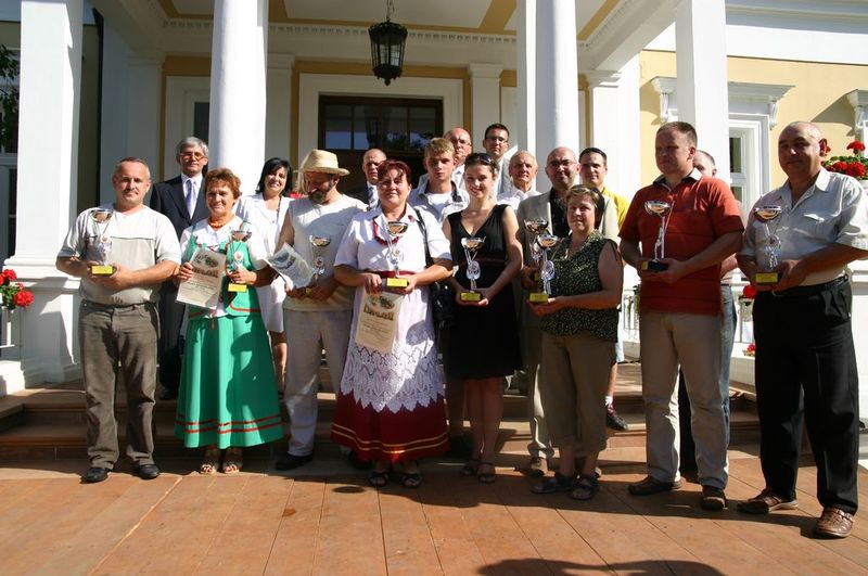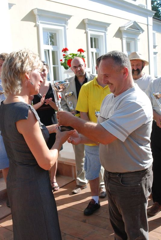 Po dojściu do dworu najmłodsza żniwiarka złożyła chleb na ręce gospodarzy dożynek - Dyrektor Muzeum Doroty Łapiak i Starosty Powiatu Wysokomazowieckiego Bogdana Zielińskiego. Starostowie połamali się chlebem z widzami i zaprosili po ustawieniu wieńca żniwnego na stole żniwiarzy do posiłku. Podczas posiłku żniwiarzy, gospodarzy dożynek i gości śpiewały zespoły „Kalina” i „Klekociaki”.