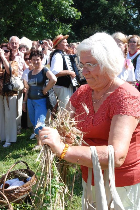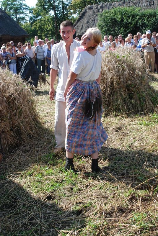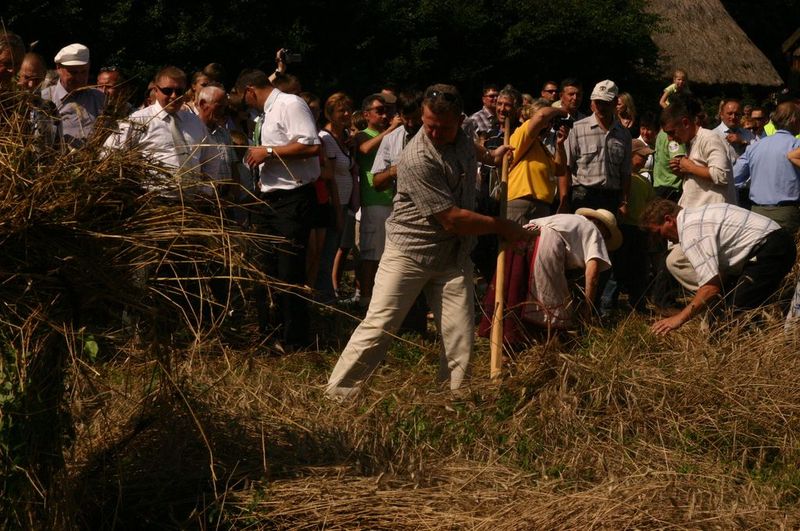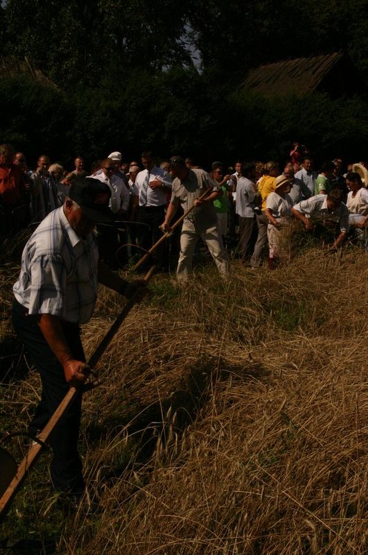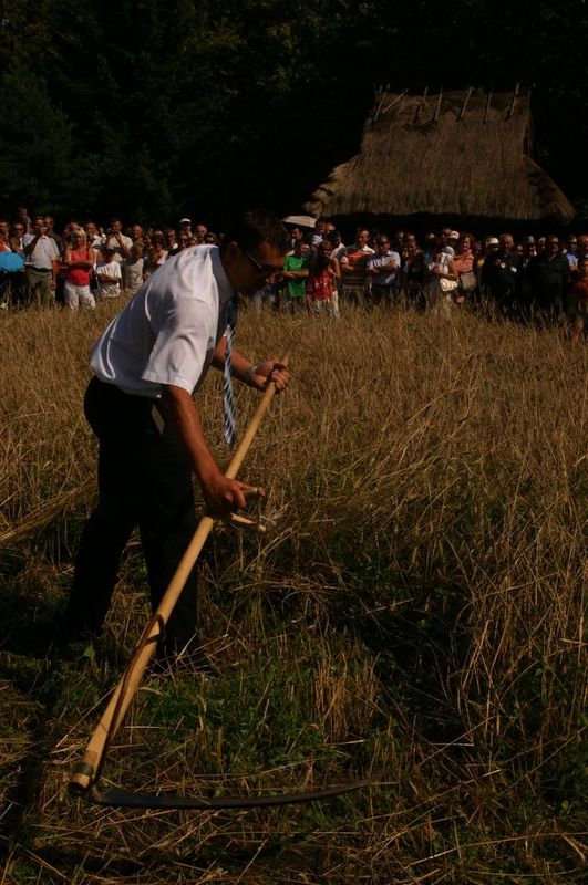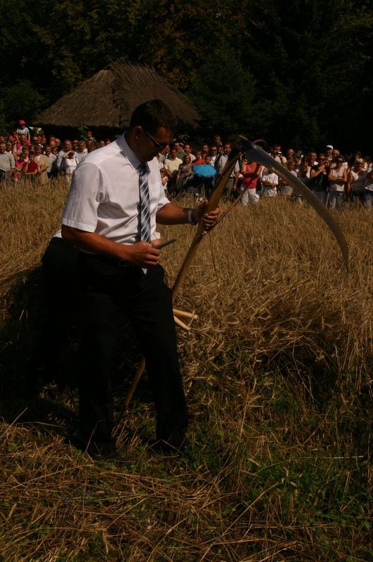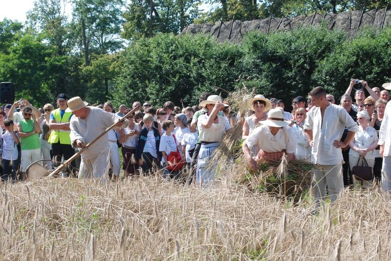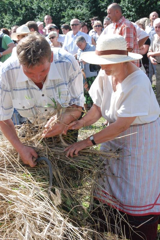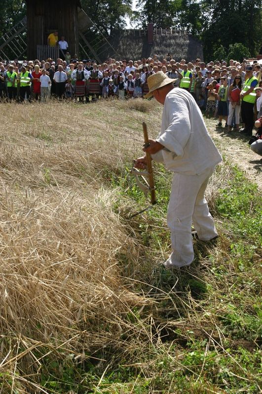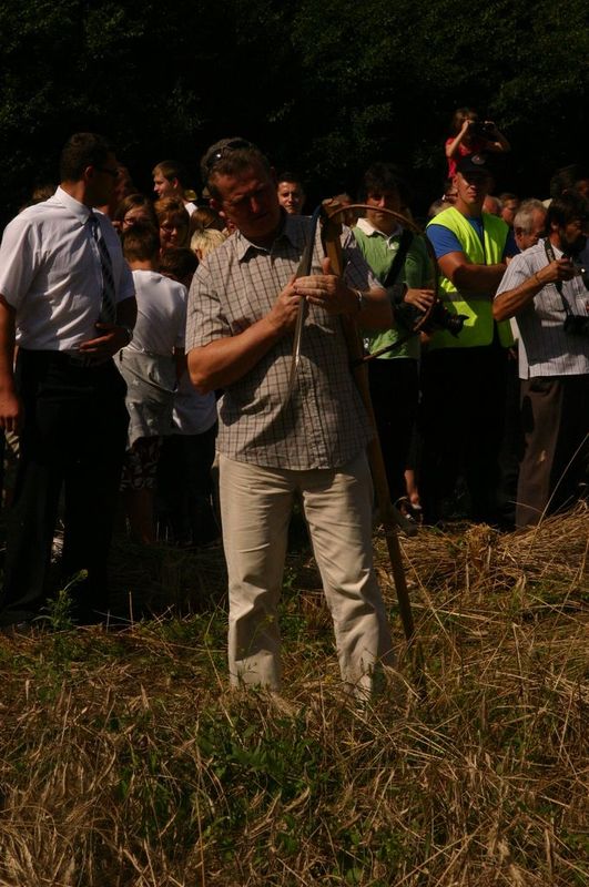 Z tejże zagrody w pole wyruszył orszak żniwny. Na wozie drabiniastym jechali kośnicy z kosami, żniwiarki z sierpami, kołyską polową i dzieckiem - niemowlakiem. Za furmanką szły zespoły folklorystyczne w strojach ludowych „Kalina” z Żurobic i „Klekociaki” z Bociek. Mężczyźni byli ubrani w lniane białe koszule i spodnie oraz słomiane kapelusze a kobiety w lniane koszule, spódnice, fartuchy i słomiane kapelusze. Po przejeździe w pole najstarszy kośnik przeżegnawszy się rozpoczął koszenie, panie podbierały zboże i żyły sierpami. Żęte zboże ustawiano w „dziesiątki”. Najmłodsza żniwiarka opiekowała się dzieckiem ułożonym w kołysce polowej. Zespoły folklorystyczne śpiewały stosowne pieśni żniwne. Do koszenia kosą włączyli się licznie zgromadzeni widzowie. Po skoszeniu połowy zagonu żniwiarze zasiedli do posiłku składającego się z kawy z mlekiem i pampuchów (ciasta drożdżowego smażonego na oleju). Po zakończonym koszeniu na zostawionym małym kawałku żyta panie robiły przepiórkę. Przepiórka składa się z 3 lub 4 warkoczy zboża zdobionego kwiatami polnymi lub ogrodowymi. Starano się nadać jej kształt trójnożny, który posiadał znaczenie płodnościowe. Niekiedy przepiórki okładano jednym, do trzech rzędów kół z kamieni, wytyczając do niej dróżkę dla zające lub przepiórki. W środku na kamieniu symbolizującym ołtarz na białej chusteczce kładziono chleb. Miał on być dla przepiórki i dla myszy aby z pola nie szły do stodoły albo aby go nigdy nie zabrakło. Kamień (ołtarz) i chleb (ofiara) to stary pogański zwyczaj ofiary duchowi zamieszkującemu zboże. Miał on znaczenie magiczne - pomagał na ból zęba, leczył wymowę dzieci, kobiety ciężarne zbierały chleb z 3 przepiórek i spożywały przed porodem. Po przystrojeniu klękano i odmawiano „Ojcze Nasz…” i składano prośby do Boga o opiekę nad zbożem w przyszłym roku. Przepiórka zrobiona w polu przez żniwiarki została oborana przez młodych wysokich mężczyzn najmłodszą żniwiarką. Oboranie polegało na przeciągnięciu gołym tyłkiem 3 razy po rżysku. Miało to znaczenie magiczne - przekazanie ziemi przez organy płciowe młodej, obowiązkowo cnotliwej dziewczyny siłą płodności. Gdyby dziewczyna była pozbawiona cnoty groziłoby to w następnym roku nieurodzajem. Po oboraniu przepiórki na pole na wozie ciągniętym przez traktor Ursus C-45 z 1959 roku, wjechali mężczyźni w lnianych koszulach i spodniach w słomianych kapeluszach do omłotów do sterty zboża. Omłoty zostały dokonane za pomocą młocarni „Warmianka” z 1984 roku napędzaną silnikiem parowym - lokomobilą z 1922 roku opalaną drewnem. Po omłotach orszak żniwny ruszył do dworu do gospodarzy dożynek. Przy śpiewie „Plon, niesiemy plon…” najmłodsza żniwiarka którą oborywano przepiórkę niosła bochen chleba wypieczony w piekarni „Kobus” w Ciechanowcu, a 2 chłopców i 2 dziewczyny z zespołu „Klekociaki” niosło wieniec dożynkowy. Obrzęd dożynkowy jest związany z dworem od połowy XIX wieku. W czasie międzywojennym zwyczaj ten przejął Kościół i władze państwowe i tak to trwa do dziś. Pierwotnie był to wieniec niesiony na głowie przez „postatnicę” - najbardziej „wydajną” żniwiarkę. Później (w XX w) wieniec był robiony na kształt wieńca na głowie o kształcie koła u podstawy z półkoliście wygiętymi na górze warkoczami ze zbóż. Taki też wieniec był niesiony w pochodzie żniwnym na Święcie Chleba w Ciechanowcu. Zwieńczony był na górze krzyżem.