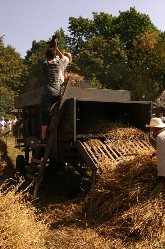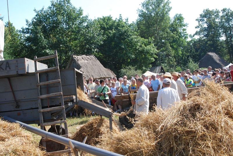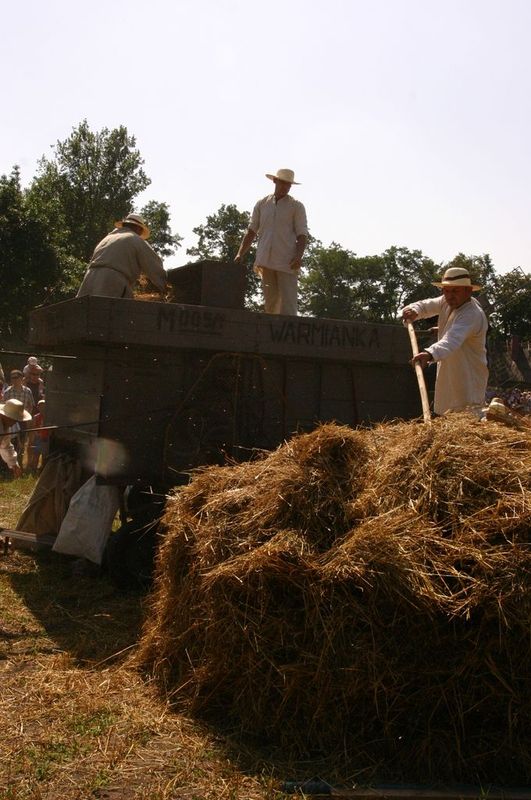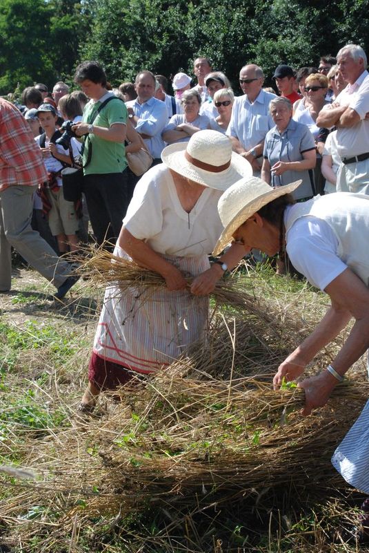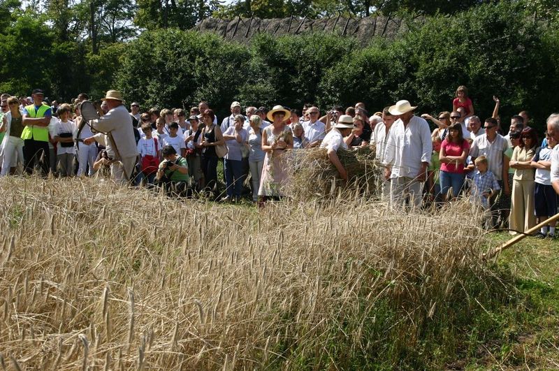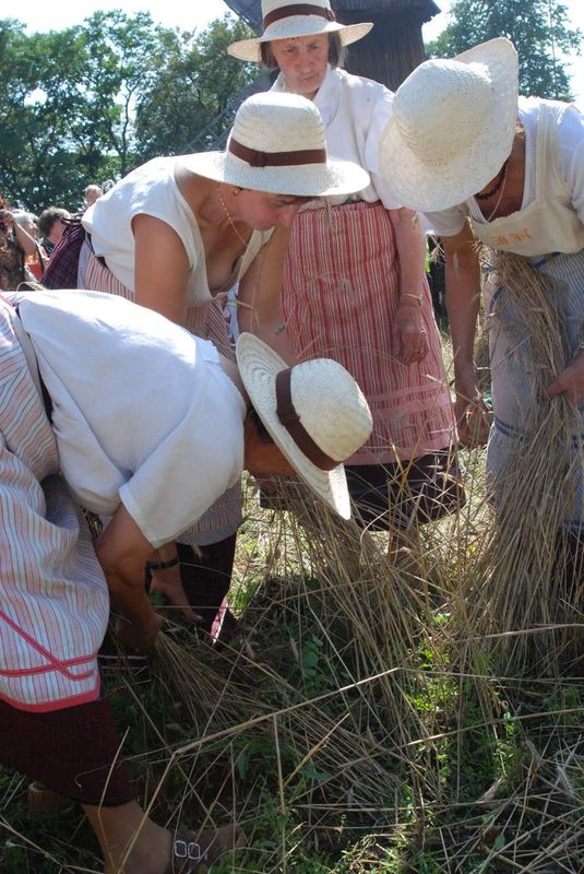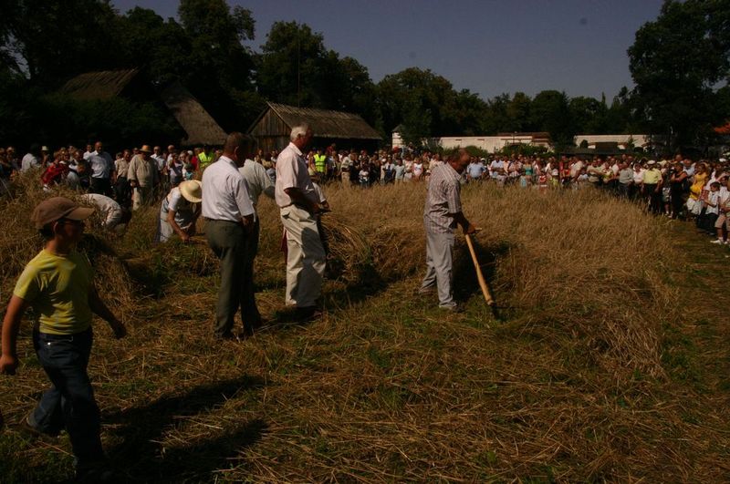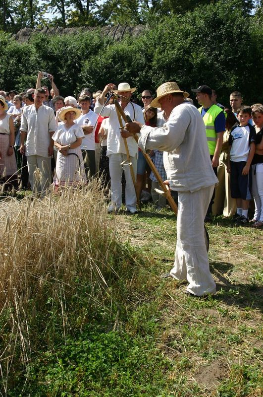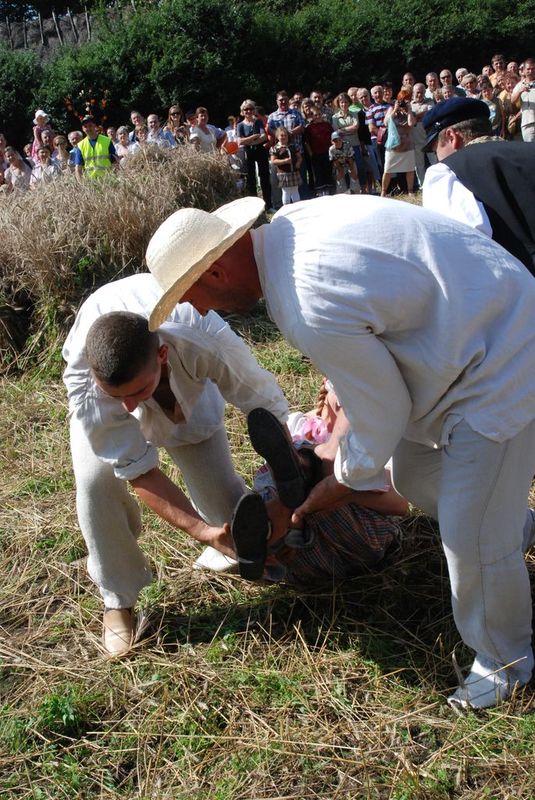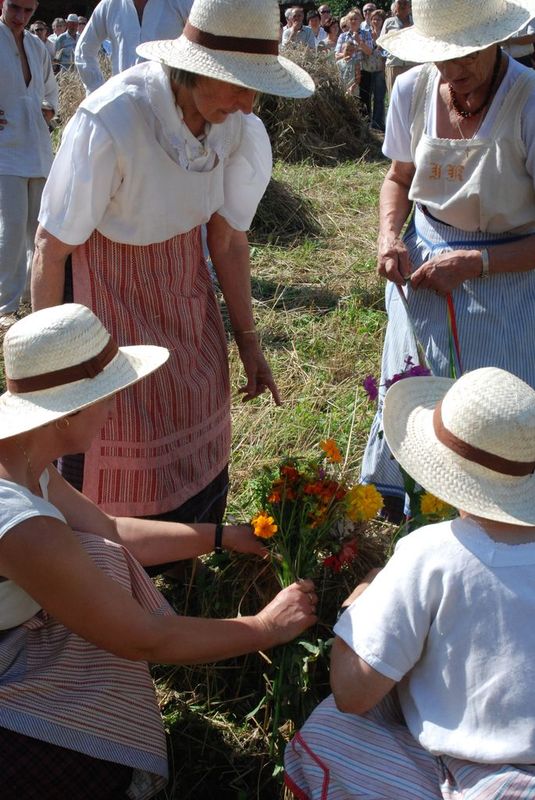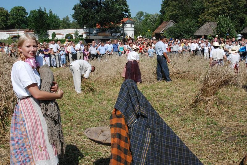 Z tejże zagrody w pole wyruszył orszak żniwny. Na wozie drabiniastym jechali kośnicy z kosami, żniwiarki z sierpami, kołyską polową i dzieckiem - niemowlakiem. Za furmanką szły zespoły folklorystyczne w strojach ludowych „Kalina” z Żurobic i „Klekociaki” z Bociek. Mężczyźni byli ubrani w lniane białe koszule i spodnie oraz słomiane kapelusze a kobiety w lniane koszule, spódnice, fartuchy i słomiane kapelusze. Po przejeździe w pole najstarszy kośnik przeżegnawszy się rozpoczął koszenie, panie podbierały zboże i żyły sierpami. Żęte zboże ustawiano w „dziesiątki”. Najmłodsza żniwiarka opiekowała się dzieckiem ułożonym w kołysce polowej. Zespoły folklorystyczne śpiewały stosowne pieśni żniwne. Do koszenia kosą włączyli się licznie zgromadzeni widzowie. Po skoszeniu połowy zagonu żniwiarze zasiedli do posiłku składającego się z kawy z mlekiem i pampuchów (ciasta drożdżowego smażonego na oleju). Po zakończonym koszeniu na zostawionym małym kawałku żyta panie robiły przepiórkę. Przepiórka składa się z 3 lub 4 warkoczy zboża zdobionego kwiatami polnymi lub ogrodowymi. Starano się nadać jej kształt trójnożny, który posiadał znaczenie płodnościowe. Niekiedy przepiórki okładano jednym, do trzech rzędów kół z kamieni, wytyczając do niej dróżkę dla zające lub przepiórki. W środku na kamieniu symbolizującym ołtarz na białej chusteczce kładziono chleb. Miał on być dla przepiórki i dla myszy aby z pola nie szły do stodoły albo aby go nigdy nie zabrakło. Kamień (ołtarz) i chleb (ofiara) to stary pogański zwyczaj ofiary duchowi zamieszkującemu zboże. Miał on znaczenie magiczne - pomagał na ból zęba, leczył wymowę dzieci, kobiety ciężarne zbierały chleb z 3 przepiórek i spożywały przed porodem. Po przystrojeniu klękano i odmawiano „Ojcze Nasz…” i składano prośby do Boga o opiekę nad zbożem w przyszłym roku. Przepiórka zrobiona w polu przez żniwiarki została oborana przez młodych wysokich mężczyzn najmłodszą żniwiarką. Oboranie polegało na przeciągnięciu gołym tyłkiem 3 razy po rżysku. Miało to znaczenie magiczne - przekazanie ziemi przez organy płciowe młodej, obowiązkowo cnotliwej dziewczyny siłą płodności. Gdyby dziewczyna była pozbawiona cnoty groziłoby to w następnym roku nieurodzajem. Po oboraniu przepiórki na pole na wozie ciągniętym przez traktor Ursus C-45 z 1959 roku, wjechali mężczyźni w lnianych koszulach i spodniach w słomianych kapeluszach do omłotów do sterty zboża. Omłoty zostały dokonane za pomocą młocarni „Warmianka” z 1984 roku napędzaną silnikiem parowym - lokomobilą z 1922 roku opalaną drewnem. Po omłotach orszak żniwny ruszył do dworu do gospodarzy dożynek. Przy śpiewie „Plon, niesiemy plon…” najmłodsza żniwiarka którą oborywano przepiórkę niosła bochen chleba wypieczony w piekarni „Kobus” w Ciechanowcu, a 2 chłopców i 2 dziewczyny z zespołu „Klekociaki” niosło wieniec dożynkowy. Obrzęd dożynkowy jest związany z dworem od połowy XIX wieku. W czasie międzywojennym zwyczaj ten przejął Kościół i władze państwowe i tak to trwa do dziś. Pierwotnie był to wieniec niesiony na głowie przez „postatnicę” - najbardziej „wydajną” żniwiarkę. Później (w XX w) wieniec był robiony na kształt wieńca na głowie o kształcie koła u podstawy z półkoliście wygiętymi na górze warkoczami ze zbóż. Taki też wieniec był niesiony w pochodzie żniwnym na Święcie Chleba w Ciechanowcu. Zwieńczony był na górze krzyżem.