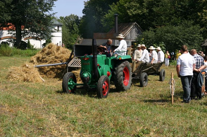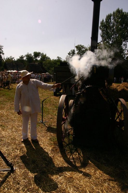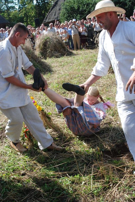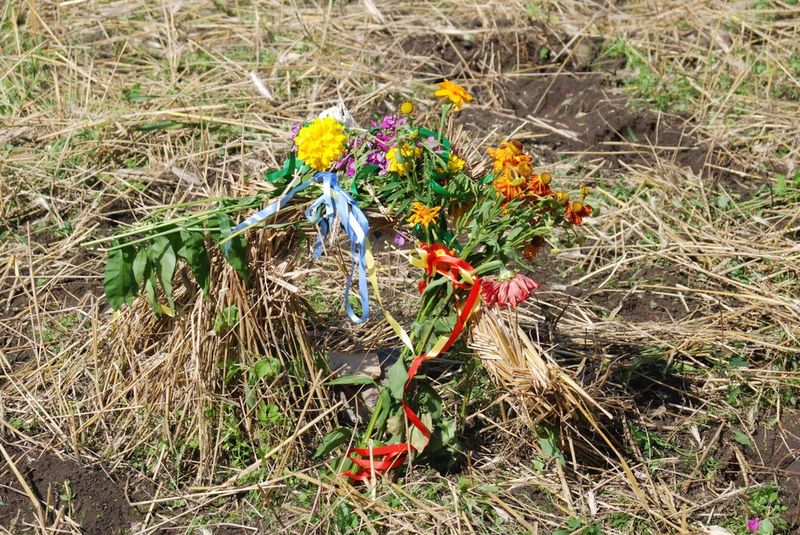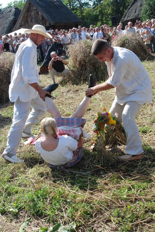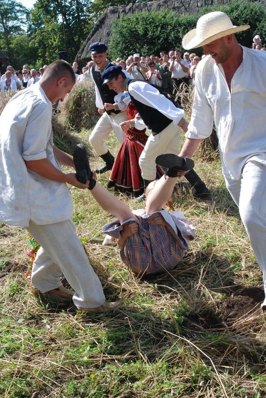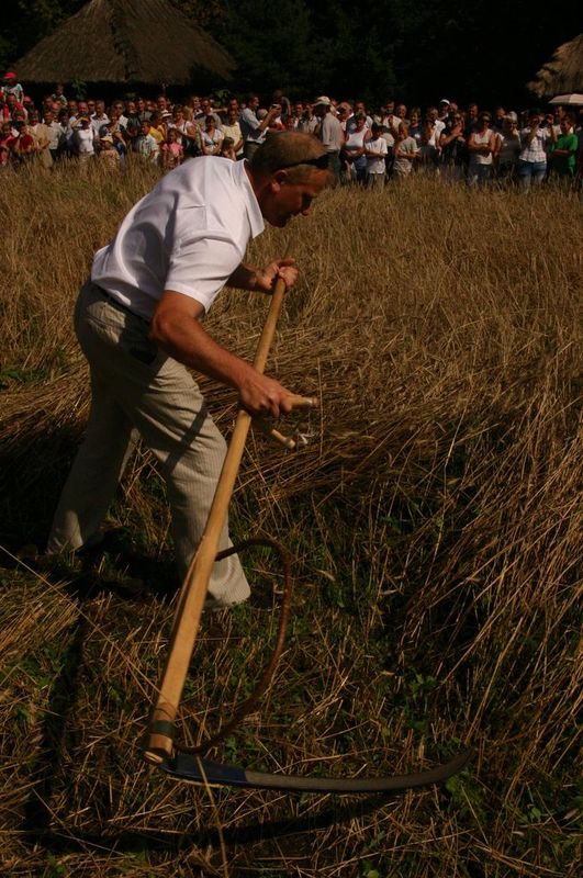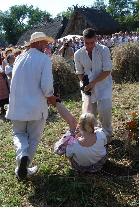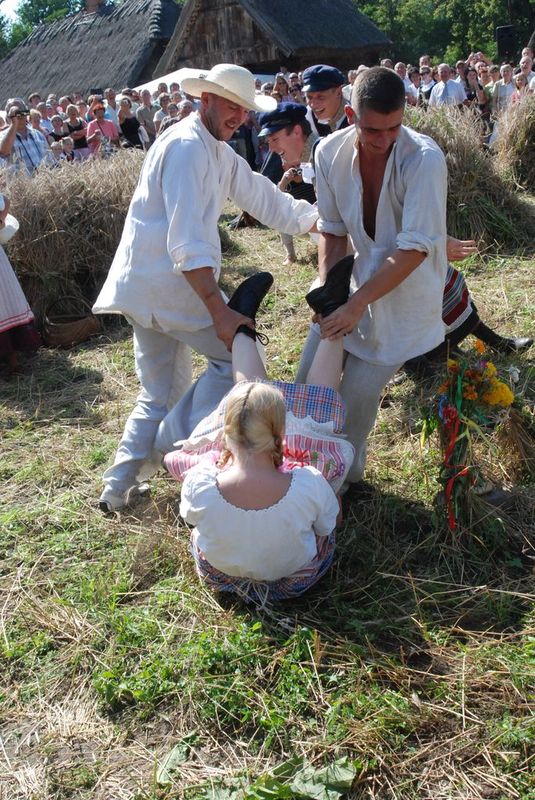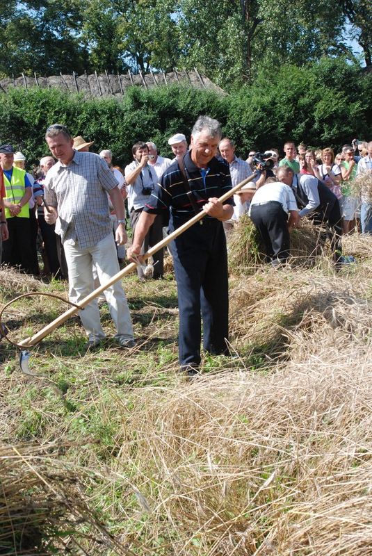 Z tejże zagrody w pole wyruszył orszak żniwny. Na wozie drabiniastym jechali kośnicy z kosami, żniwiarki z sierpami, kołyską polową i dzieckiem - niemowlakiem. Za furmanką szły zespoły folklorystyczne w strojach ludowych „Kalina” z Żurobic i „Klekociaki” z Bociek. Mężczyźni byli ubrani w lniane białe koszule i spodnie oraz słomiane kapelusze a kobiety w lniane koszule, spódnice, fartuchy i słomiane kapelusze. Po przejeździe w pole najstarszy kośnik przeżegnawszy się rozpoczął koszenie, panie podbierały zboże i żyły sierpami. Żęte zboże ustawiano w „dziesiątki”. Najmłodsza żniwiarka opiekowała się dzieckiem ułożonym w kołysce polowej. Zespoły folklorystyczne śpiewały stosowne pieśni żniwne. Do koszenia kosą włączyli się licznie zgromadzeni widzowie. Po skoszeniu połowy zagonu żniwiarze zasiedli do posiłku składającego się z kawy z mlekiem i pampuchów (ciasta drożdżowego smażonego na oleju). Po zakończonym koszeniu na zostawionym małym kawałku żyta panie robiły przepiórkę. Przepiórka składa się z 3 lub 4 warkoczy zboża zdobionego kwiatami polnymi lub ogrodowymi. Starano się nadać jej kształt trójnożny, który posiadał znaczenie płodnościowe. Niekiedy przepiórki okładano jednym, do trzech rzędów kół z kamieni, wytyczając do niej dróżkę dla zające lub przepiórki. W środku na kamieniu symbolizującym ołtarz na białej chusteczce kładziono chleb. Miał on być dla przepiórki i dla myszy aby z pola nie szły do stodoły albo aby go nigdy nie zabrakło. Kamień (ołtarz) i chleb (ofiara) to stary pogański zwyczaj ofiary duchowi zamieszkującemu zboże. Miał on znaczenie magiczne - pomagał na ból zęba, leczył wymowę dzieci, kobiety ciężarne zbierały chleb z 3 przepiórek i spożywały przed porodem. Po przystrojeniu klękano i odmawiano „Ojcze Nasz…” i składano prośby do Boga o opiekę nad zbożem w przyszłym roku. Przepiórka zrobiona w polu przez żniwiarki została oborana przez młodych wysokich mężczyzn najmłodszą żniwiarką. Oboranie polegało na przeciągnięciu gołym tyłkiem 3 razy po rżysku. Miało to znaczenie magiczne - przekazanie ziemi przez organy płciowe młodej, obowiązkowo cnotliwej dziewczyny siłą płodności. Gdyby dziewczyna była pozbawiona cnoty groziłoby to w następnym roku nieurodzajem. Po oboraniu przepiórki na pole na wozie ciągniętym przez traktor Ursus C-45 z 1959 roku, wjechali mężczyźni w lnianych koszulach i spodniach w słomianych kapeluszach do omłotów do sterty zboża. Omłoty zostały dokonane za pomocą młocarni „Warmianka” z 1984 roku napędzaną silnikiem parowym - lokomobilą z 1922 roku opalaną drewnem. Po omłotach orszak żniwny ruszył do dworu do gospodarzy dożynek. Przy śpiewie „Plon, niesiemy plon…” najmłodsza żniwiarka którą oborywano przepiórkę niosła bochen chleba wypieczony w piekarni „Kobus” w Ciechanowcu, a 2 chłopców i 2 dziewczyny z zespołu „Klekociaki” niosło wieniec dożynkowy. Obrzęd dożynkowy jest związany z dworem od połowy XIX wieku. W czasie międzywojennym zwyczaj ten przejął Kościół i władze państwowe i tak to trwa do dziś. Pierwotnie był to wieniec niesiony na głowie przez „postatnicę” - najbardziej „wydajną” żniwiarkę. Później (w XX w) wieniec był robiony na kształt wieńca na głowie o kształcie koła u podstawy z półkoliście wygiętymi na górze warkoczami ze zbóż. Taki też wieniec był niesiony w pochodzie żniwnym na Święcie Chleba w Ciechanowcu. Zwieńczony był na górze krzyżem.
