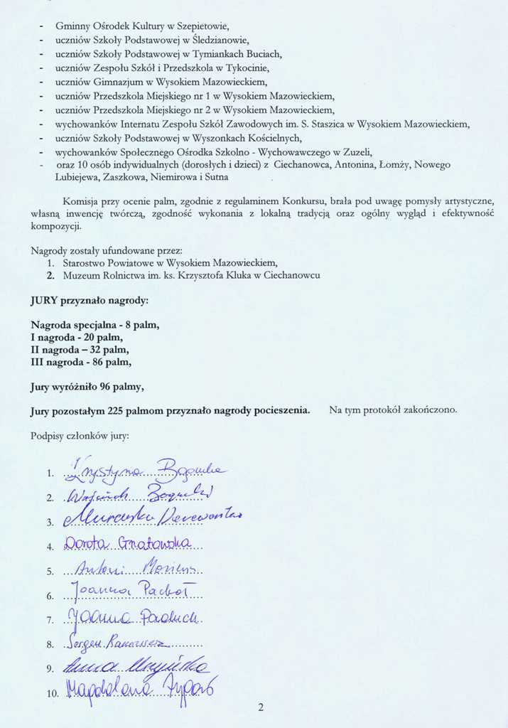 Zbiórka uczestników Konkursu z palmami w dniu 1 kwietnia (w niedzielę) o godz. 9.30 na placu przed plebanią kościoła pw. Trójcy Przenajświętszej. Poniżej protokół z obrad jury oraz wykaz nagrodzonych uczestników.
