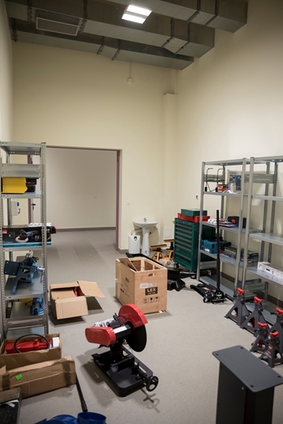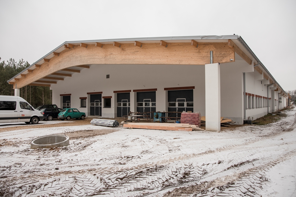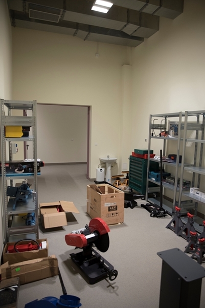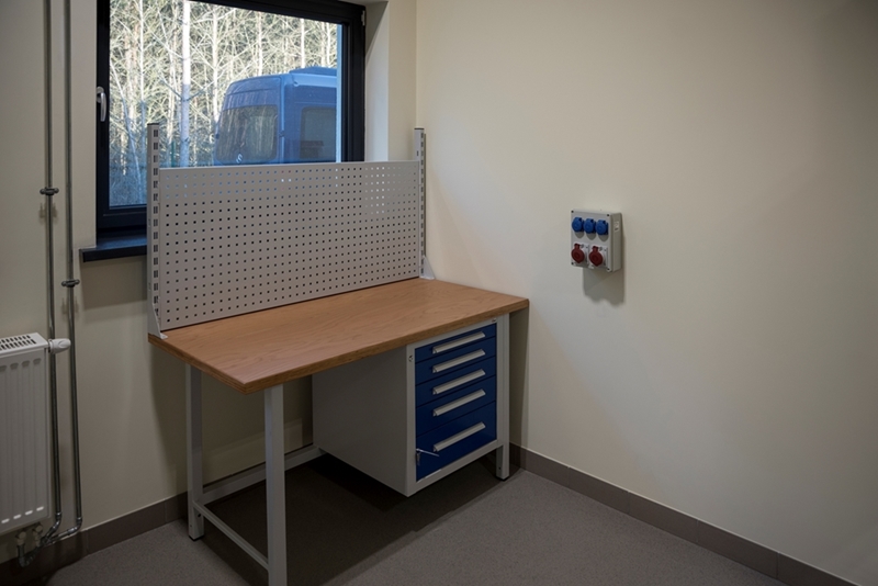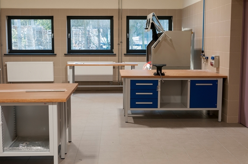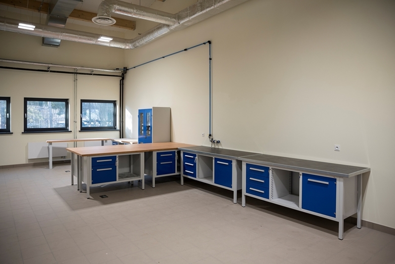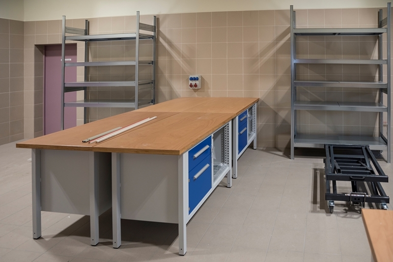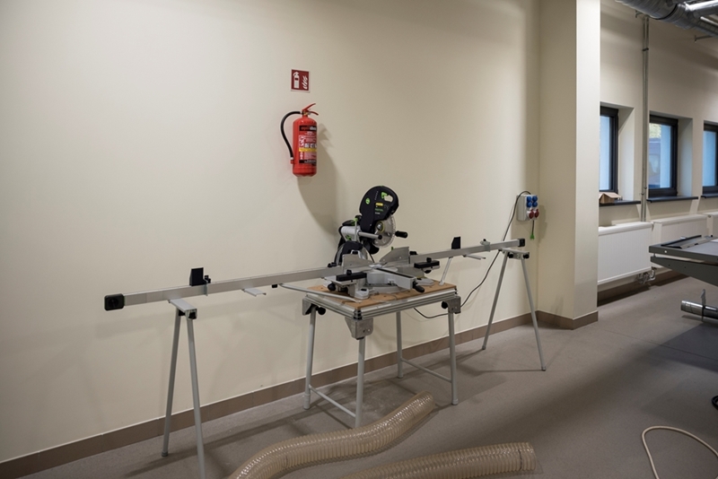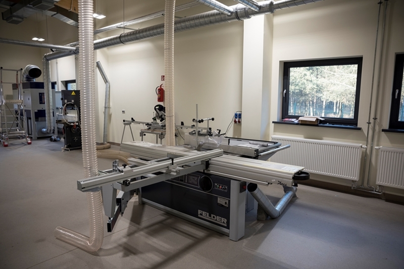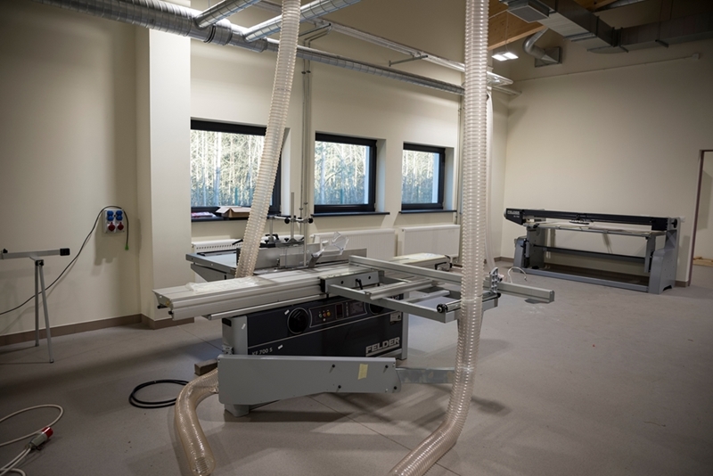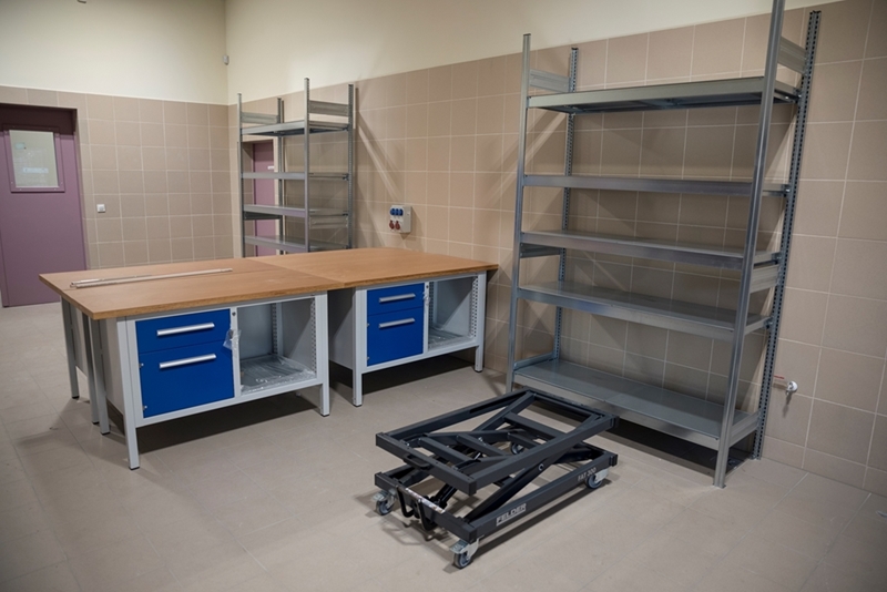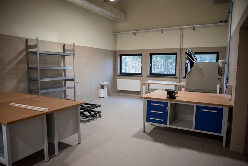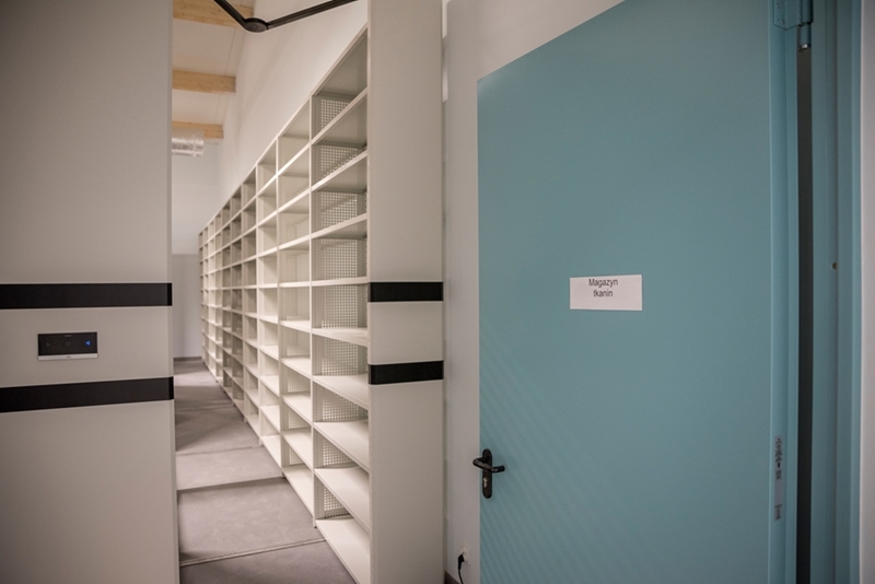 Realizacja zadania obejmuje również zakup do pracowni i magazynów mebli biurowych oraz zestawów komputerowych z oprogramowaniem. Do pracowni digitalizacji zbiorów zostanie zakupiony sprzęt fotograficzny i komputerowy wraz ze sprzętem uzupełniającym m.in. oświetleniem studyjnym i plenerowym, reflektorami, statywami, stojakami oraz obiektywami i lampami błyskowymi. Pracownie techniczne wyposażone będą w sprzęt typu: wiertarka, czopiarka, frezarka, szlifierka taśmowa, pilarka tarczowa, tokarka do drewna, spawarka, sprężarka, piaskarka, strugarka czterostronna, digestorium, myjka ciśnieniowa. W pomieszczeniach magazynowych zainstalowane zostaną nowoczesne, przesuwne i sterowane elektronicznie zestawy regałów o profilu dostosowanym do charakteru poszczególnych magazynów. Dla potrzeb pracowników zostaną zakupione stoły, krzesła oraz szafy ubraniowe. Zakupione również zostaną akumulatorowe wózki podnośnikowe oraz zewnętrzny silos do magazynowania wiórów i trocin. W ramach zadania zostanie wykonane ogrodzenie nowopowstałej infrastruktury.