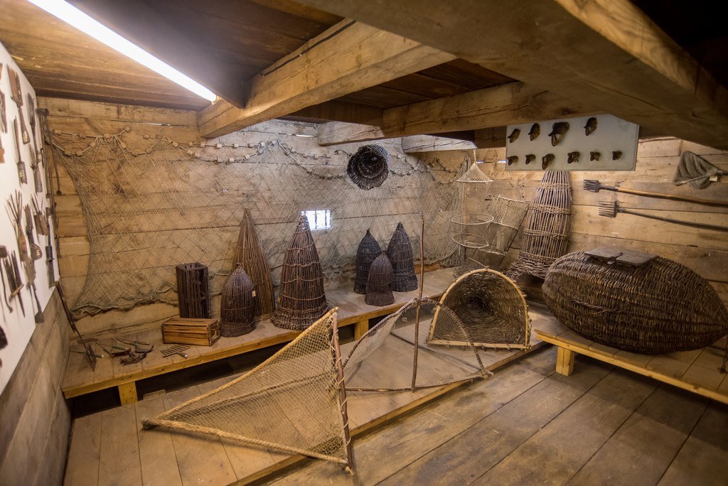 Spichlerz przeniesiony z miejscowości Dąbrowa Wilki, zbudowany w pierwszej połowie XIX wieku. Budynek o konstrukcji zrębowej, wąskofrontowy z podcieniem. Dach czterospadowy kryty słomą. Wewnątrz spichlerza została ulokowana wystawa stała "Rybołówstwo słodkowodne". Na ekspozycji możemy zobaczyć łódź tzw. Dłubankę, przyrządy do połowu ryb - sieć drygawicę, więcierze, wiersze, podbieraki, wsadki i sadze, a także skrzynki do połowu raków. Zaprezentowane zostały też narzędzia do wyrobu sieci oraz kolekcja ościeni metalowych z końca XIX i XX wieku.