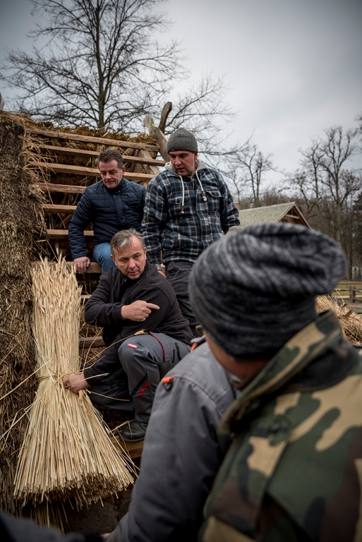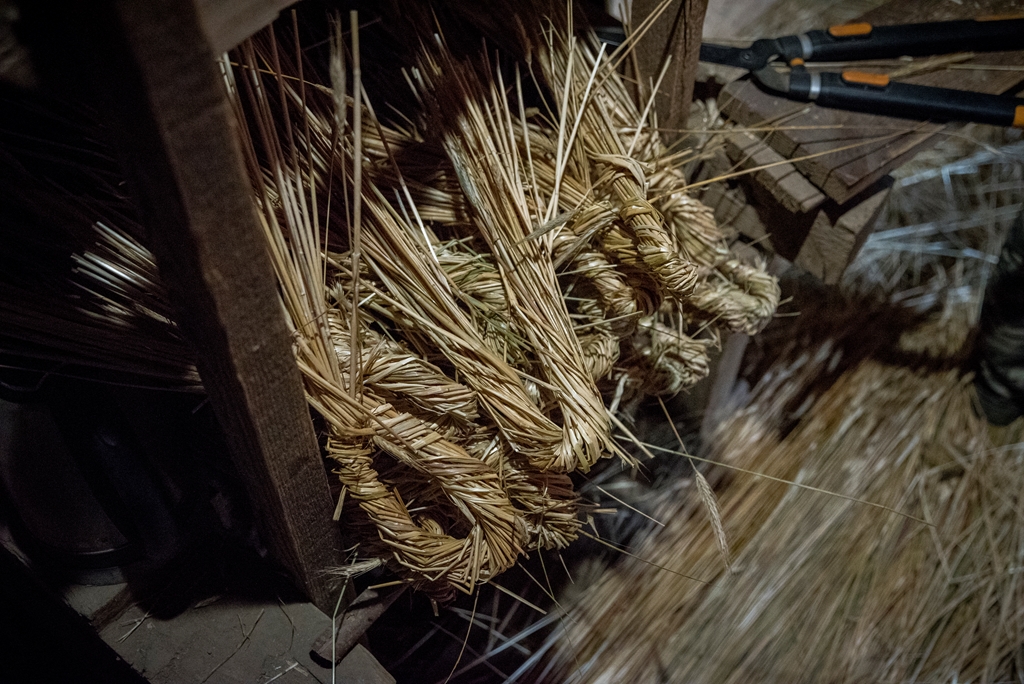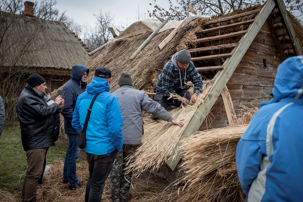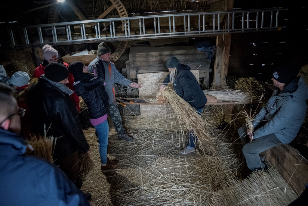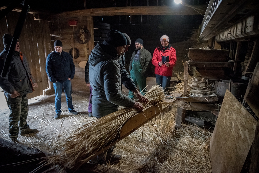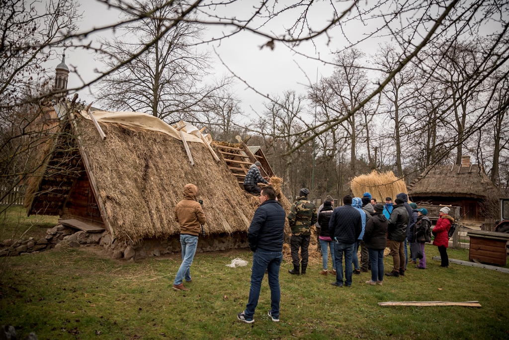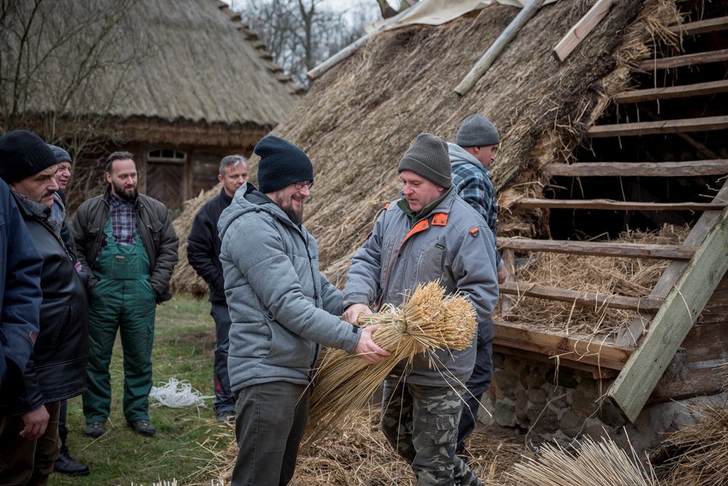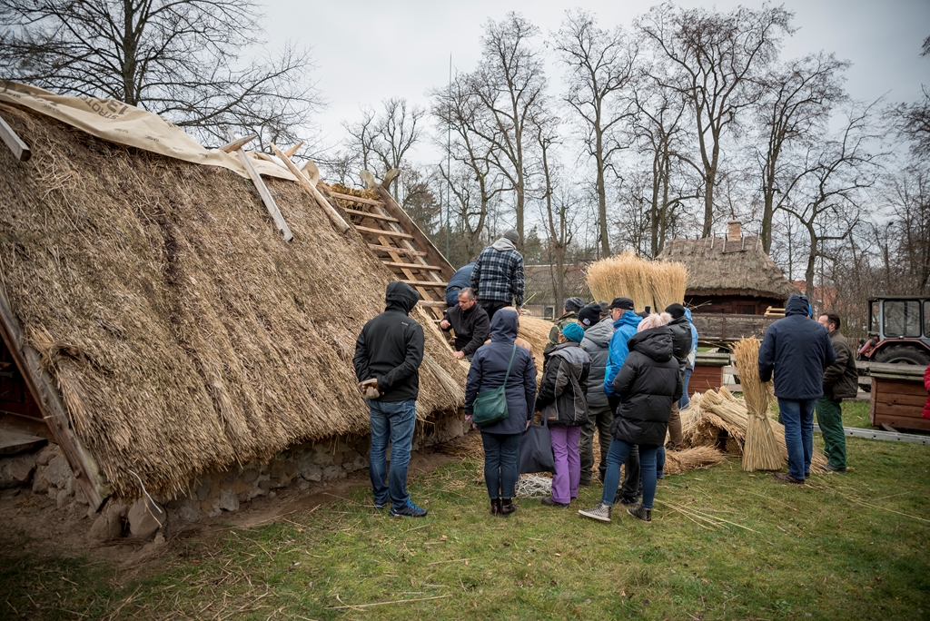 i Piotr Karpiński, rzemieślnicy naszego muzeum. Na początku w stodole uczestnicy szkolili się w wykręcaniu „główczaków” i „strzeszaków”. Są to nazwy dwóch rodzajów snopków używanych do pokrywania dachów na naszym terenie. W trakcie trwania warsztatów toczyły się zażarte dyskusje na tematy związane z naturalnymi pokryciami dachów i wymiany doświadczeń obecnych na spotkaniu „strzecharzy” z Tokarni, Radomia, Opola