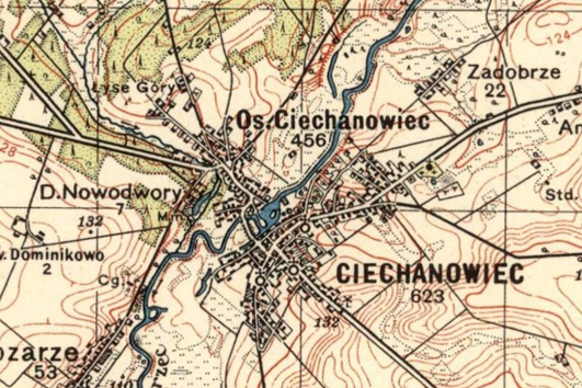3. Mapa pokazująca Ciechanowiec lewobrzeżny – miasto i prawobrzeżny – osadę. . Źródło: Mapa taktyczna Polski 1: 100 00, Pas 38 Słup 35, 1937