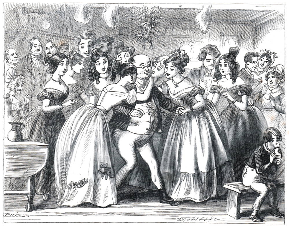 „Gdy Pan Pickwick pocałował czule starszą damę, stał wtedy pod zawieszonym jemiołowym krzewem i niezmiernie zadowolony patrzył na wszystko, co się wkoło niego dzieje. Nagle młoda dama z czarnymi oczami i wydatnym biustem, poszeptawszy coś z innymi młodymi, rzuciła się ochoczo na pana Pickwicka, zarzuciła mu ręce na szyję i pocałowała go w lewy policzek. Nim się pan Pickwick opamiętał, co się właściwie dzieje, otoczyła go cała grupa pięknych kobiet i wszystkie zaczęły go całować…”
