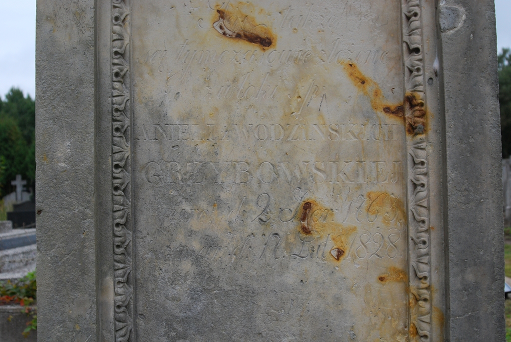 Z tyłu pomnika umieszczono dodatkową inskrypcję dotyczącą czasowego złożenia w grobie zwłok śp. Anieli z Wodzińskich Grzybowskiej (ur. 2.08.1763 r., zm. 17.02.1828 r.) – babki Stefana Ciecierskiego.