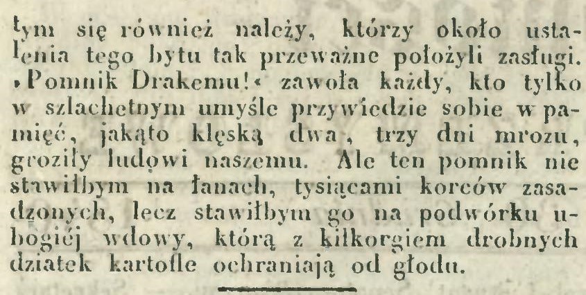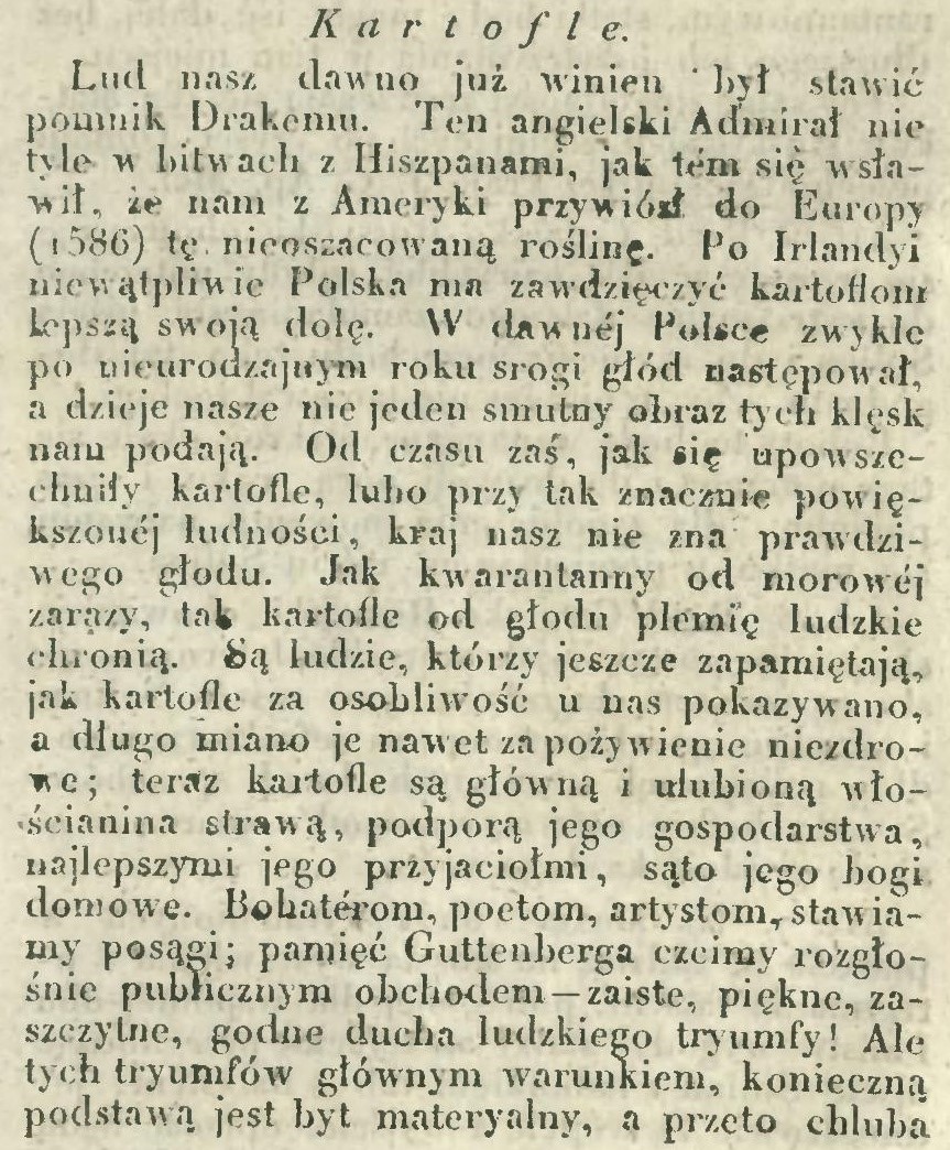 W dawnej Polsce zwykle po nieurodzajnym roku srogi głód następował, a dzieje nasze niejeden smutny obraz tych klęsk nam podają. Od czasu zaś jak upowszechniły się kartofle, kraj nasz nie zna prawdziwego głodu. Jak kwarantanny od morowej zarazy, tak kartofle od głodu plemię ludzkie chronią. Są ludzie, którzy jeszcze pamiętają, jak kartofle za osobliwość u nas pokazywano, a długo miano je za pożywienie niezdrowe; teraz kartofle są główną i ulubioną włościańską strawą, podporą jego gospodarstwa, najlepszymi jego przyjaciółmi, są to jego bogi domowe.