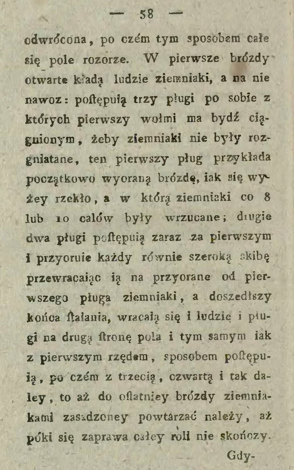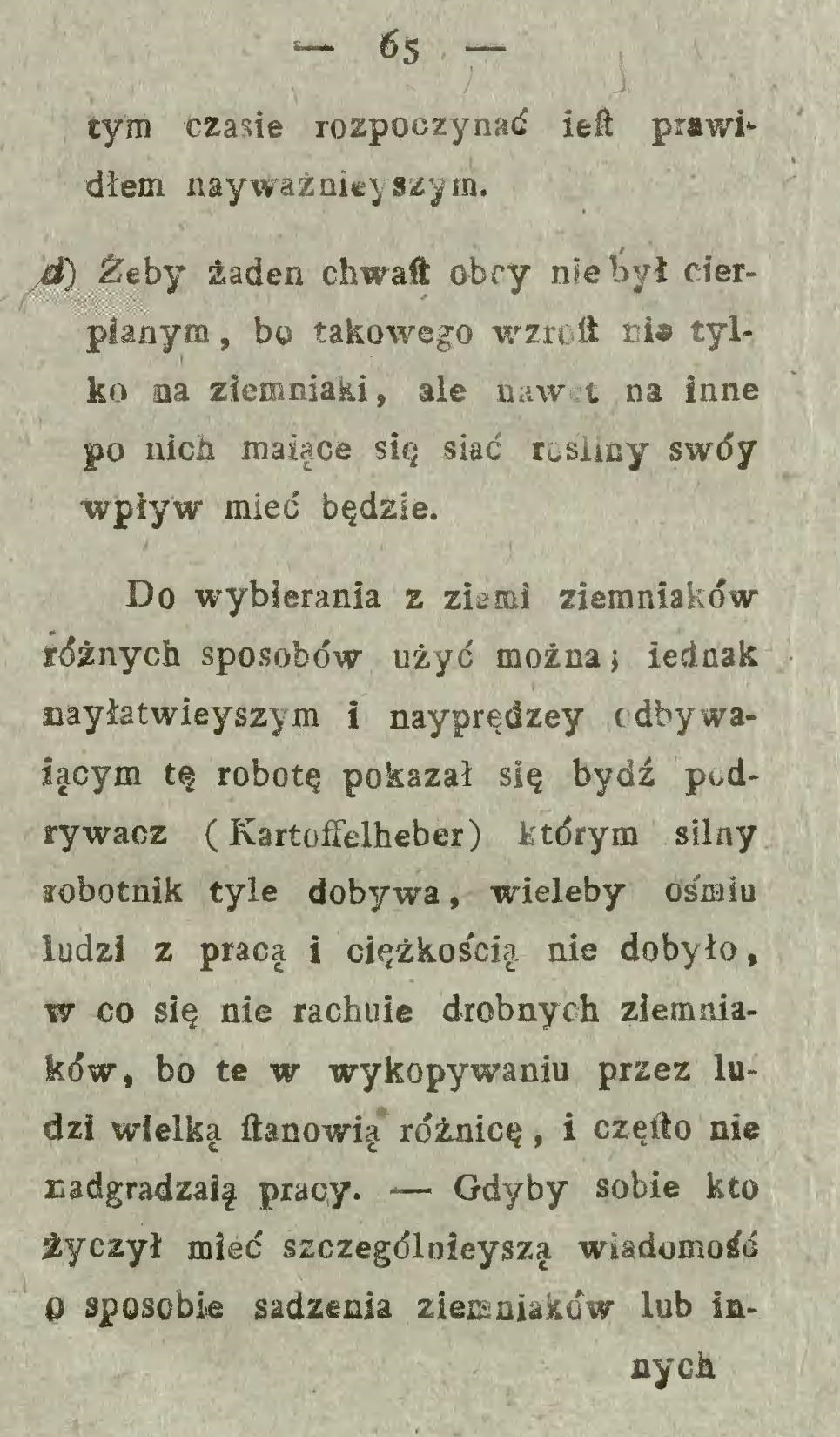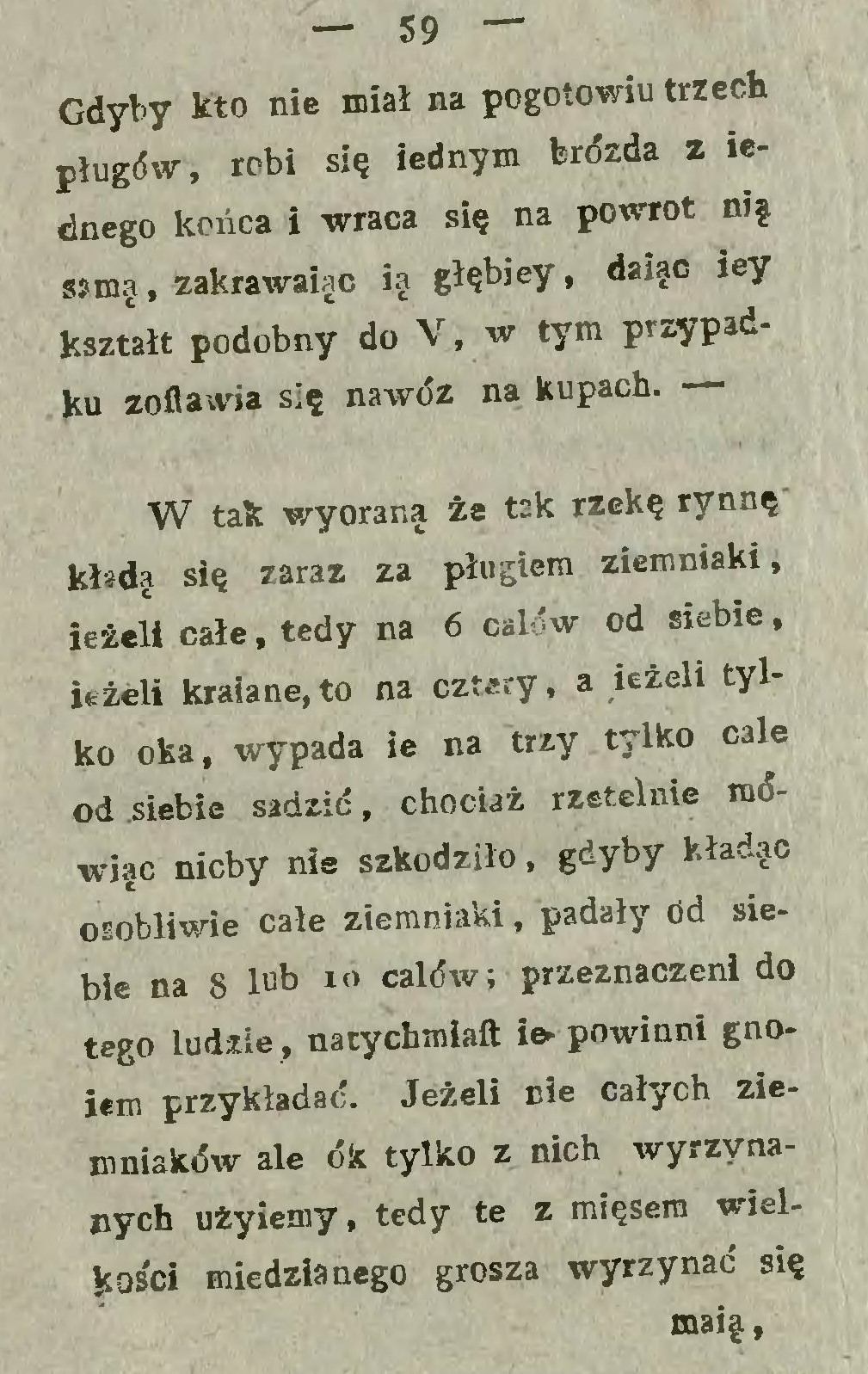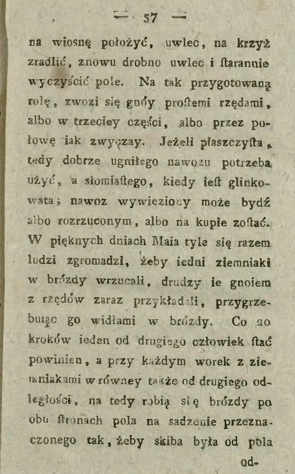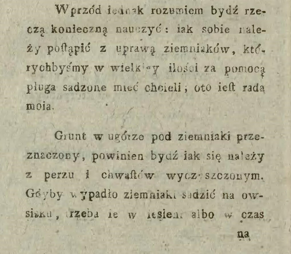 Najlżejszy sposób jest ten, gdy kartofle za pługiem w bruzdy się kładą i następującą skibą przykrywają (… ) Atoli sadzenie za pługiem wymaga pewnej uwagi, gdyż kartofle w takiej odległości kłaść się powinny w jakiej krzaki na przyszłość stać muszą.
