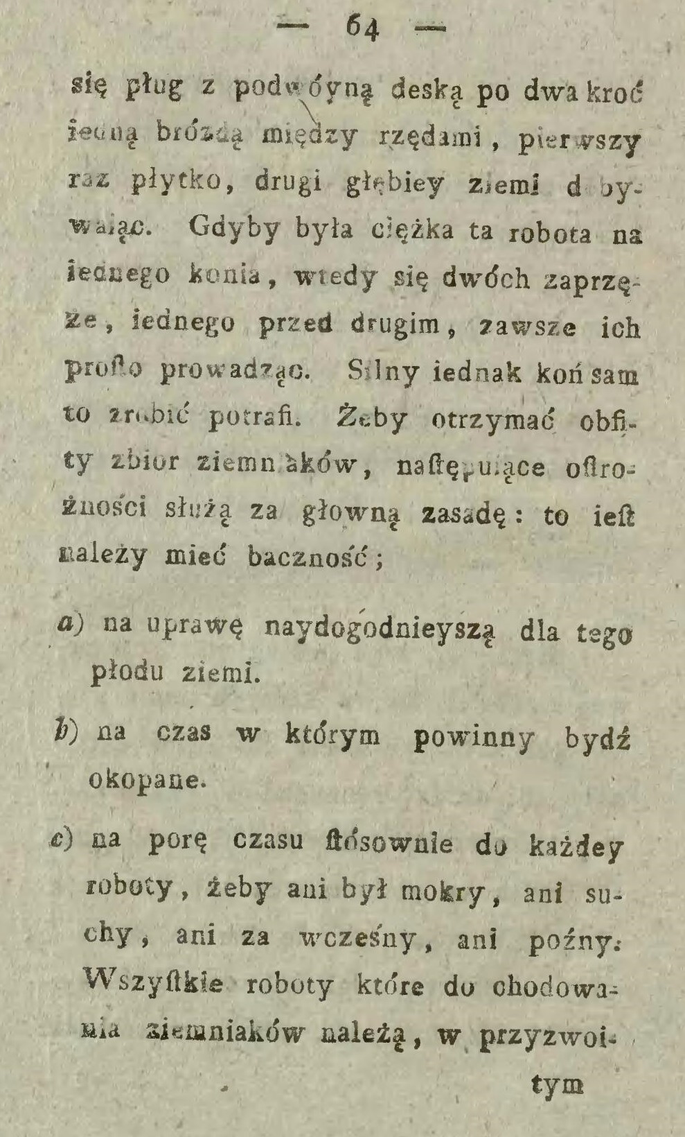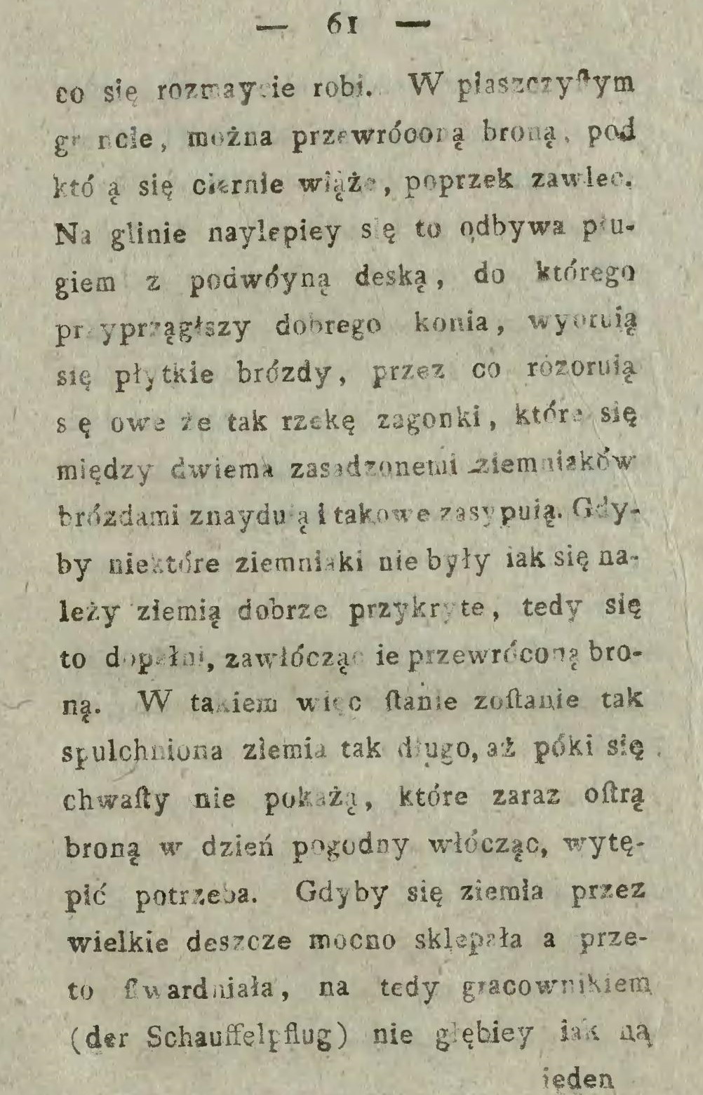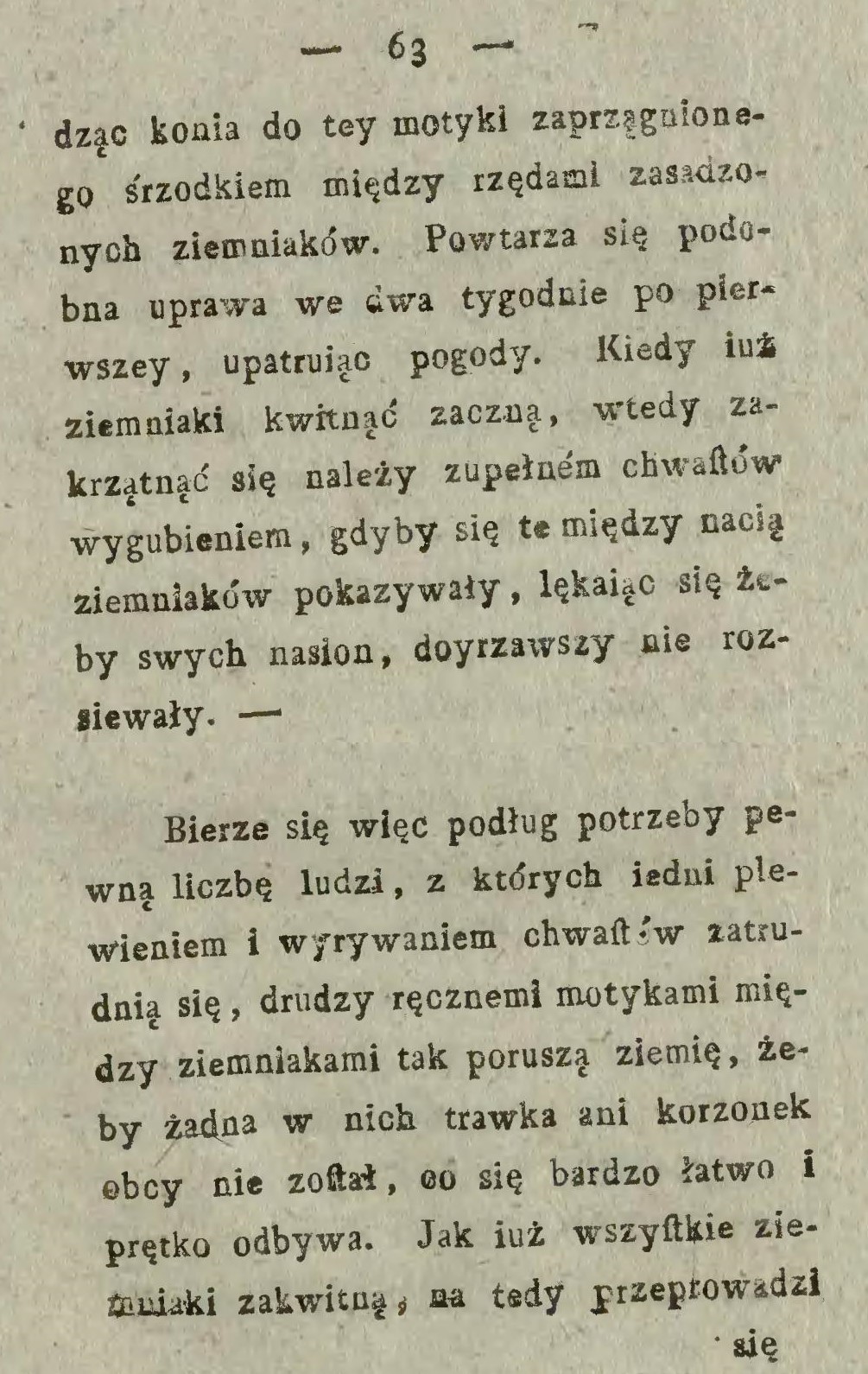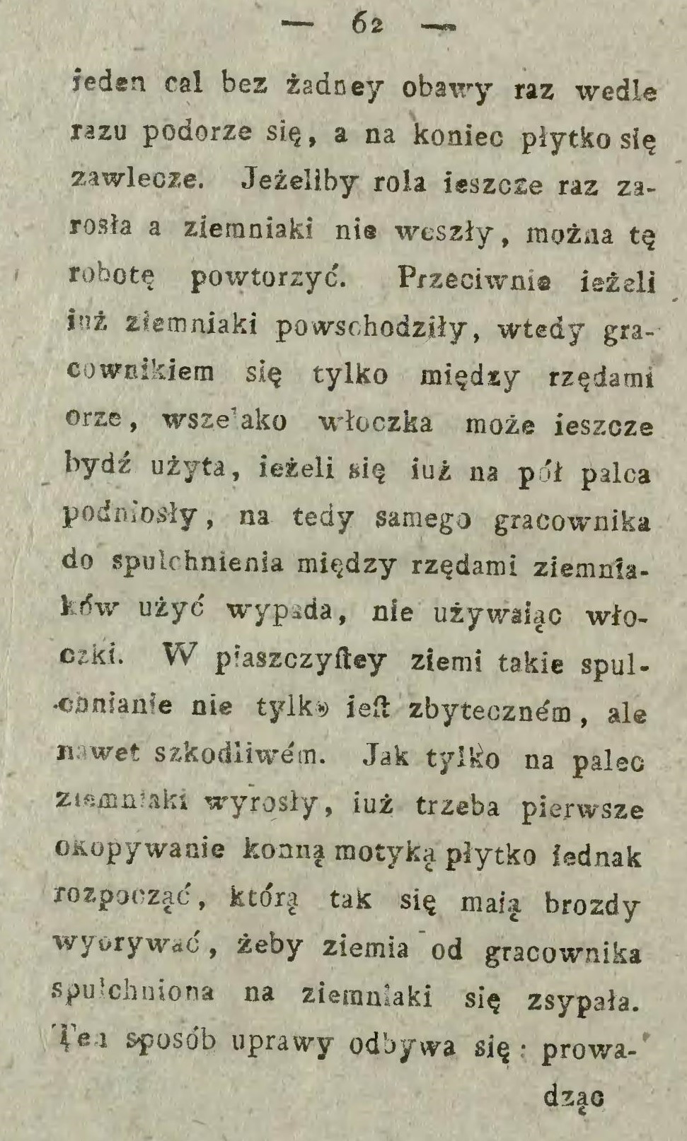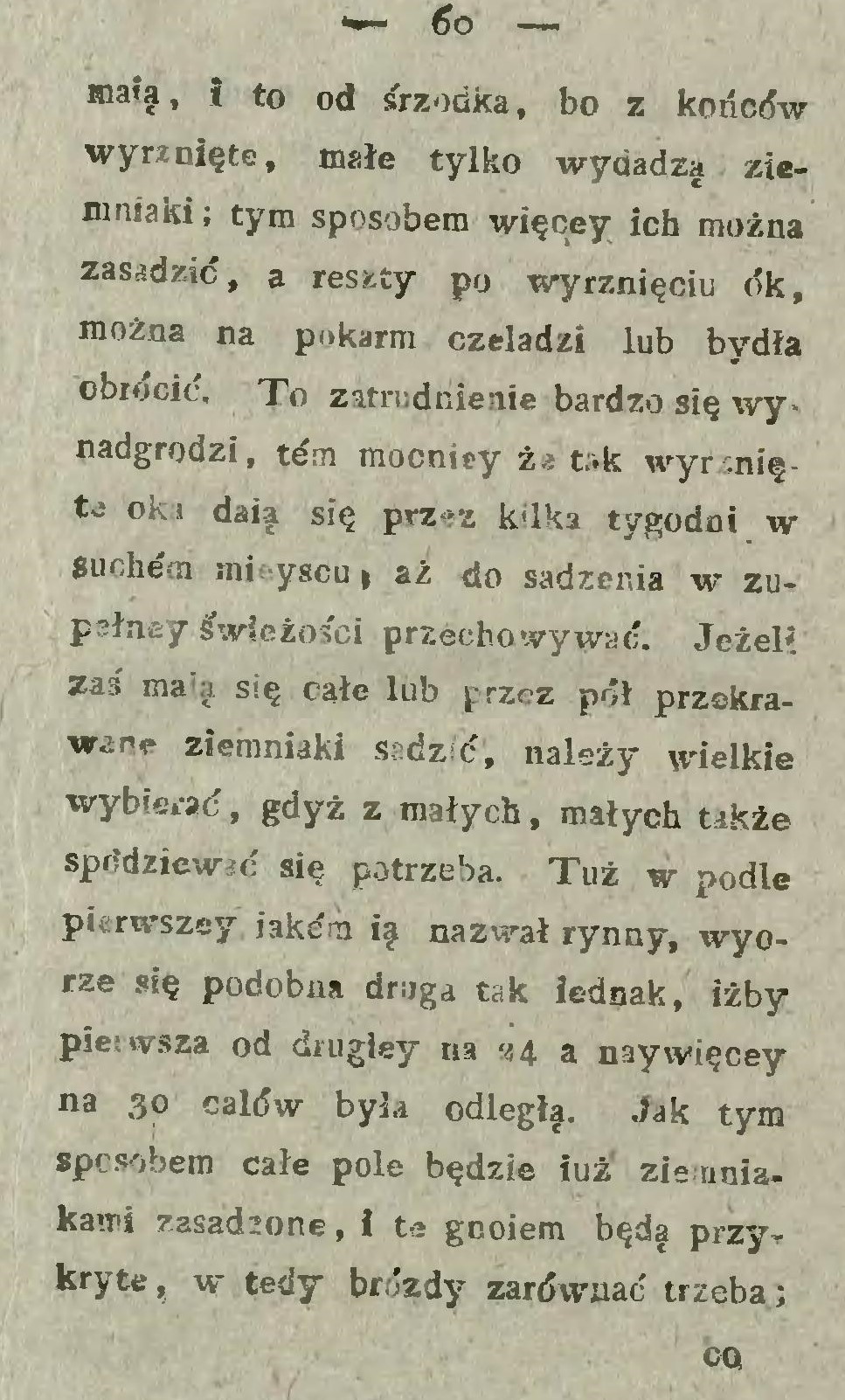 Najlżejszy sposób jest ten, gdy kartofle za pługiem w bruzdy się kładą i następującą skibą przykrywają (… ) Atoli sadzenie za pługiem wymaga pewnej uwagi, gdyż kartofle w takiej odległości kłaść się powinny w jakiej krzaki na przyszłość stać muszą.