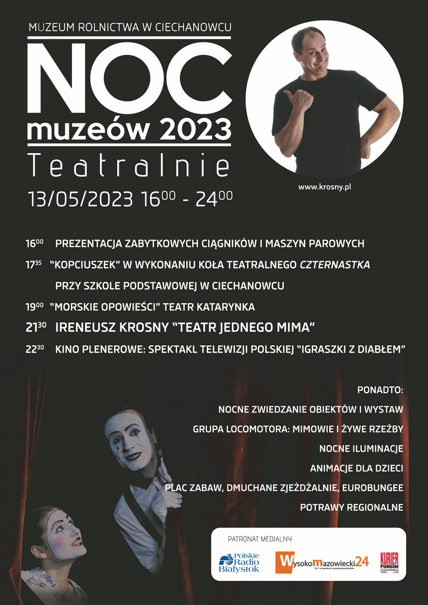 Już w tę sobotę, 13 maja 2023 r., od godziny 16:00 do 24:00 deski naszego skansenu będą gościć znakomitych artystów świata Teatru.