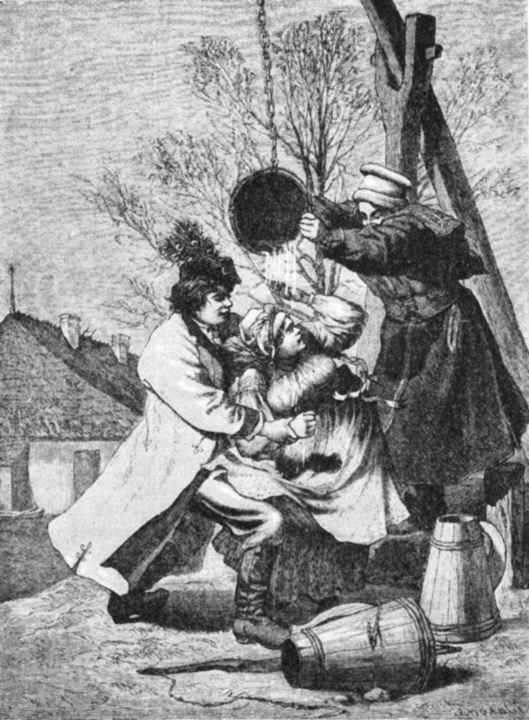 Parobcy zaś po wsiach łapali dziewki, złapaną wlekli do stawu lub rzeki i tam, wziąwszy za ręce i nogi, wrzucali, albo też włożywszy w koryto przy studni, leli wodą póty, póki się im podobało.’’