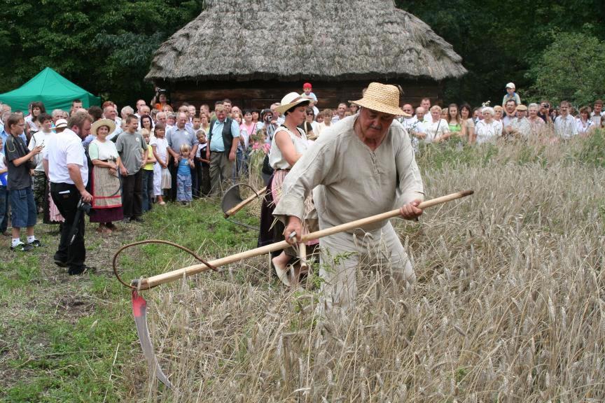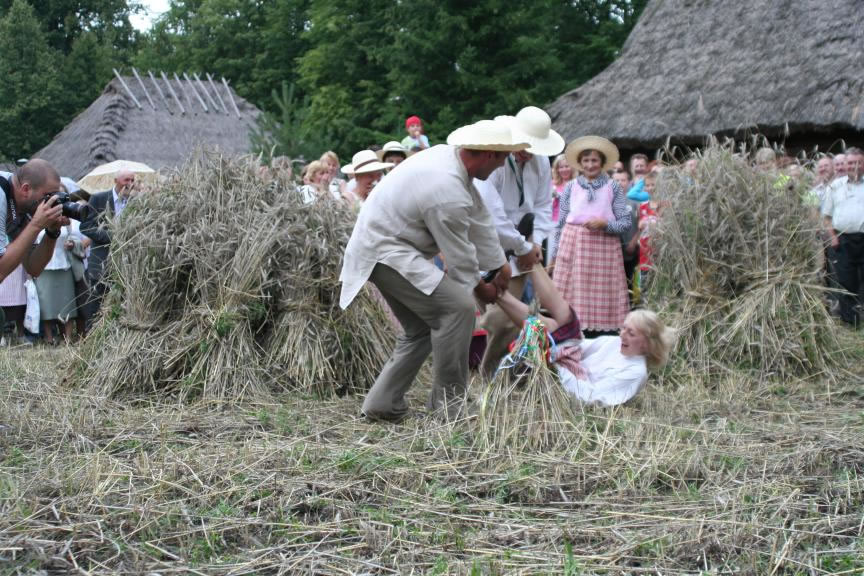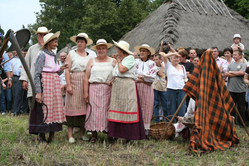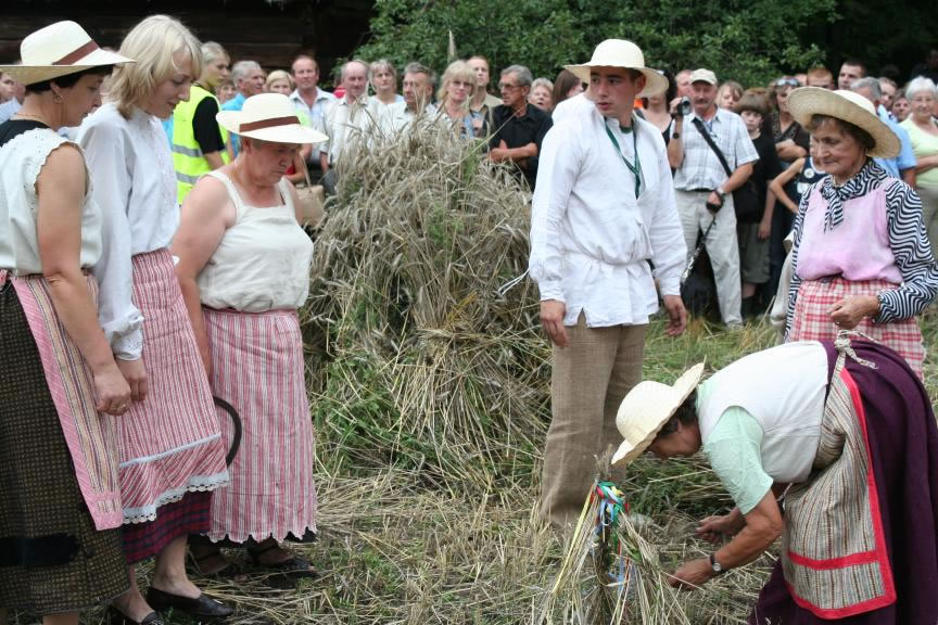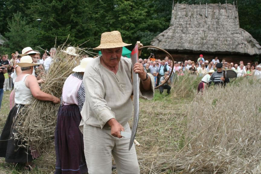 Głównym punktem programu Święta Chleba był tradycyjny obrzęd żniwny - pokaz tradycyjnych prac polowych i obyczajów z tym związanych. Zaprezentowano żęcie zboża sierpem, koszenie kosą, podbieranie zboża za koszącym, wiązanie snopów, zestawianie zboża. Następnie obrzęd ustawienia i zdobienia „przepiórki". Kulminacyjną częścią tego pokazu było „oboranie przepiórki". Polegało ono na tym, że żniwiarze - chłopcy przeciągali po rżysku, trzymając za nogi żniwiarkę - dziewczynę, obiegając na około ustawioną „przepiórkę". Po uformowaniu korowodu żniwiarze z pola przeszli do dworu - gdzie na ganku powitani zostali przez gospodarzy dożynek - Dorotę Łapiak - Dyrektora Muzeum Rolnictwa i Bogdana Zielińskiego - Starostę Wysokomazowieckiego - przekazując bochen chleba i wieniec dożynkowy.