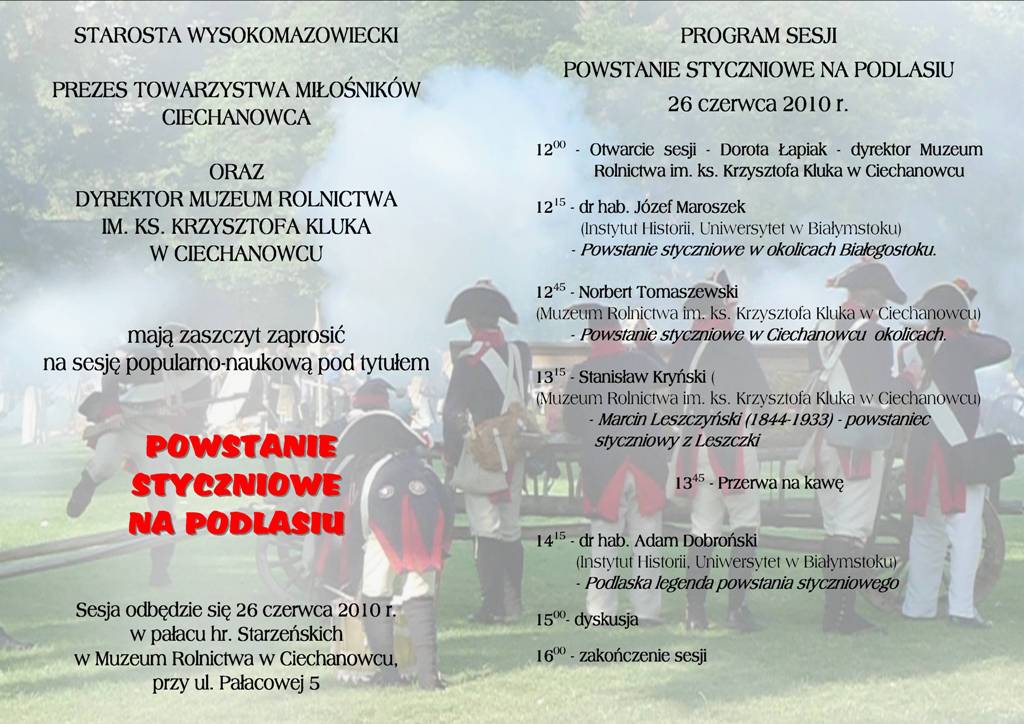 Muzeum Rolnictwa im. ks. Krzysztofa Kluka w Ciechanowcu wraz ze współorganizatorami - Towarzystwem Miłośników Ciechanowca i Starostwem Powiatowym w Wysokiem Mazowieckiem po raz szósty przygotowało Zajazd Wysokomazowiecki - imprezę plenerową skierowaną do szerokiego kręgu odbiorców zainteresowanych tradycją i historią regionu. Motywem przewodnim tegorocznej edycji było powstanie styczniowe oraz uczczenie 145. rocznicy śmierci ks. Stanisława Brzóski.