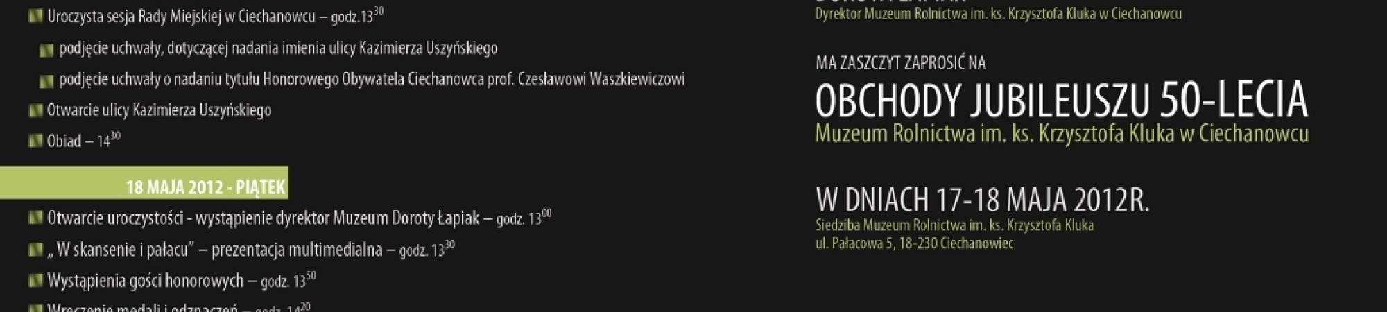 Вы находитесь: Zaproszenie na Główne uroczystości jubileuszowe Muzeum Rolnictwa im. ks. Krzysztofa Kluka w Ciechanowcu 15-17 maja