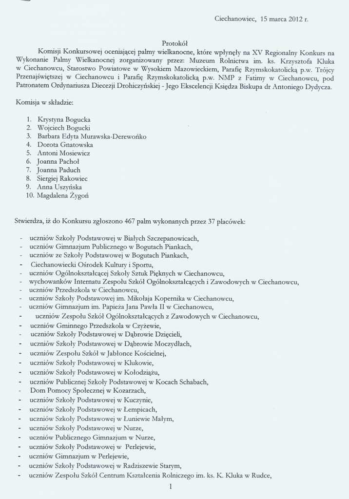 Na Konkurs zgłoszono 467 palm z 37 placówek oświatowo-wychowawczych, w tym 10 od osób indywidualnych. W dniu 15 marca jury dokonało oceny zgłoszonych palm. Uczestnicy Konkursu z palmami będą uczestniczyli 1. kwietnia o godz. 10 w procesji Niedzieli Palmowej w Kościele pw. Trójcy Przenajświętszej w Ciechanowcu. Procesji będzie przewodniczyl