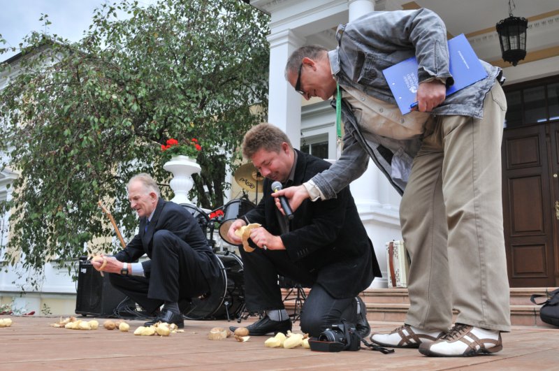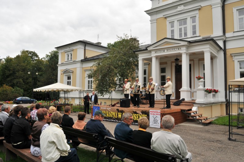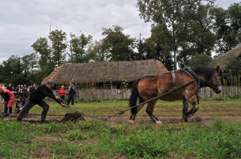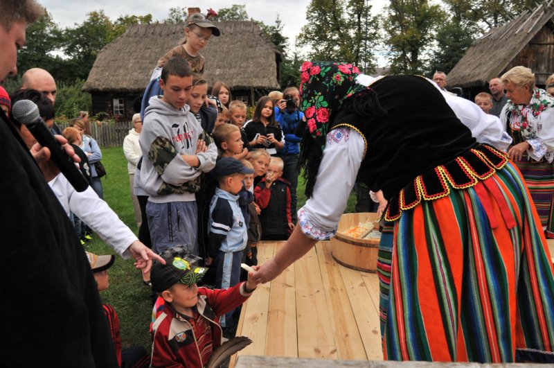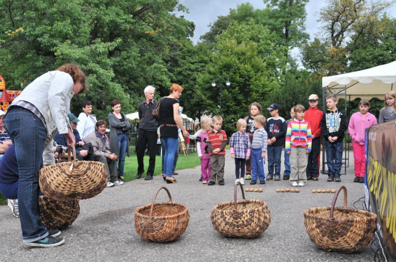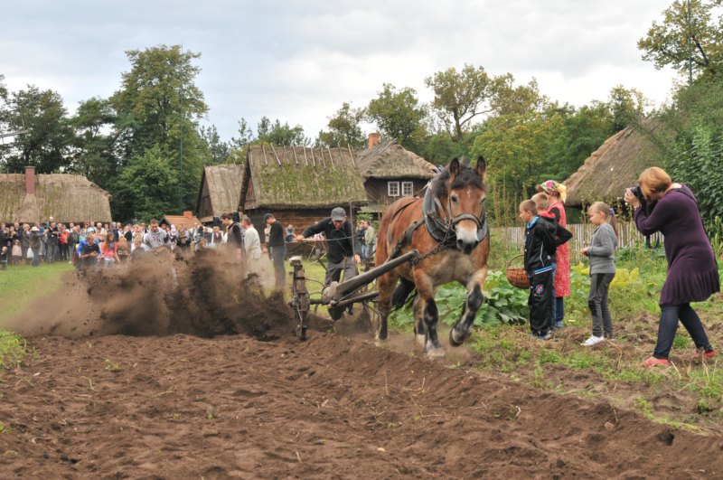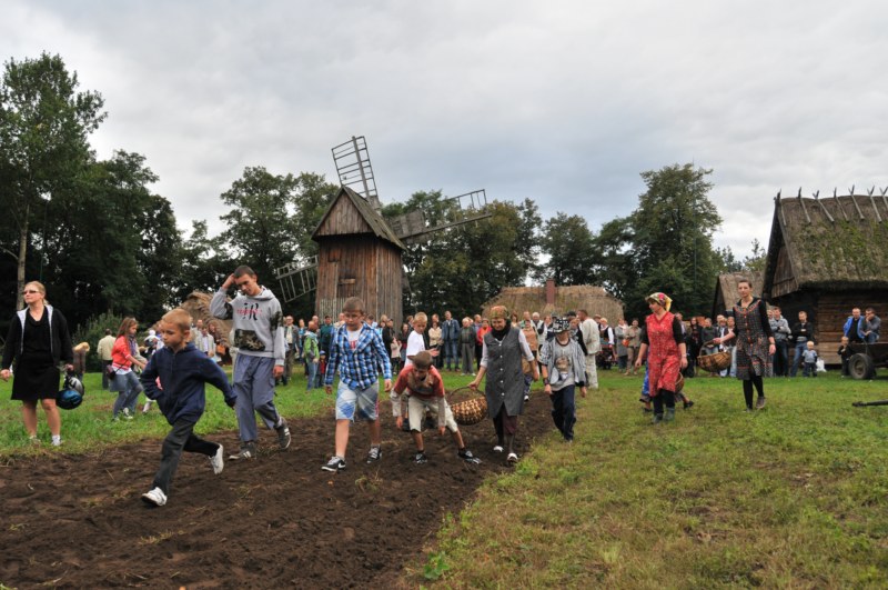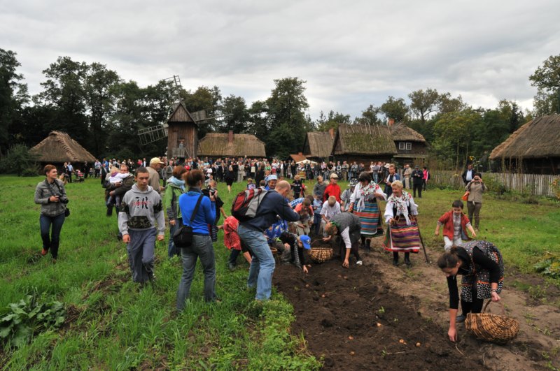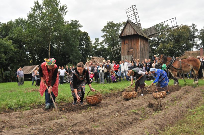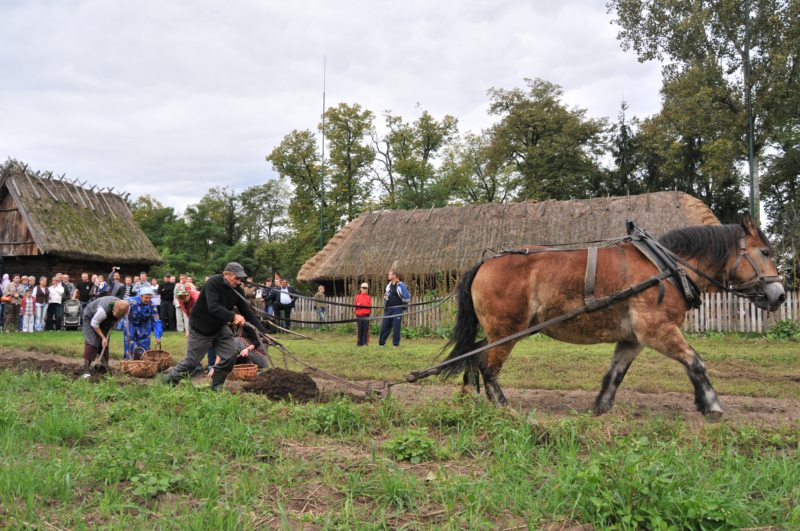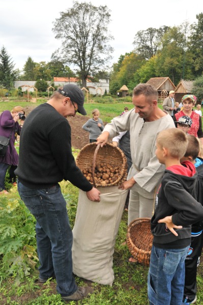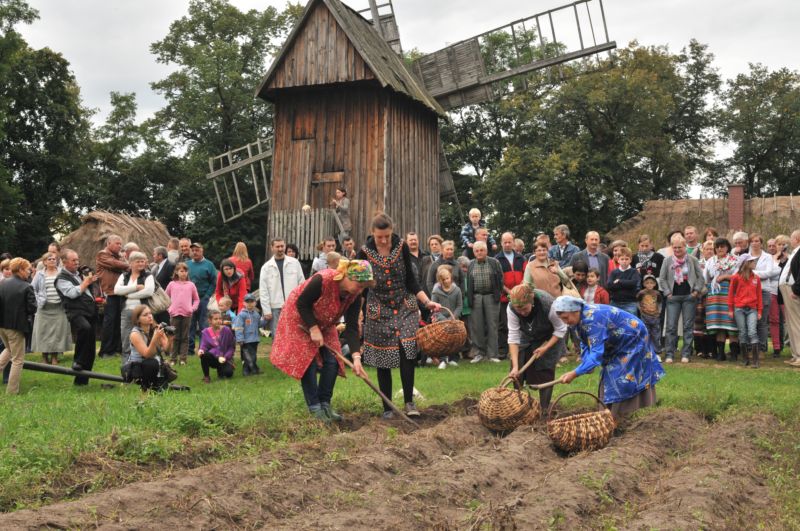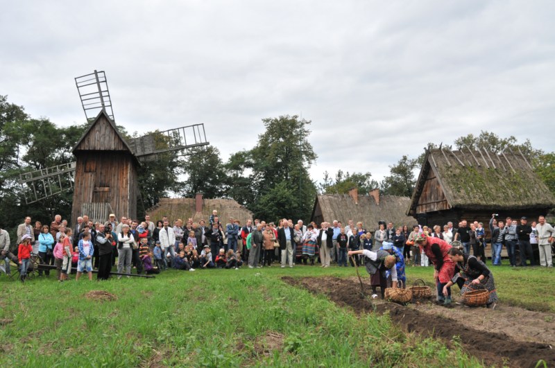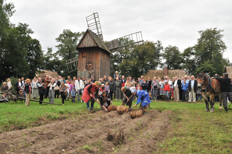 Pokazy tradycyjnych jesiennych prac polowych i gospodarskich, zaprezentowane w wiejskiej scenerii skansenu, przycięgnęły licznych widzów. Na polu obok wiatraka gospodynie ze wsi Białe Szczepanowice wychodząc z motykami pokazały kopanie ziemniaków w sposób tradycyjny. Zaprezentowano też kopanie ziemniaków gwiazdową kopaczką konną oraz zbieranie ziemniaków wyoranych pługiem. Odbyła sie tzw. tłoka - czyli wspólne prace przy zbiorze ziemniaków w ramach pomocy sąsiedzkiej. Wszyscy biorący udział w pokazie zostali poczęstowani ziemniakami upieczonymi w ognisku rozpalonym na tzw. kartoflisku.