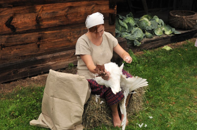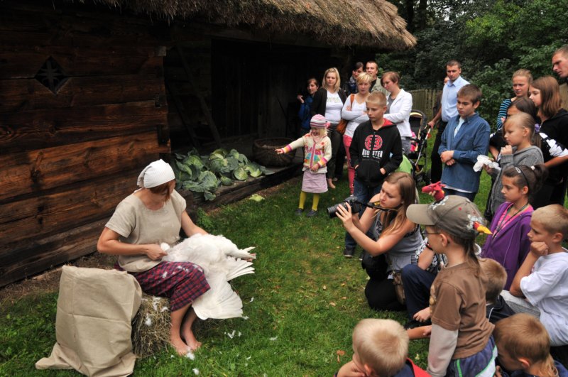 Dużym zainteresowaniem cieszył się pokaz podskubywania gęsi hodowanych w zagrodzie na terenie skansenu. W jednej z zagród odbyła się jesienna strzyża owiec wrzosówek.