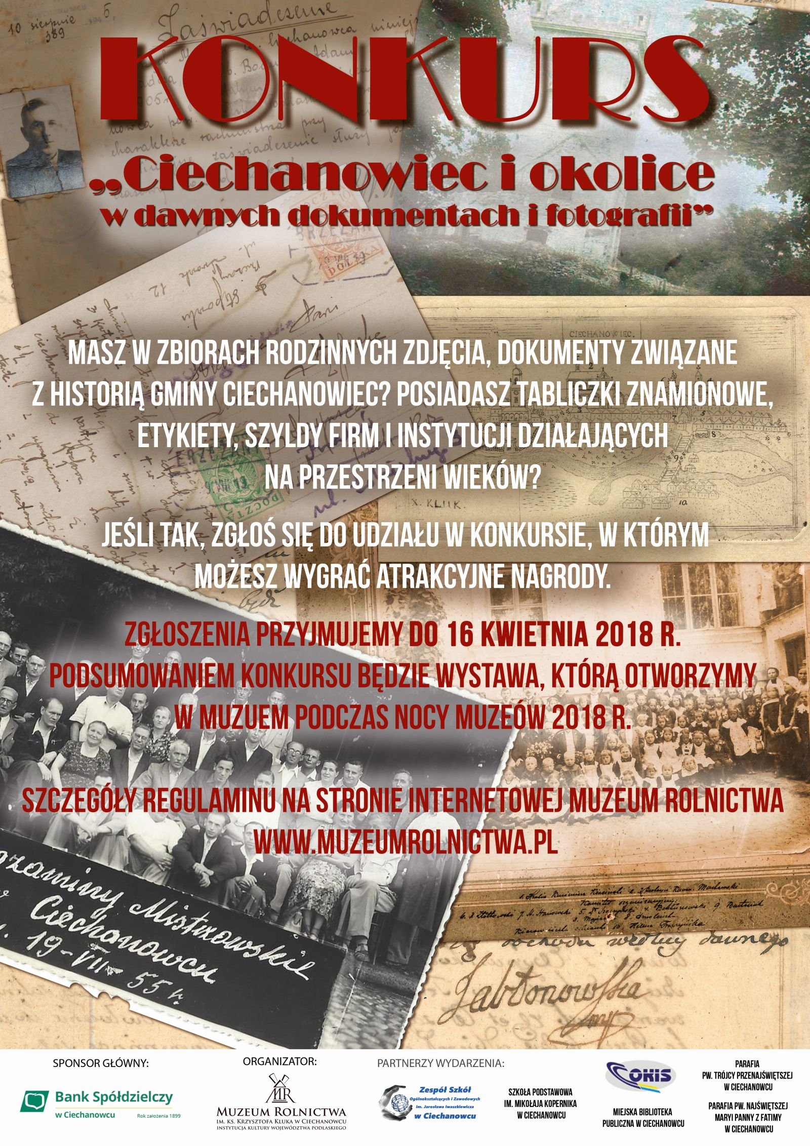 Informujemy, że Muzeum Rolnictwa im. ks. Krzysztofa Kluka w Ciechanowcu przedłuża termin nadsyłania zgłoszeń na konkurs „Ciechanowiec w dawnych dokumentach i fotografii” do 30 czerwca 2018 r. Wyniki konkursu zostaną zaprezentowane 15 lipca 2018 roku, na wystawie podczas „X Zajazdu Wysokomazowieckiego”.